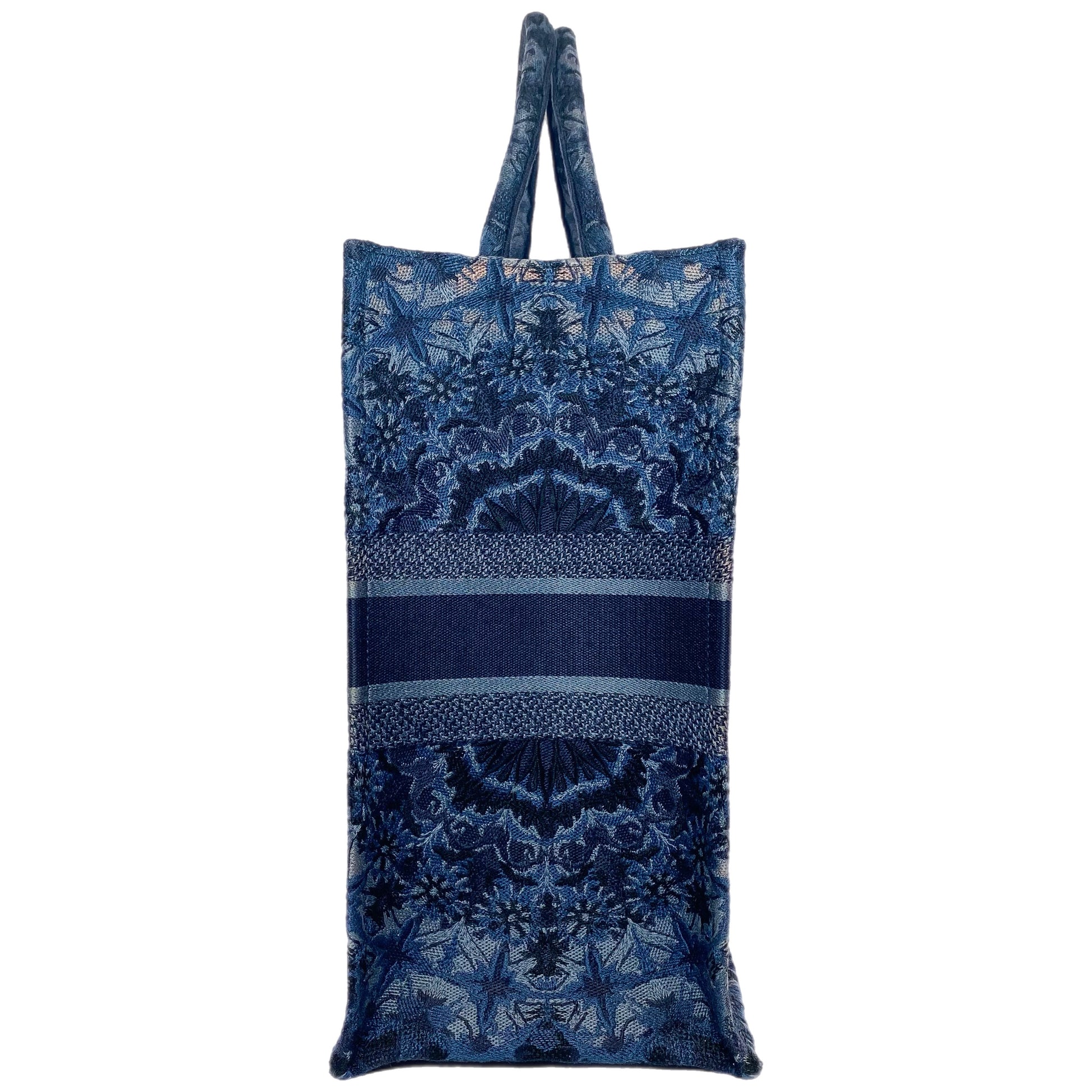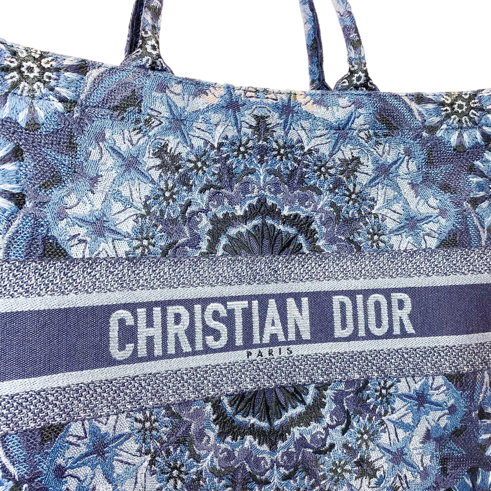 This is a Dior Navy Jacquard Large Book Tote in canvas. This stylish Book Tote features two 6.25-inch handles, floral embroidery, and “CHRISTAN DIOR” written on the front. The top is open to a navy canvas lined interior. This is an amazing tote bag for many occasions!