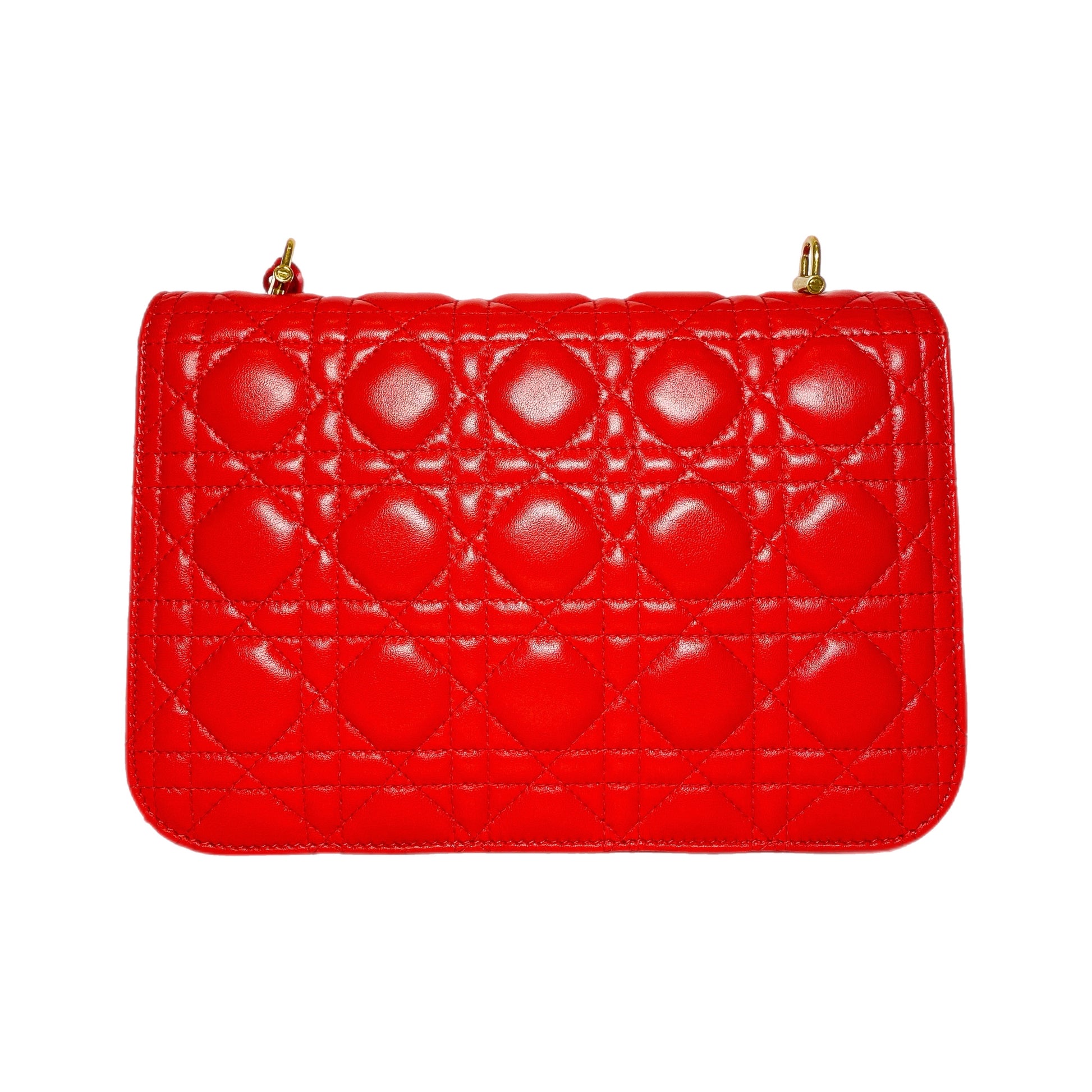 This is a Dior Red Dioraddict Cannage Flap Bag in lambskin leather with gold hardware. This stylish flap bag features a 16-inch adjustable and removable strap and an s-lock closure. The front flap opens to a red suede lined interior that features a patch pocket and a zipper pocket. This is an amazing handbag for any occasion!