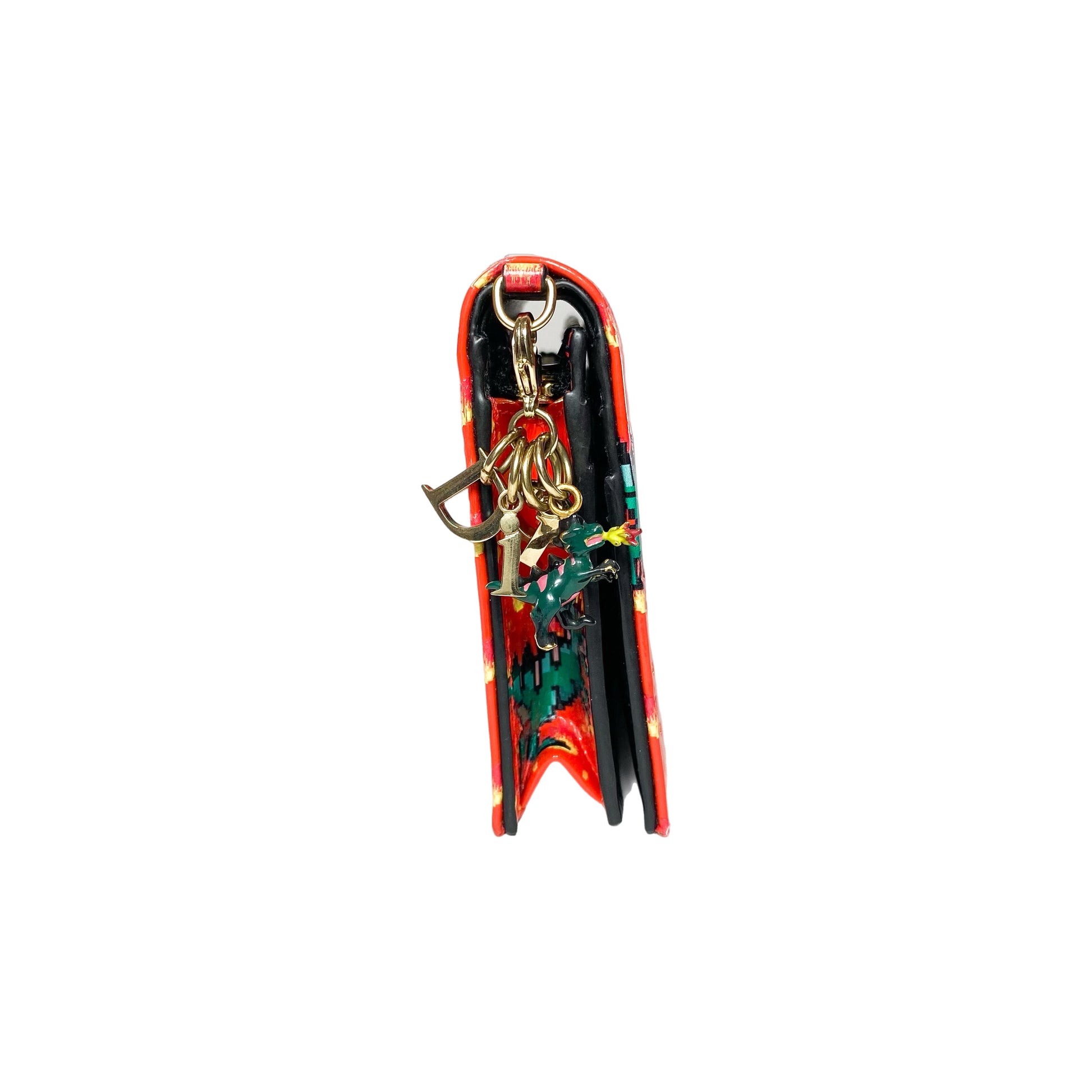 This is a Dior Red and Green Dino Print Wallet in patent leather with gold hardware. This stylish wallet features dinosaur print, hanging charms, and a snap closure. The front flap opens to a black leather lined interior that features card slots and a zipper pocket. This is a fun accessory for everyday use!