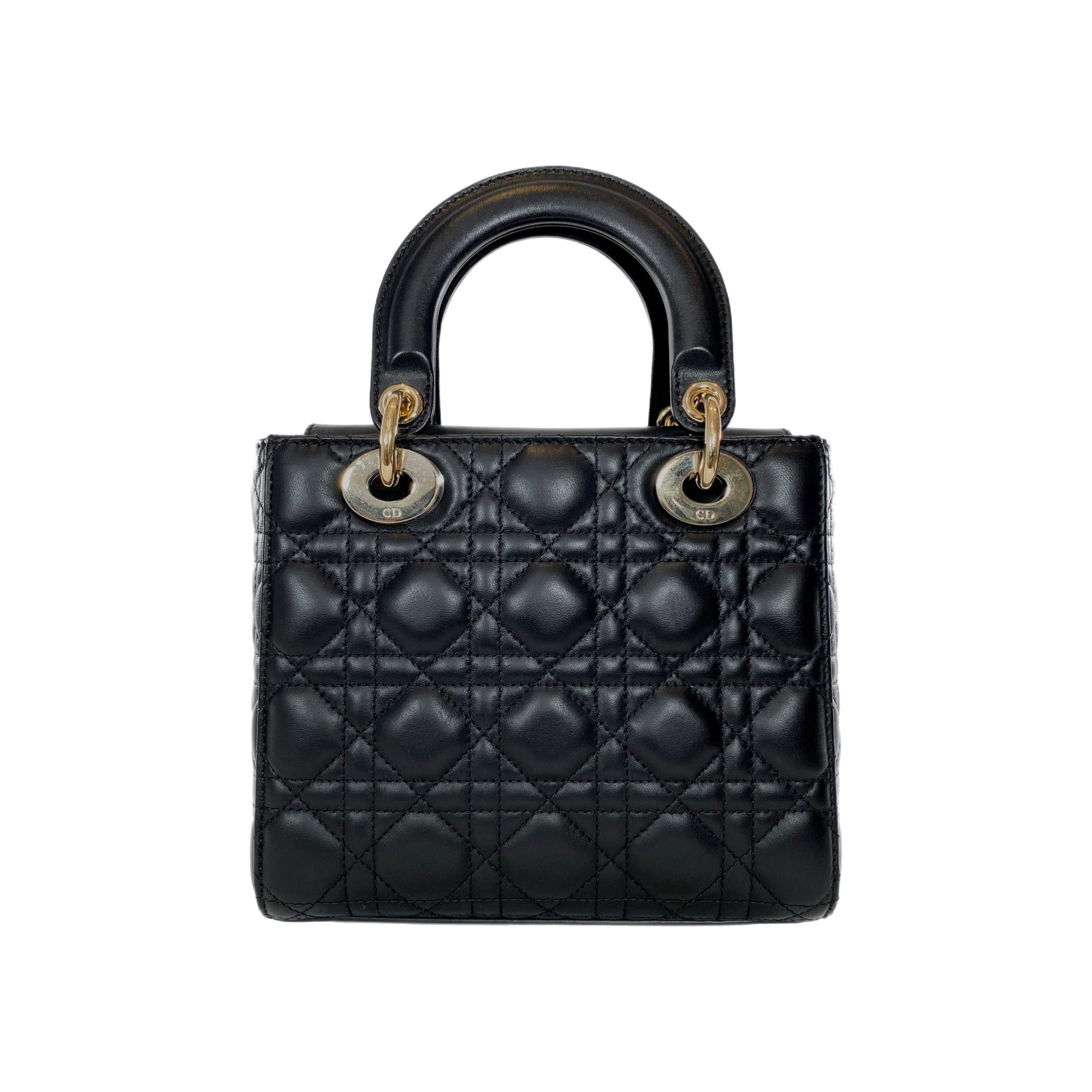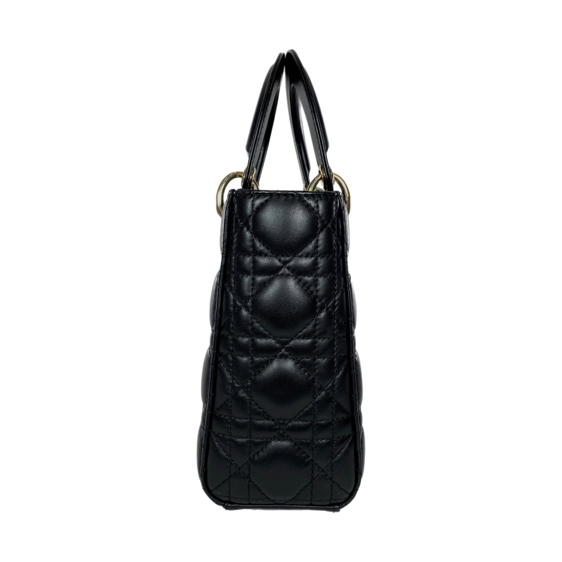 This is a Dior Small Black Lady Dior in lambskin leather with light gold hardware. This stylish bag features a 19-inch black leather removable and adjustable strap, DIOR charms in light gold hardware and a crossover top flap closure. The bag opens to a red fabric lined interior that features a patch pocket and a zipper pocket. This is a chic everyday bag!
