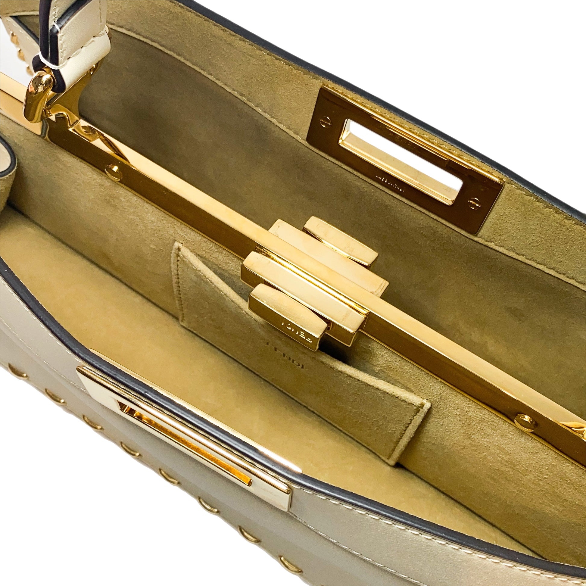This is a Fendi Ivory ISeeU Stretch Peekaboo in calfskin leather with gold hardware. This chic Peekaboo features a 4.25-inch top handle. Two turn lock closures open to two main compartments that feature a patch pocket and a zipper pocket. This wonderful handbag for any occasion!
