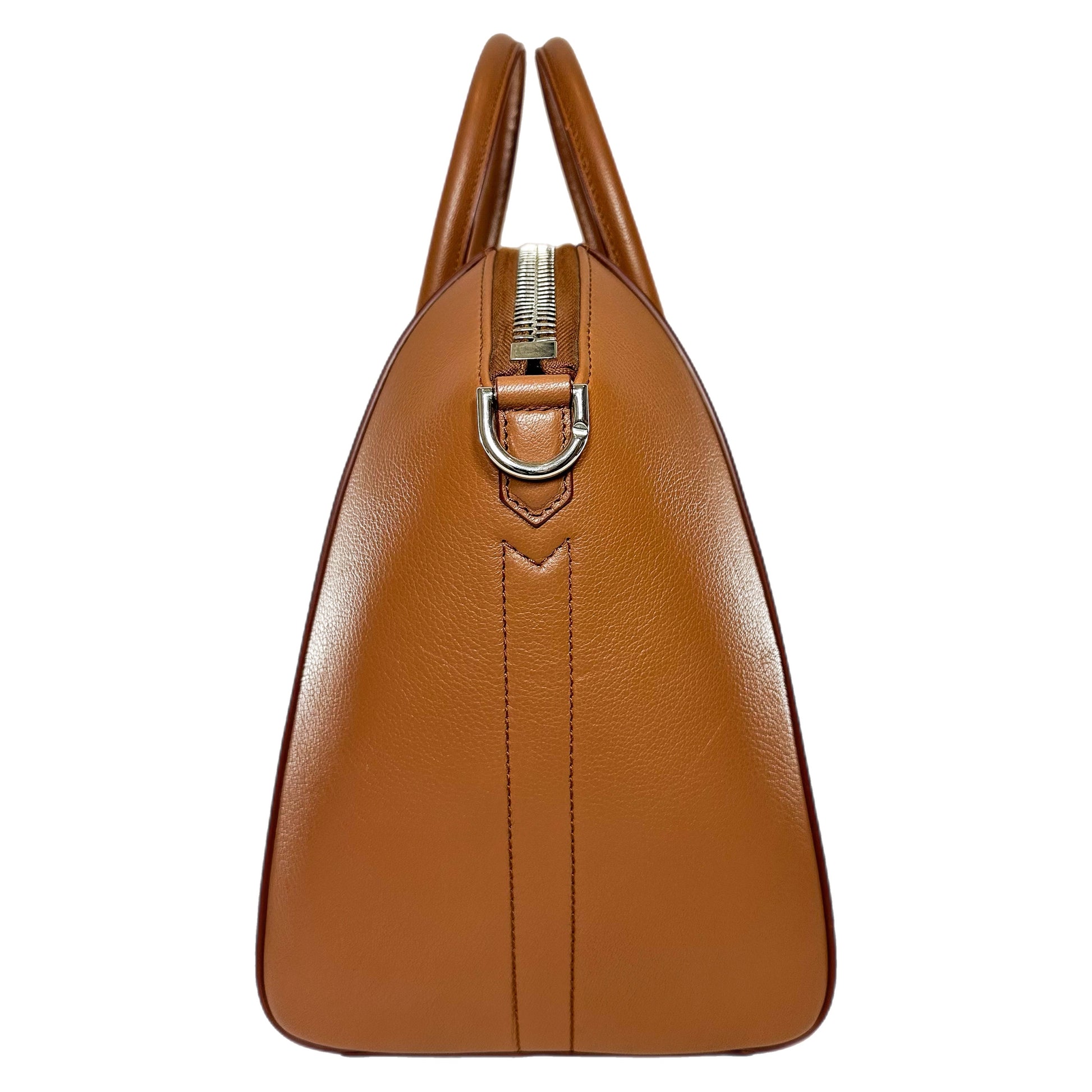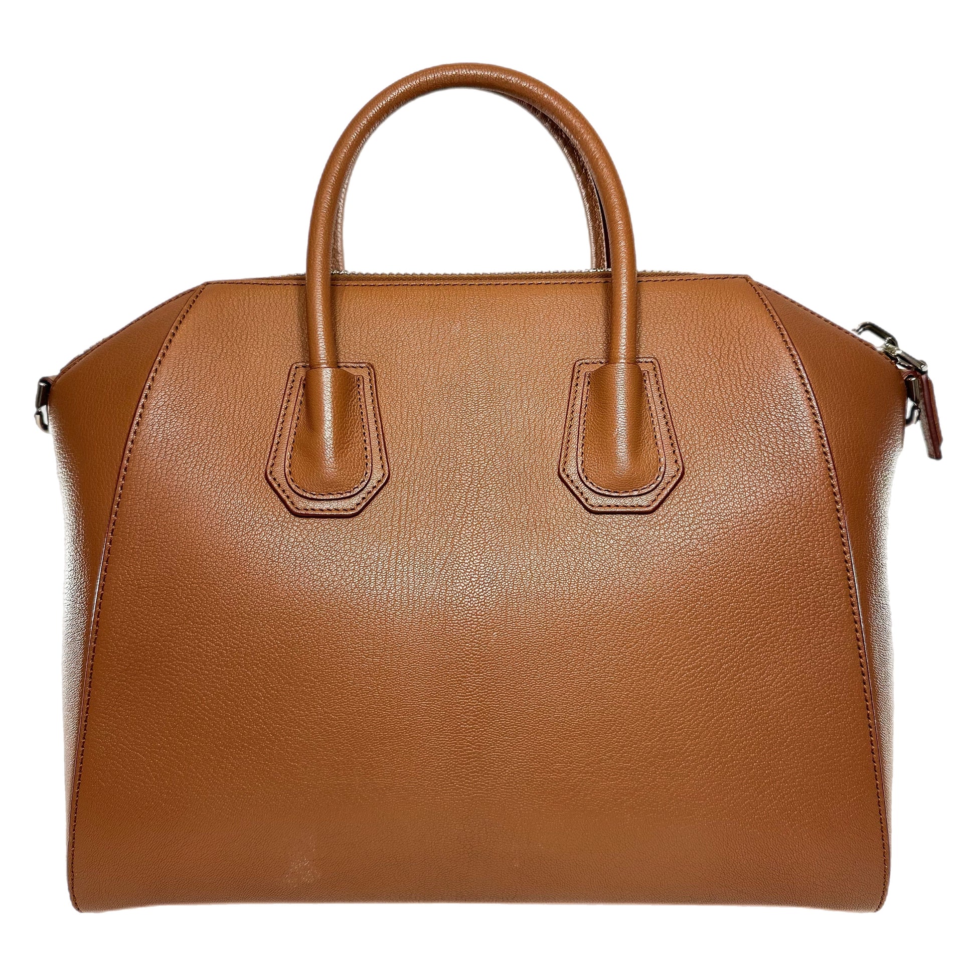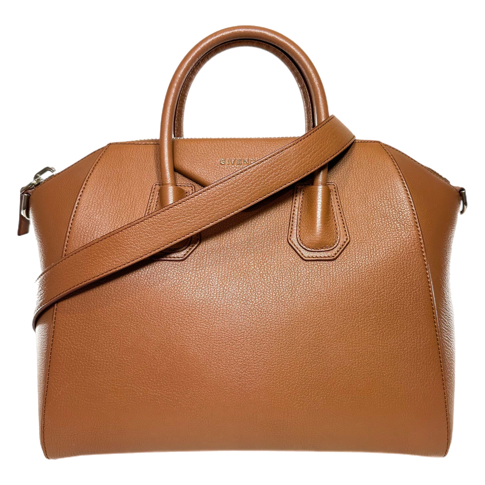 This is a Givenchy Camel Antigona in goatskin leather with silver hardware. This chic handbag features two 3-inch top handles, an 11-inch detachable strap, and a top zipper closure. The interior is lined in beige canvas and features two patch pockets and a zipper pocket. This is an amazing everyday handbag!