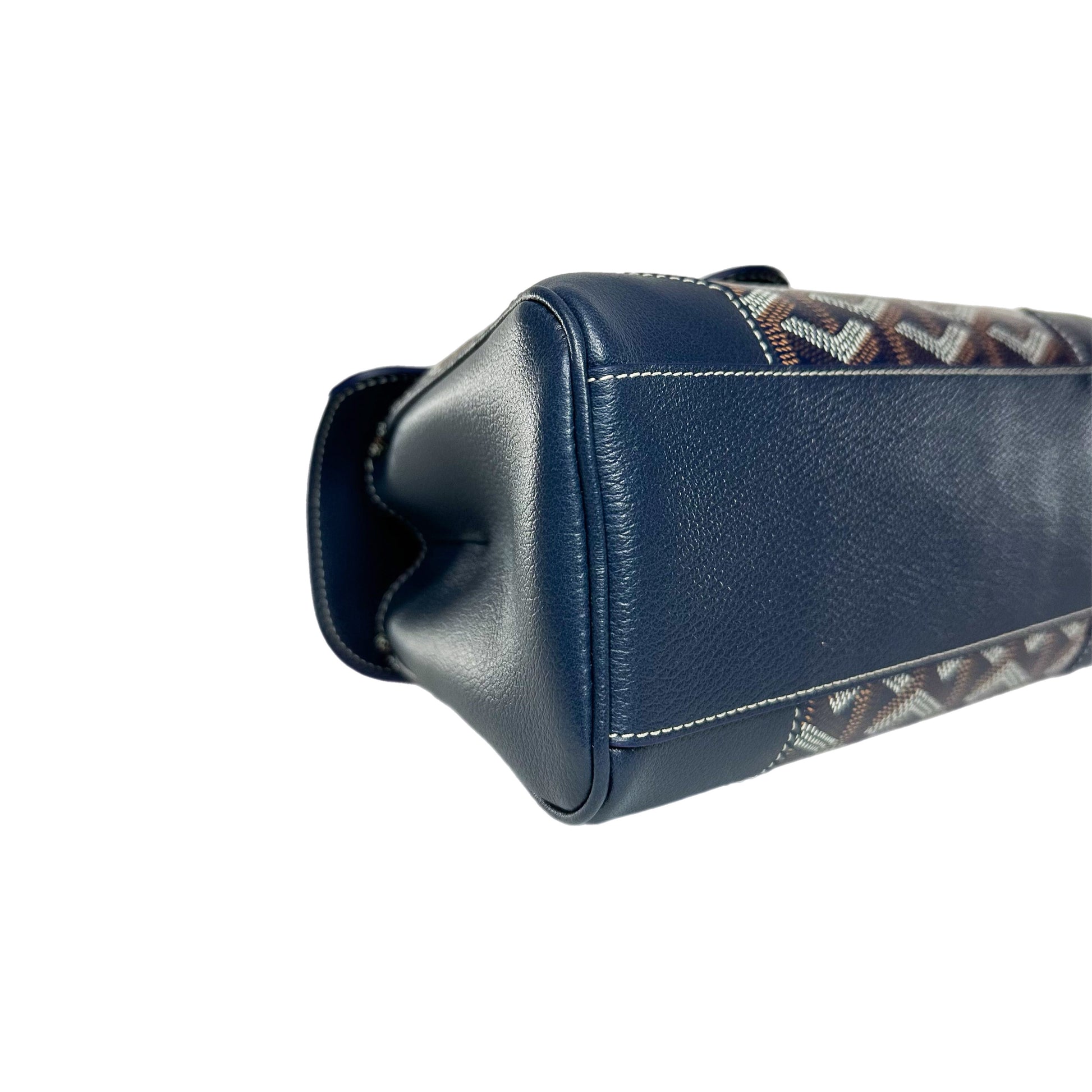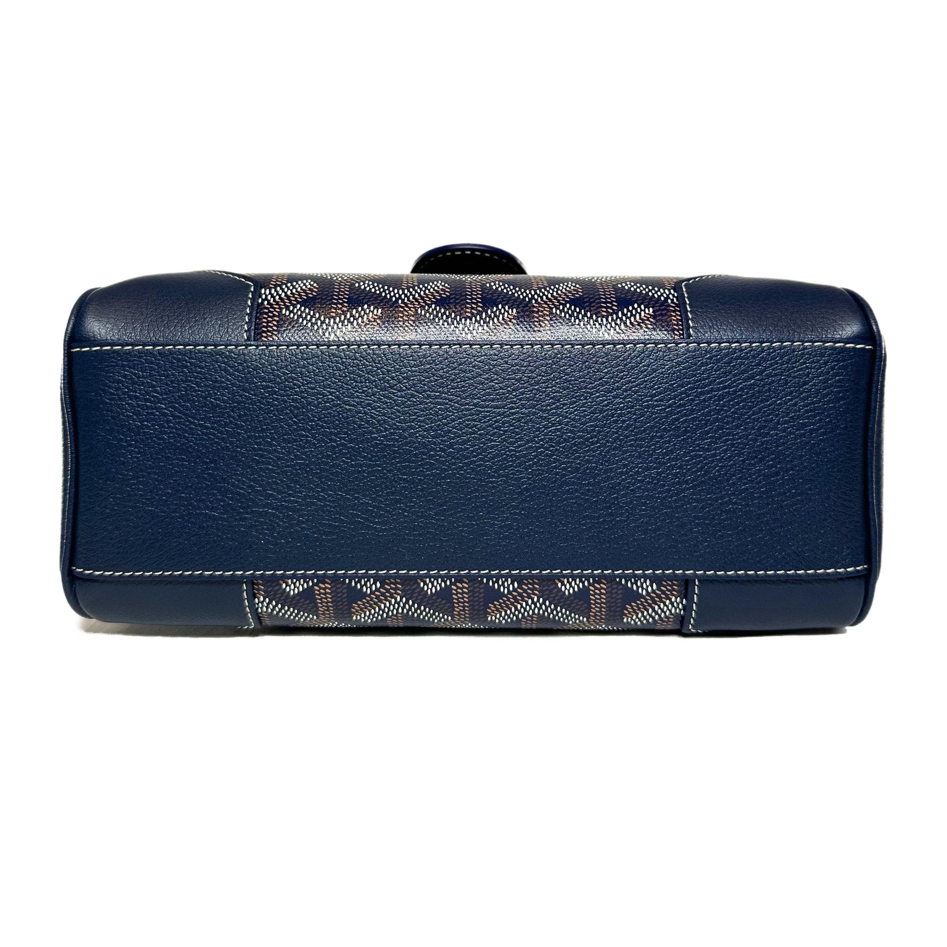 This is a Goyard Navy Mini Saigon in Goyardine canvas and Taurillon leather with silver hardware. This chic bag features a wooden top handle, two wooden panels with silver detailing, a 20-inch removable and adjustable strap and a cross-over leather flap. The flap opens to a yellow leather interior that features a patch pocket. This beautiful handbag is perfect for any occasion!