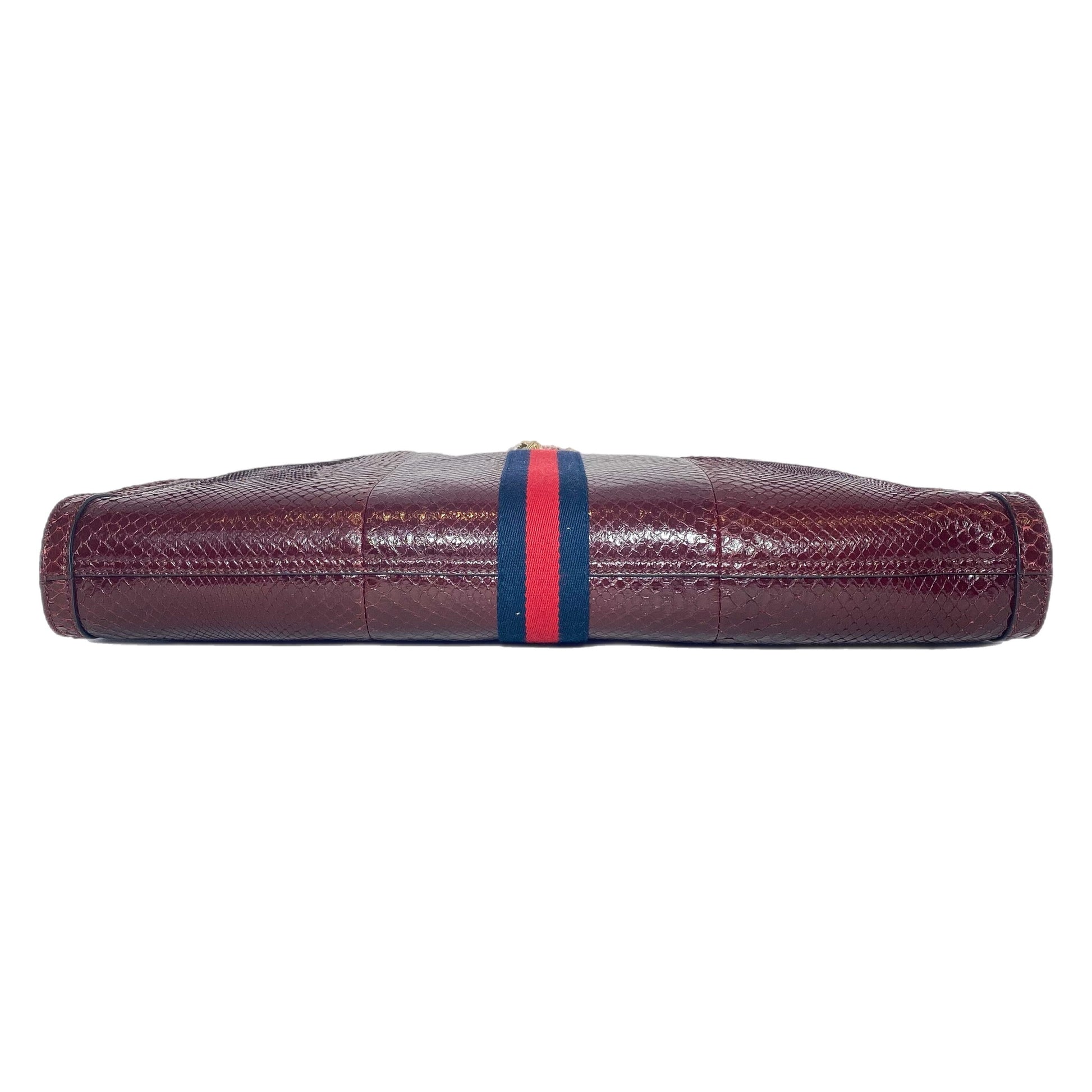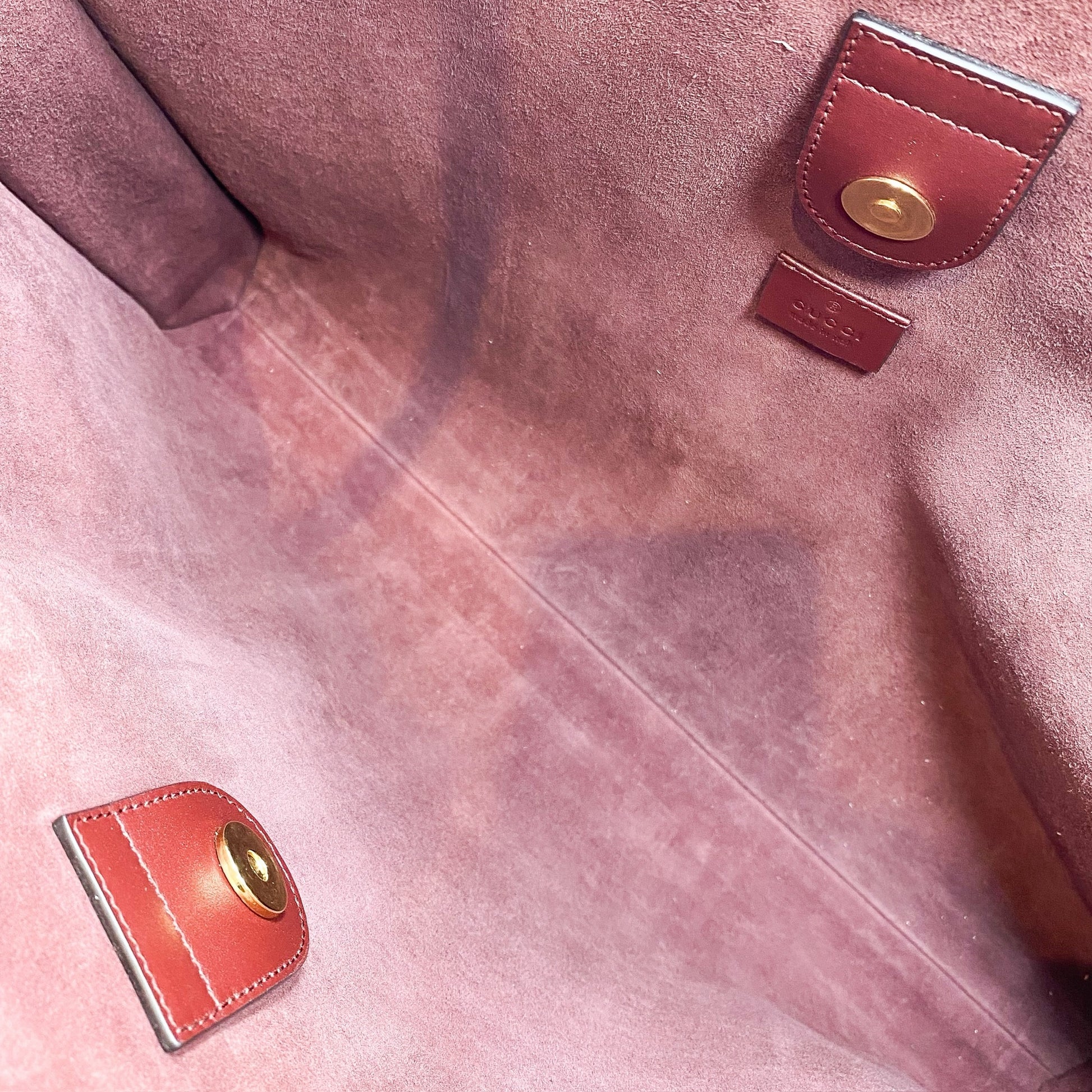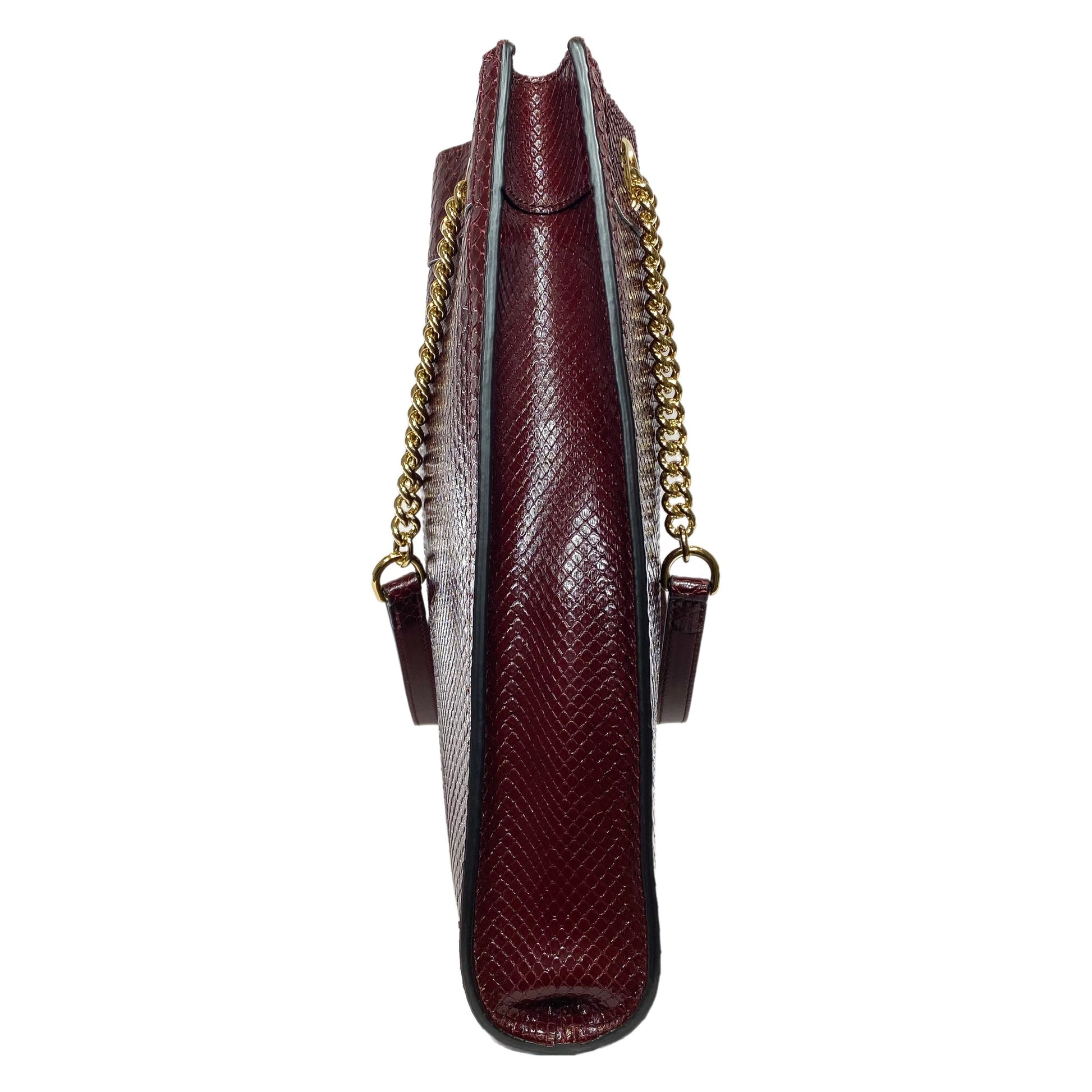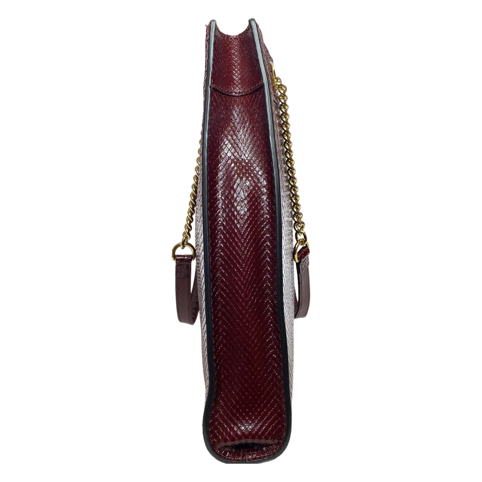 This is a Gucci Burgundy Rajah Tote Bag in python skin with gold hardware. This chic tote bag features two 10-inch straps and an embellished tiger head. The top is open to a spacious burgundy suede lined interior. This is a stellar Fall tote bag!