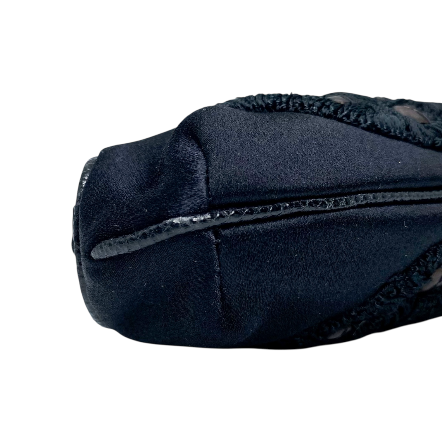 This bag is a vintage Gucci by Tom Ford Satin Tassel Bag in black satin with silver hardware. Detailed with crochet accents, a braided handle, and python trim for a touch of luxury.
