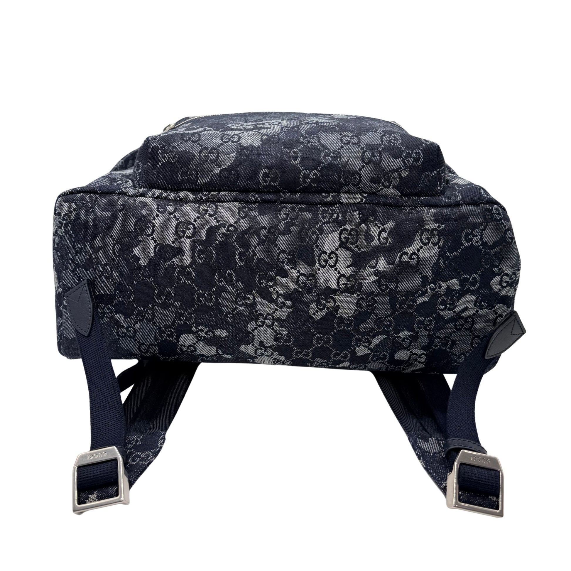This Gucci Canvas backpack is made in a blue camo motif, featuring the “GG” monogram throughout, a front zip pocket, and a spacious zip-around main compartment. This piece blends everyday function with a modern, street-style edge!