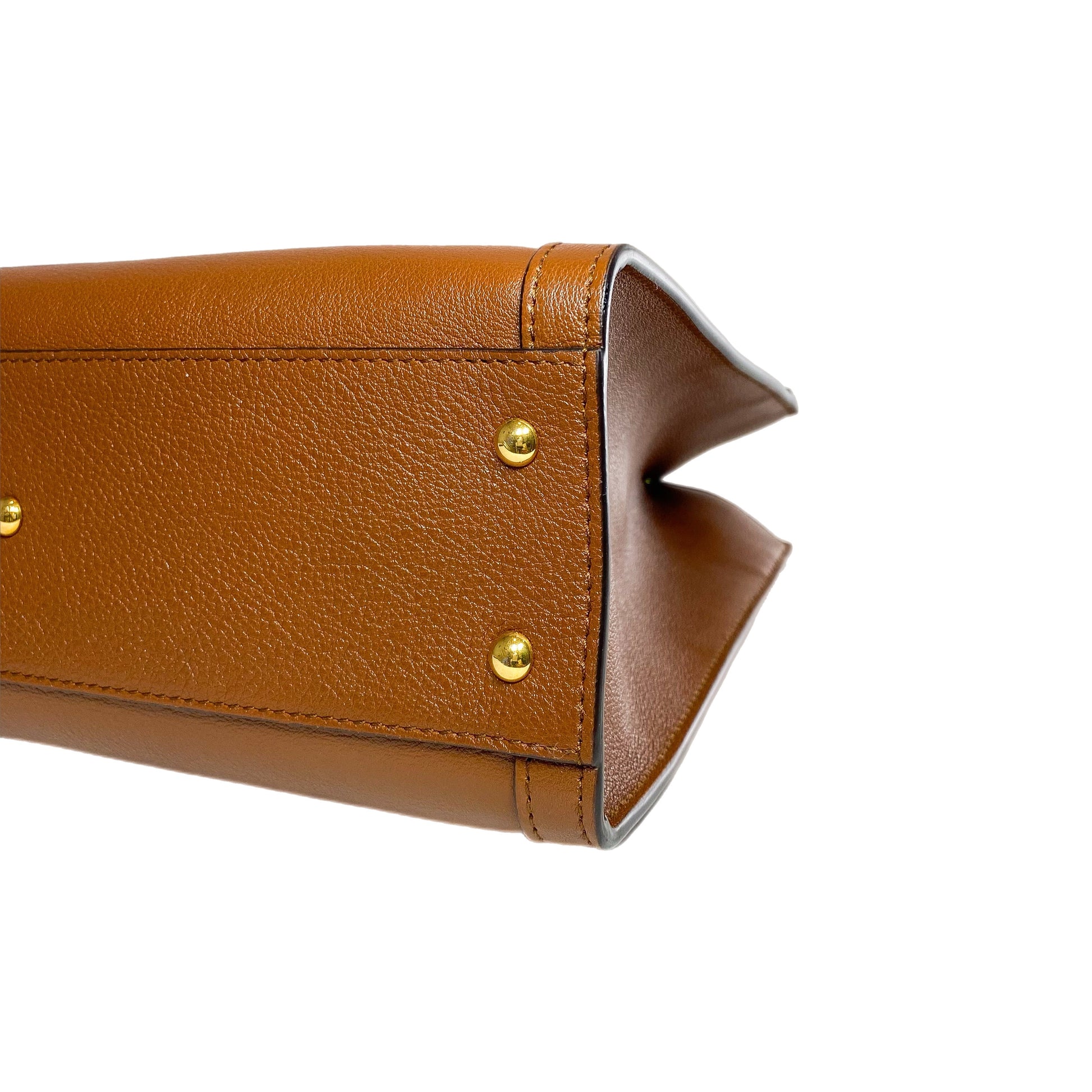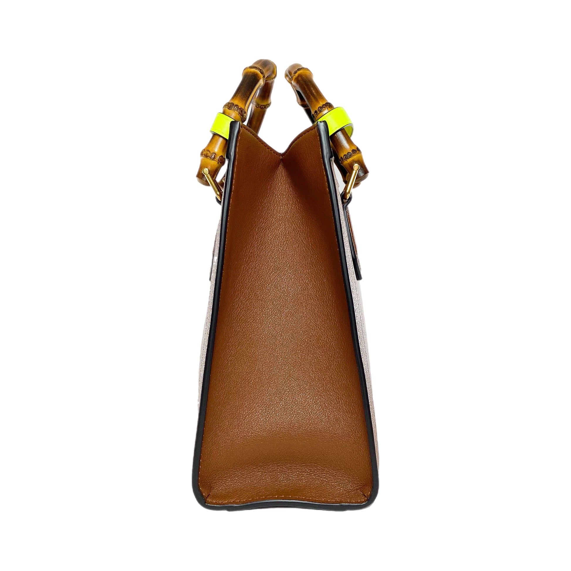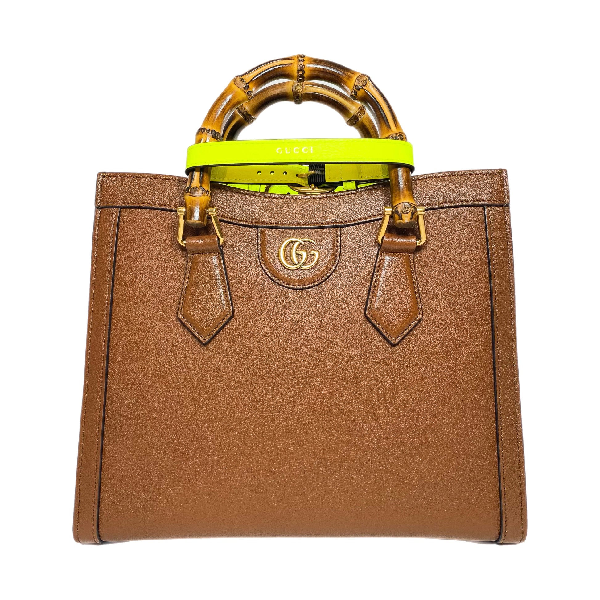 This is a Gucci Diana Brown Bamboo Tote Bag in leather with gold hardware. This stylish tote bag features two 3-inch handles, a 21.5-inch adjustable and detachable strap, and a Gucci “GG” on the front. The interior is lined in beige microfiber that features a patch pocket. This is a wonderful tote bag for any occasion!