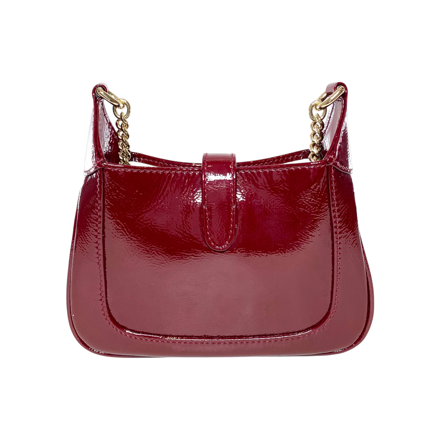 This is a Gucci Rosso Ancora Mini Jackie Notte in patent leather with gold hardware. This stylish handbag features a 21-inch strap and a hook closure. The interior is lined in ivory leather. This is a stellar handbag for any occasion!