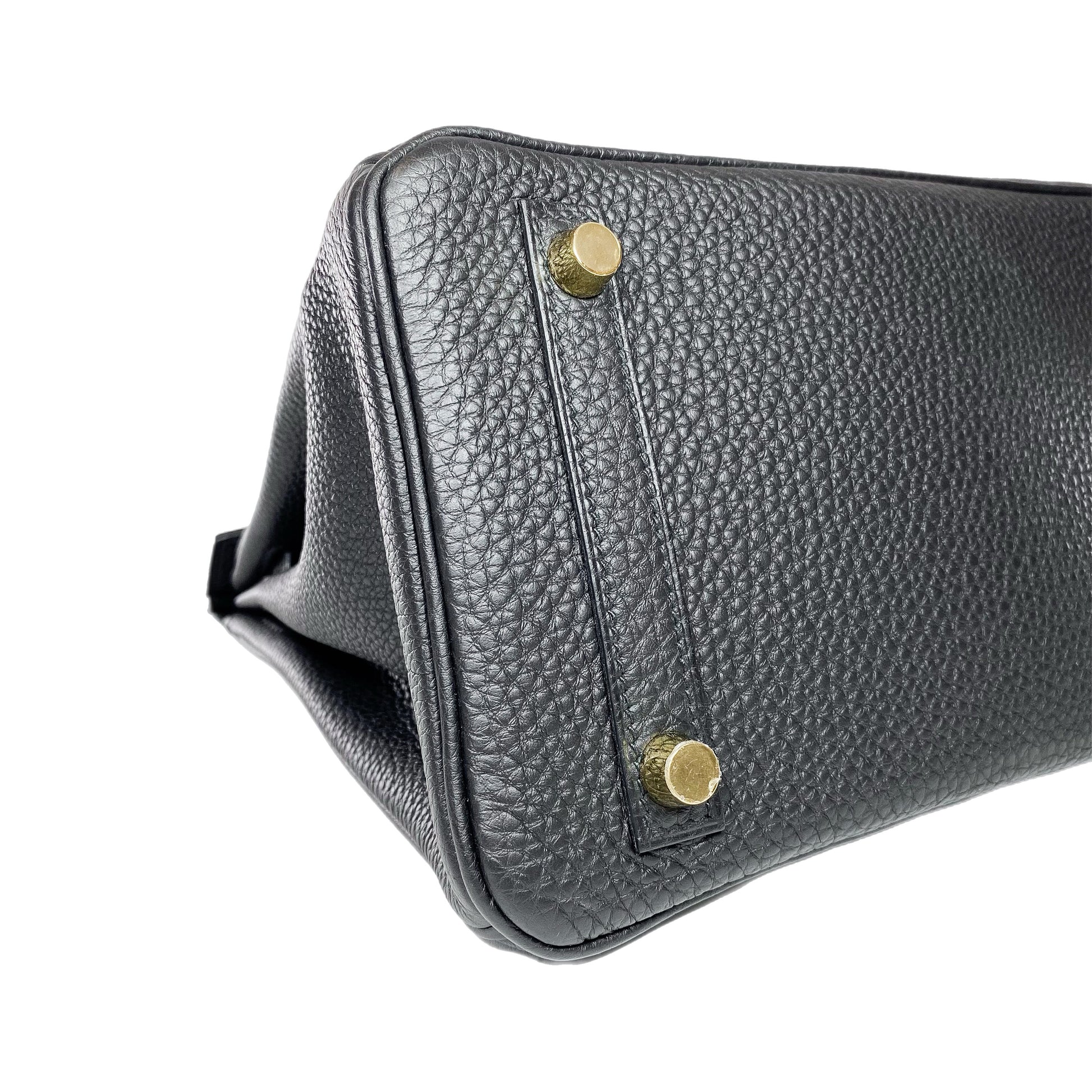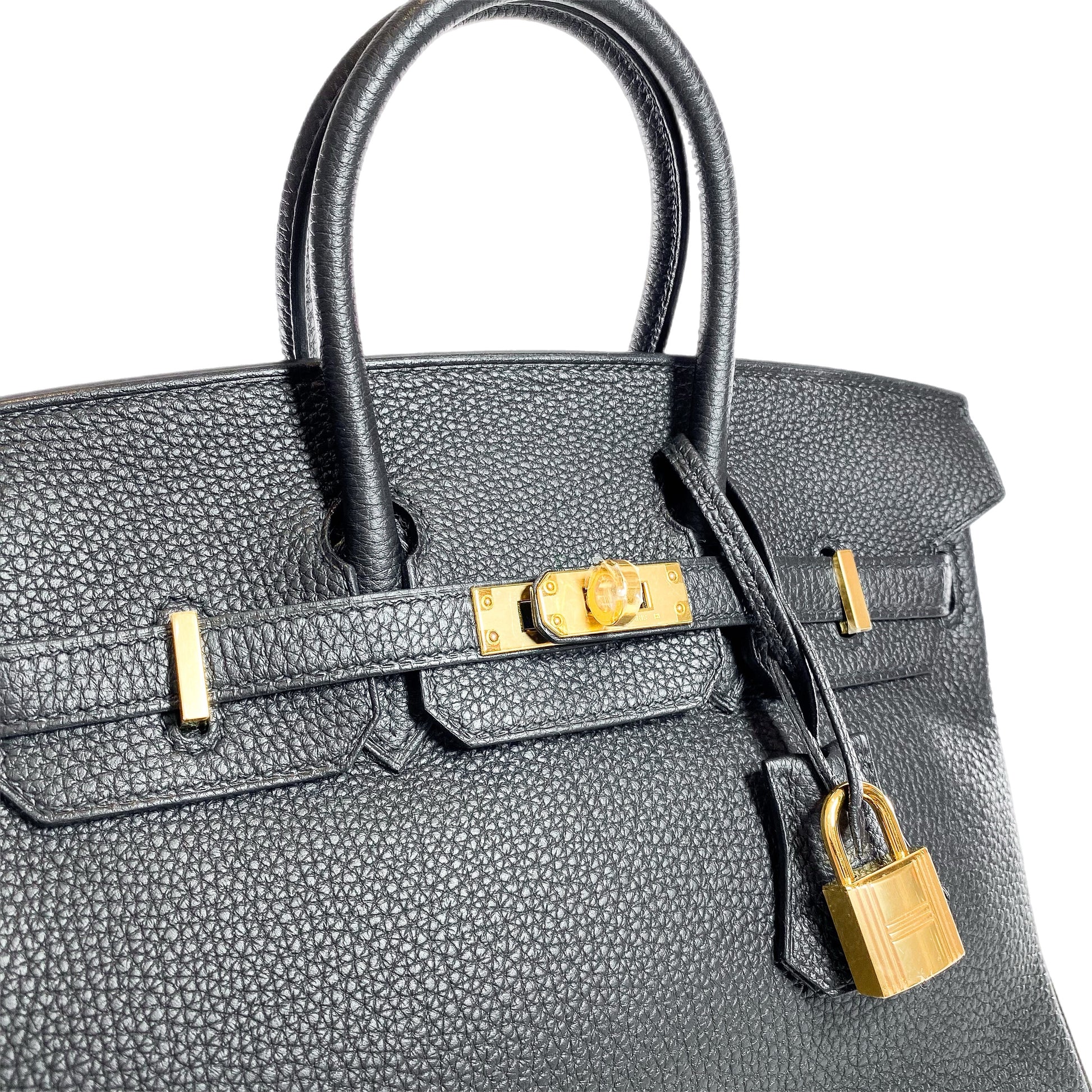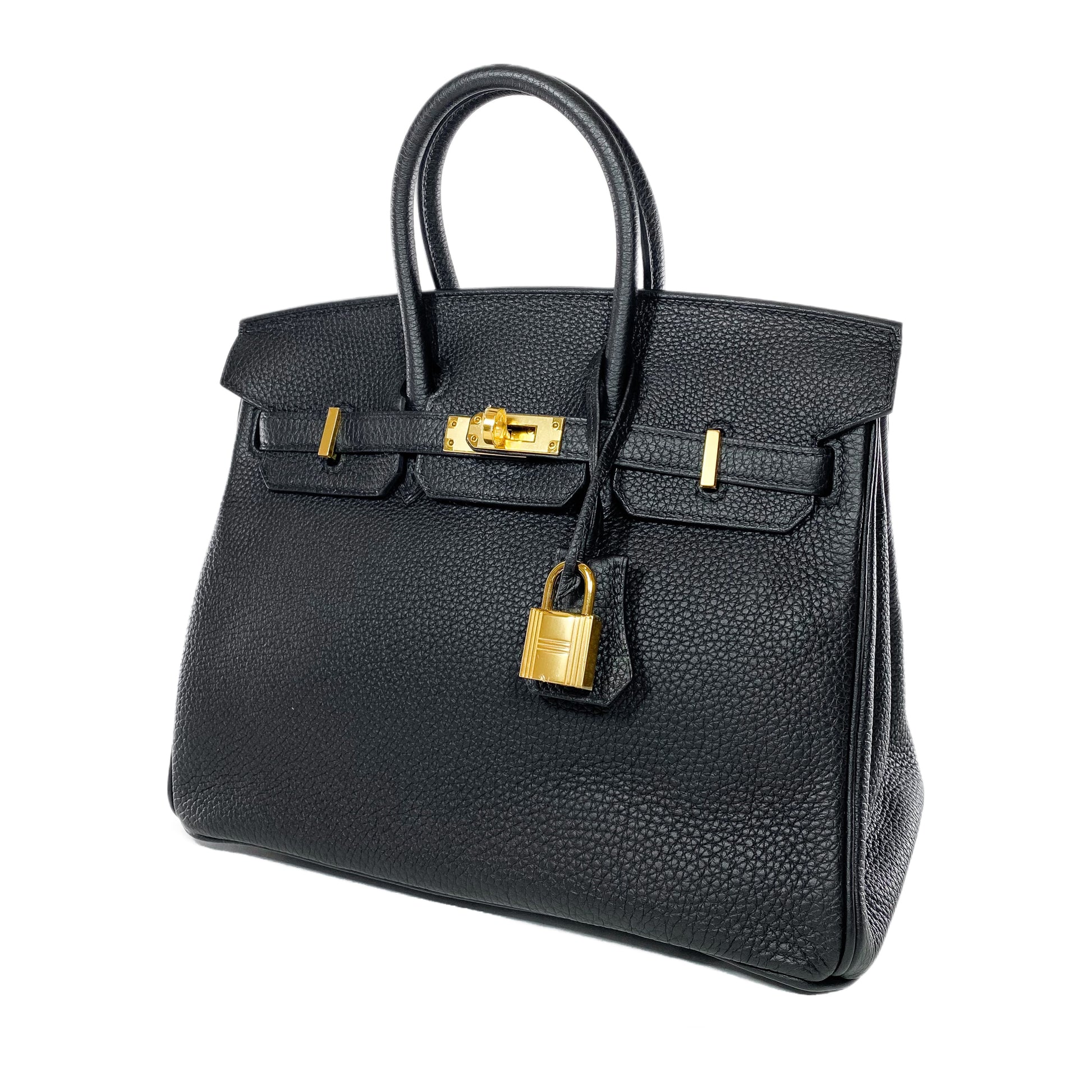 This is an Hermes Black Birkin 25 in togo leather with gold hardware. This chic handbag features two 2.25-inch top handles, a lock and key, and a strap and turn lock closure. The handbag opens to a Black leather lined interior that features a patch pocket and a zipper pocket. This is a stellar everyday handbag!