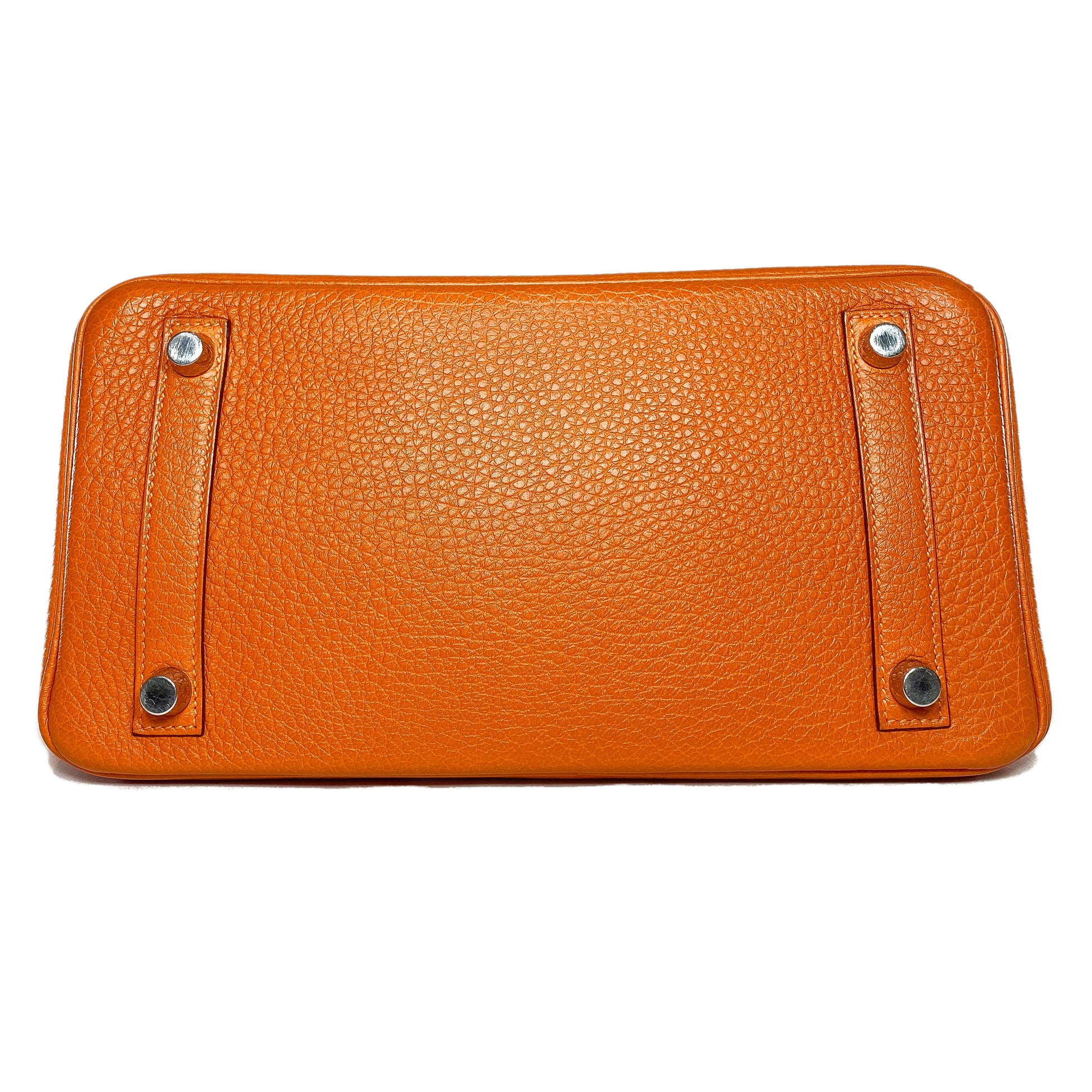 This is an Hermes Orange Birkin 25 in togo leather with palladium hardware. This chic Birkin 25 features two 2.75-inch and a strap and turn lock closure. The front flap opens to an Orange leather lined interior that features a patch pocket and zipper pocket. This is a stellar handbag for a pop of color!