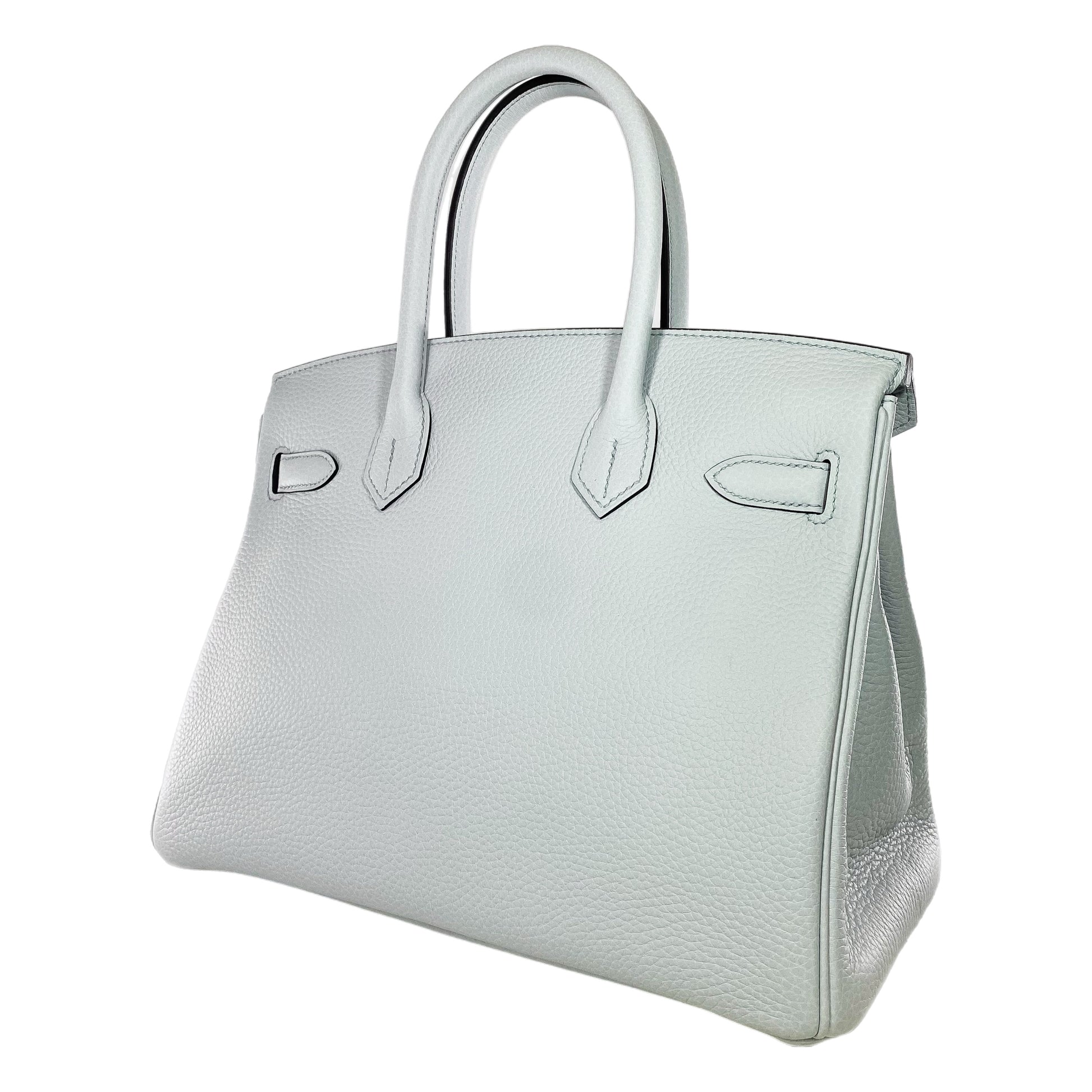 This is an Hermes Bleu Pale Birkin 30 in togo leather with gold hardware. This stylish handbag features two 4-inch top handles, a lock and key, and a strap and turn lock closure. The front flap opens to a Bleu Pale leather lined interior that features a patch pocket and a zipper pocket. This is a stellar Birkin 30 for your handbag collection!