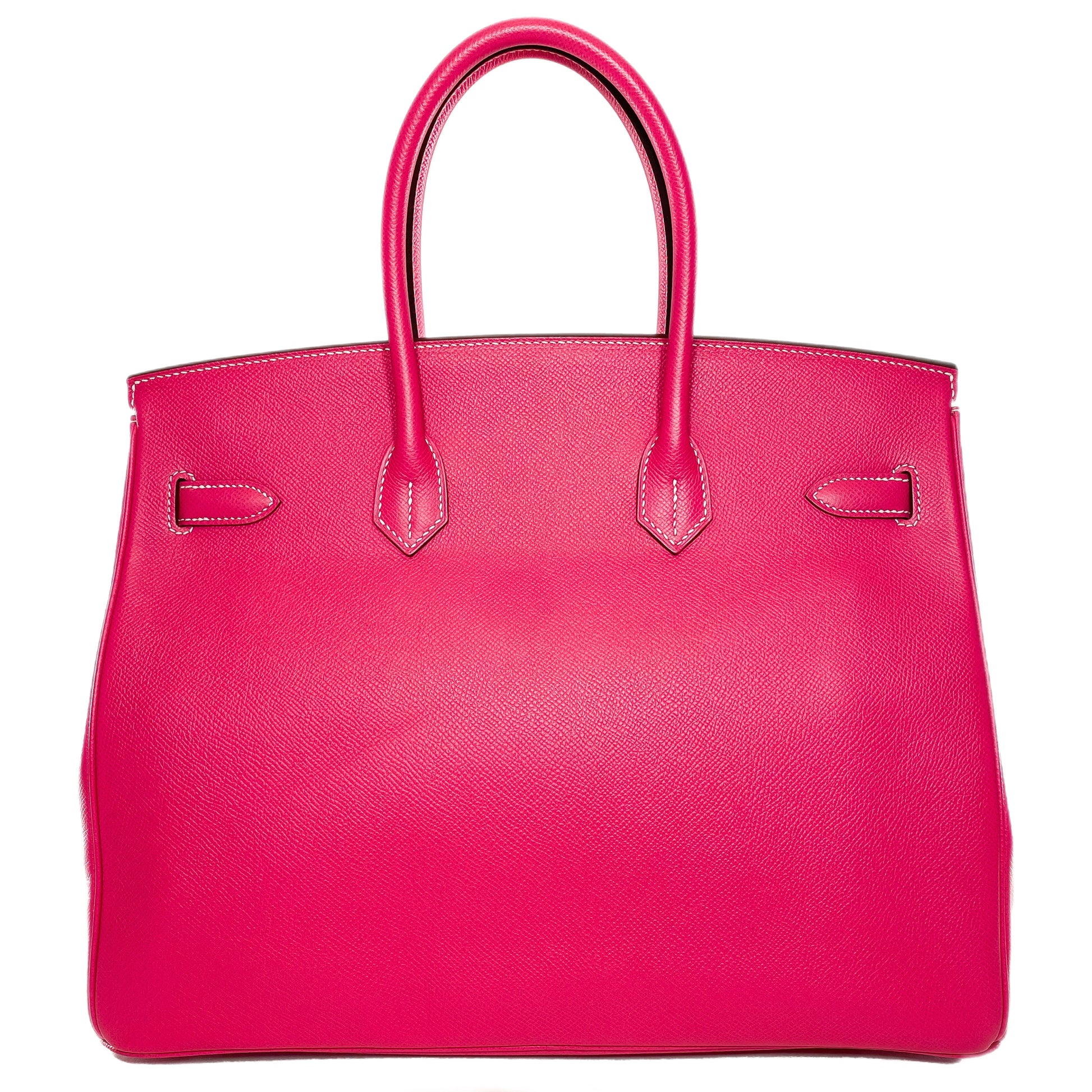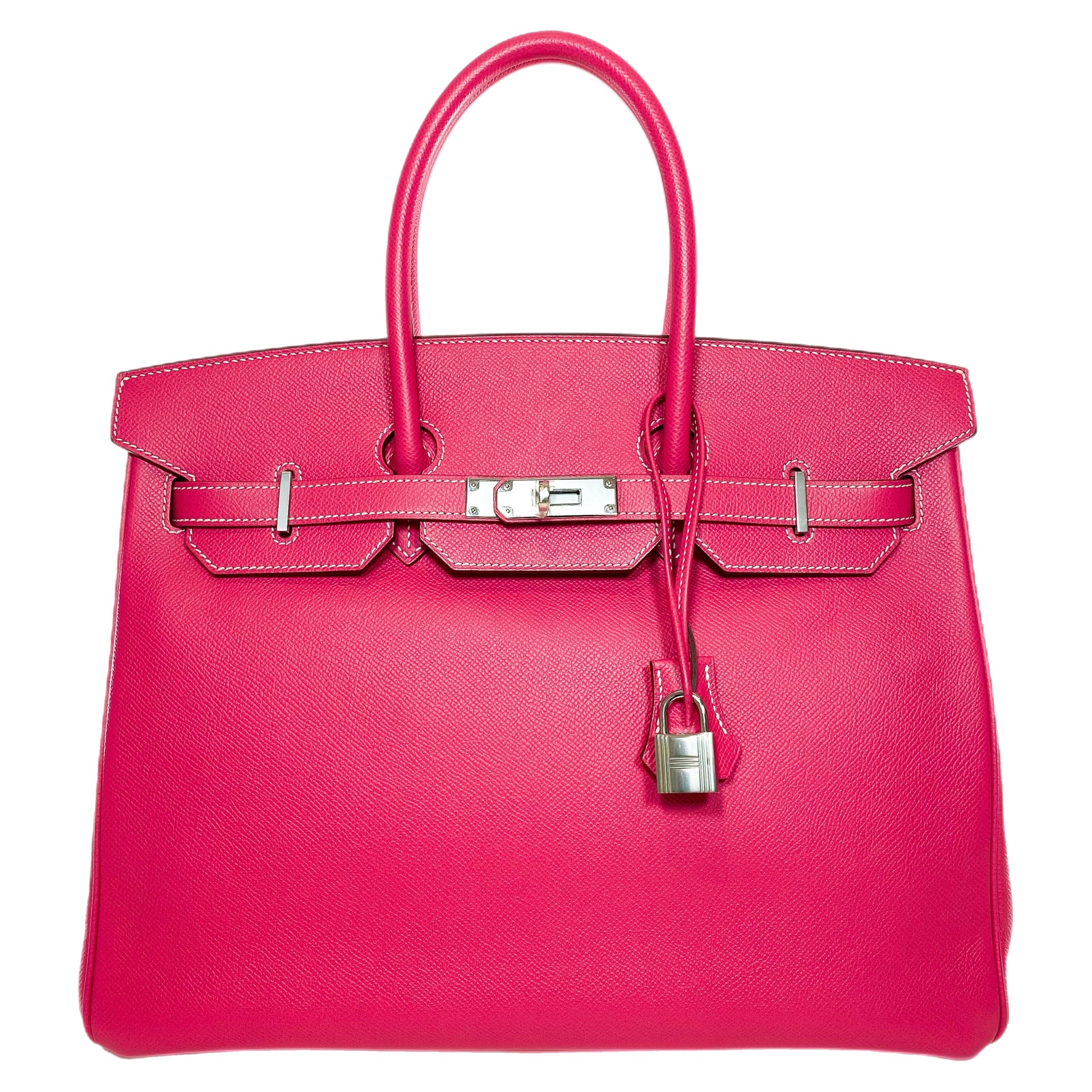 This is an Hermes Rose Tyrien Birkin 35 in epsom leather with palladium hardware. This stylish Birkin features two 4-inch top handles, a lock and key, and a strap and turn lock closure. The front flap opens to a Rose Tyrien leather lined interior that features a patch pocket and a zipper pocket. This is an amazing handbag for a pop of color!