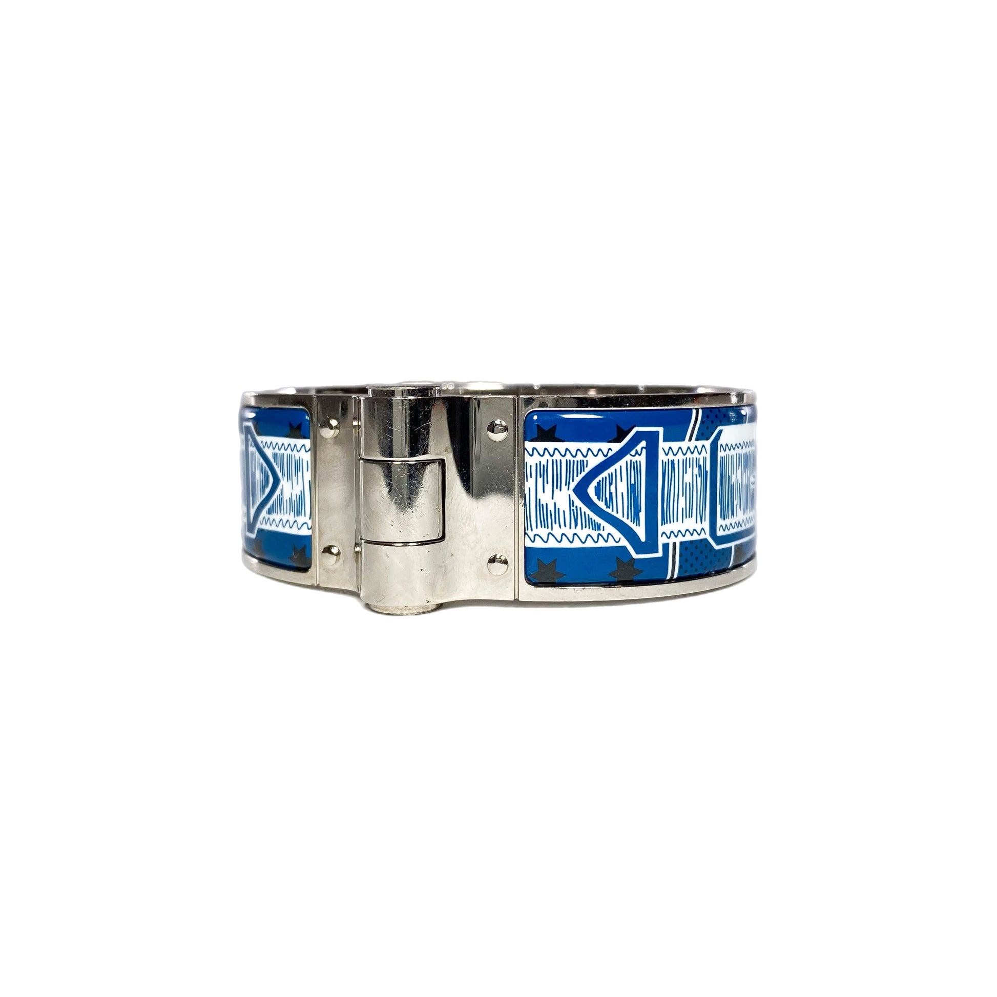 This is an Hermes Blue and White Wide Hinge Bracelet in palladium hardware. This stylish bracelet features blue and white decorative designs and a hinge closure. This is a wonderful everyday accessory!