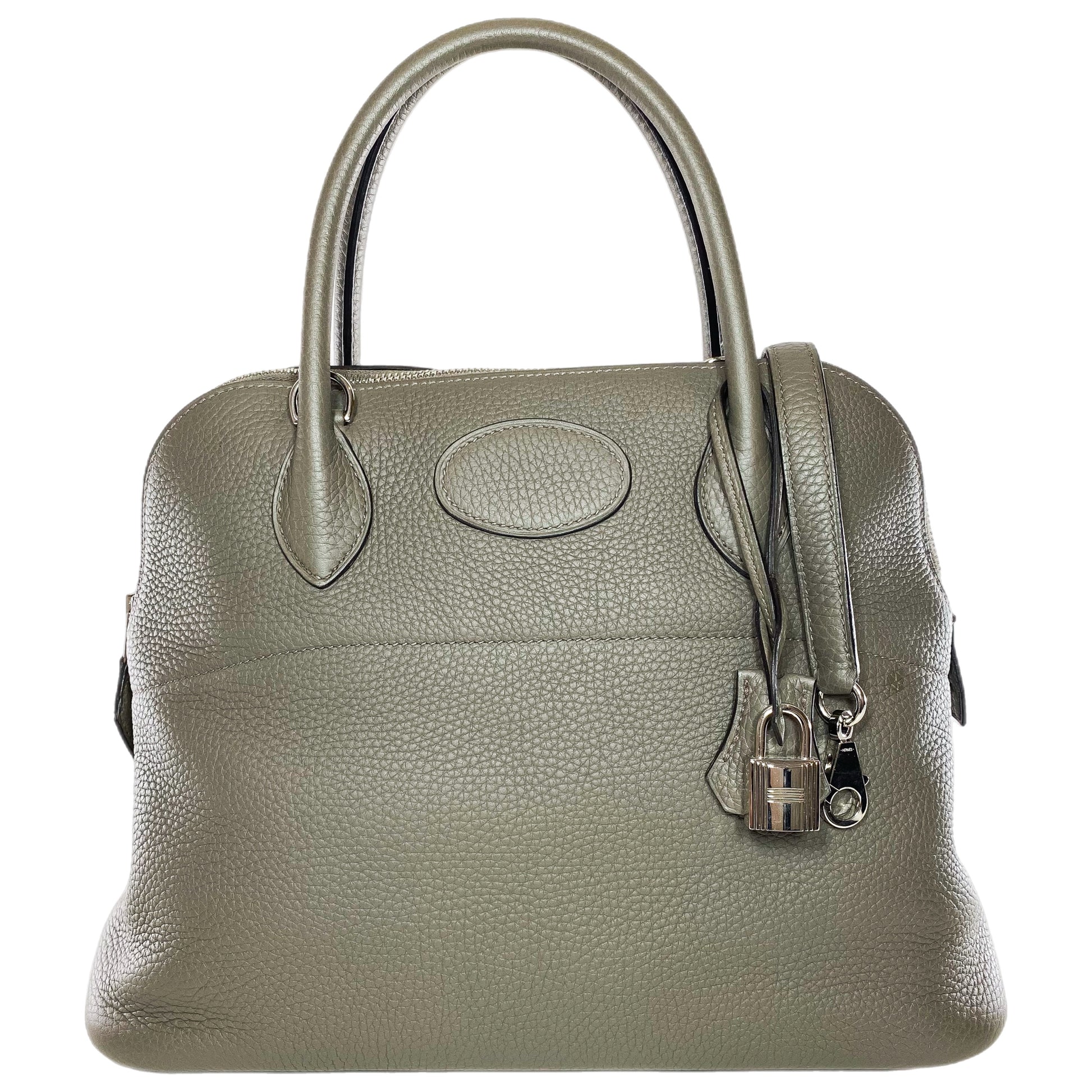 This is an Hermes Gris Etain Bolide 31 in clemence leather with palladium hardware. This stylish handbag features two 4-inch top handles, a 16.5-inch detachable strap, and a lock and key. A top zipper opens to a Gris Etain leather lined interior that features two patch pockets. This is a wonderful everyday handbag!