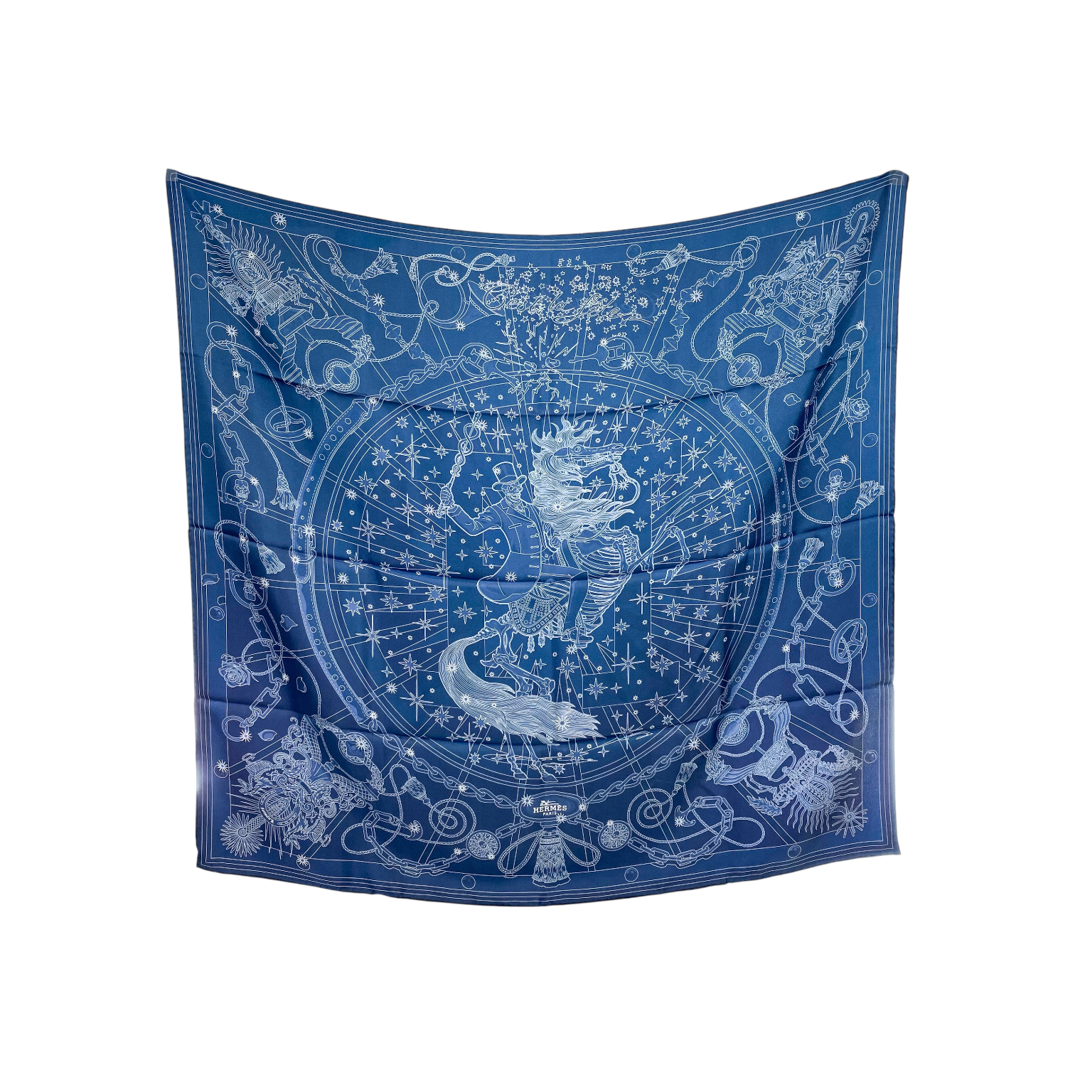 This is an Hermes C’est La Fete Scarf in silk. This beautiful scarf measures 90cm and features decorative imagery of a skeleton riding a horse. This is a stellar scarf for your collection!