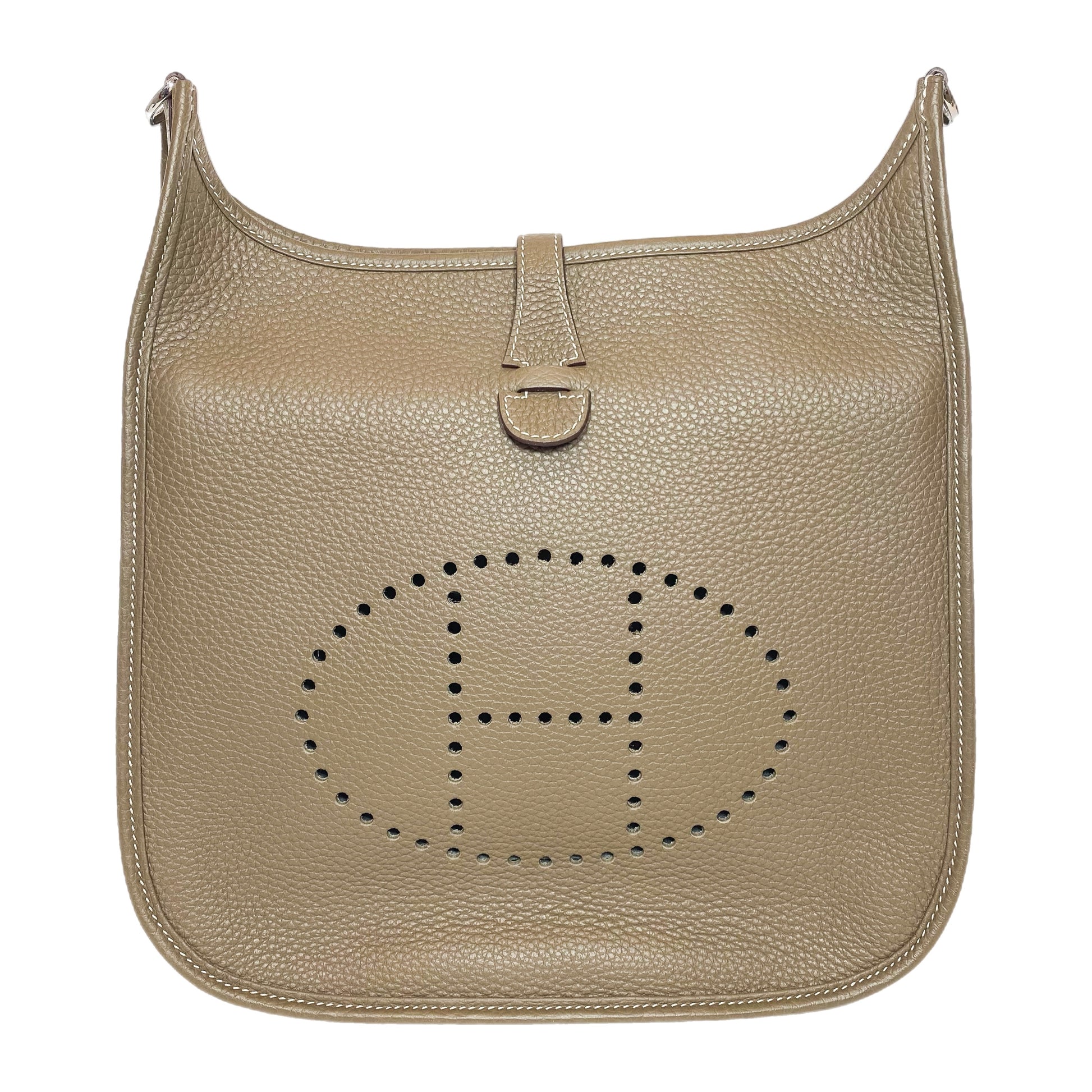 This is an Hermes Etoupe Evelyne PM in clemence leather with palladium hardware. This stylish handbag features a 21-inch adjustable and removable strap, a rear exterior pocket, and a perforated “H” on the front. A top strap and snap closure opens to a spacious Etoupe suede lined interior. This is a wonderful Evelyne for everyday use!