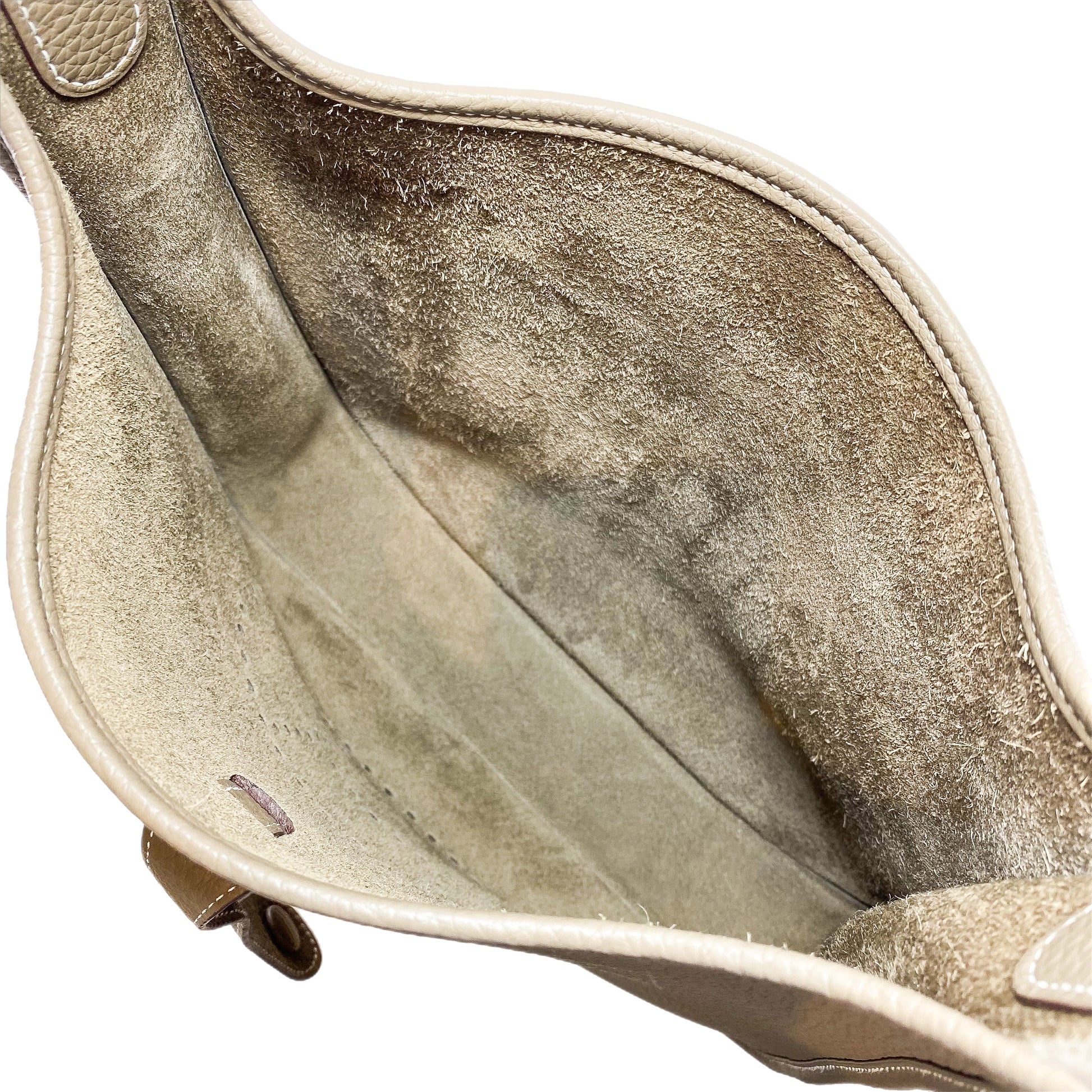 This is an Hermes Etoupe Evelyne PM in clemence leather with gold hardware. This stylish handbag features a 21-inch adjustable and removable strap, a rear exterior pocket, and a perforated “H” on the front. A top strap and snap closure opens to a spacious Etoupe suede lined interior. This is a wonderful Evelyne for everyday use!