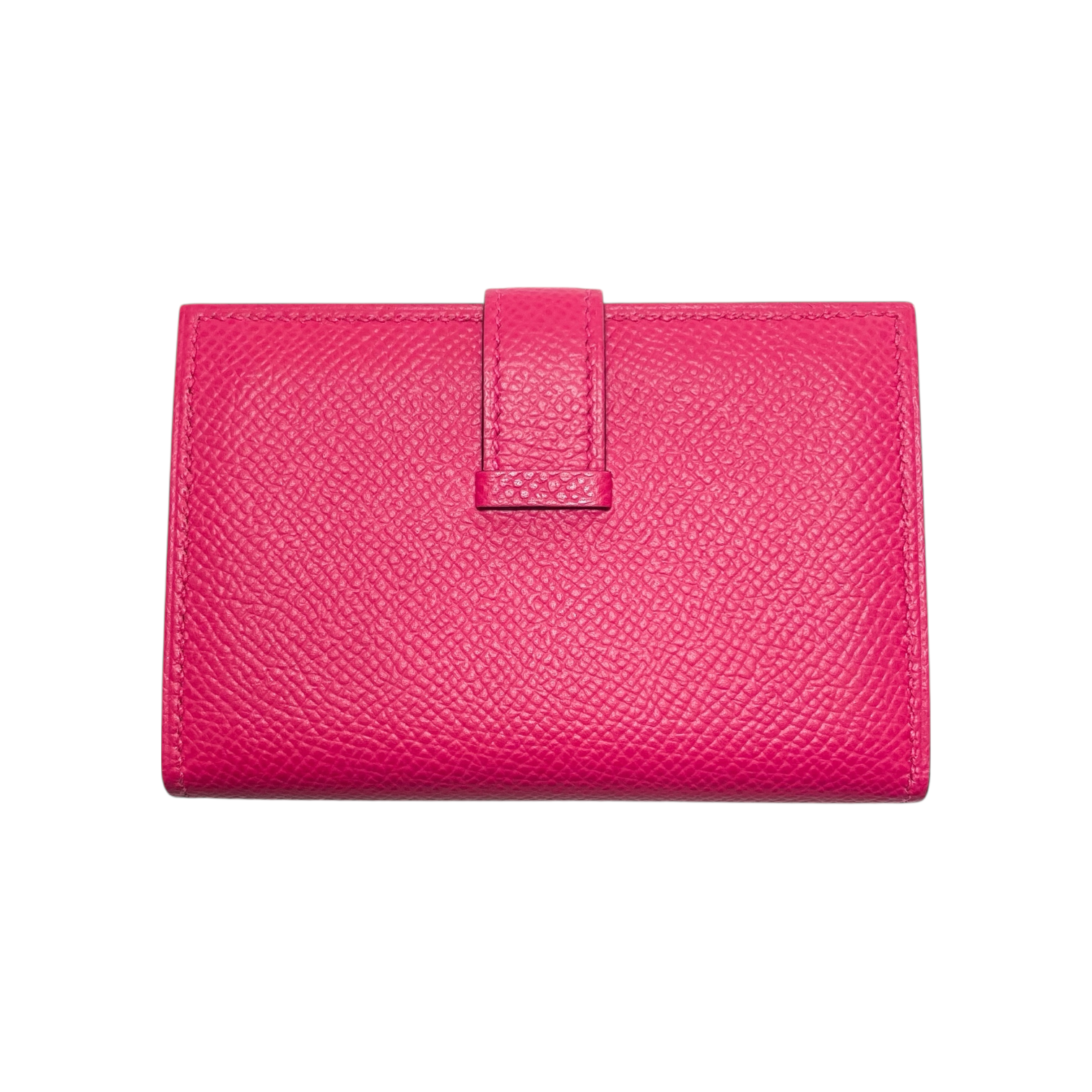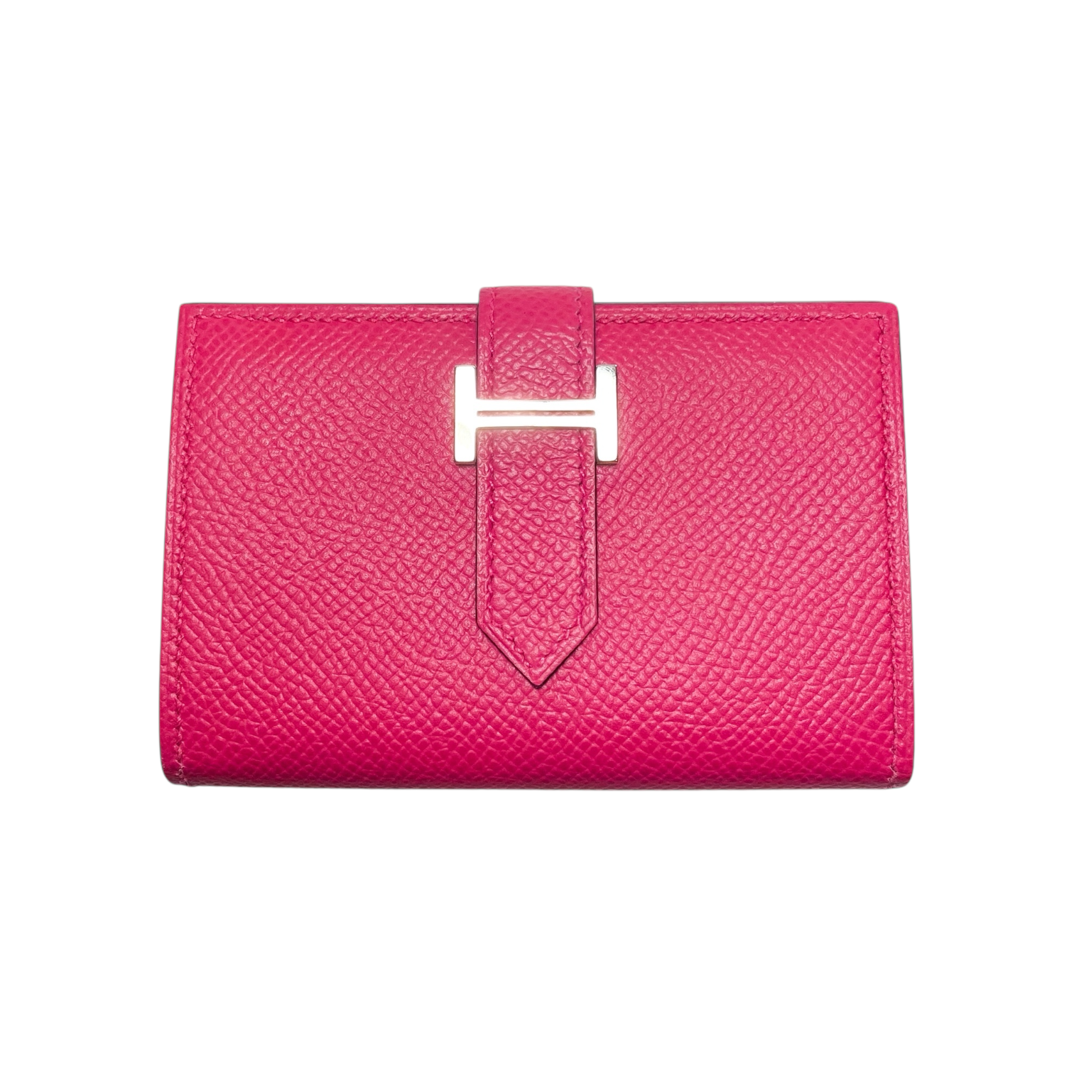 This is an Hermes Framboise Bearn Compact Card Holder in epsom leather with palladium hardware. This wonderful card holder features a cross-over strap and an “H” closure. The interior is lined in leather and features card slots. This is a wonderful everyday accessory!