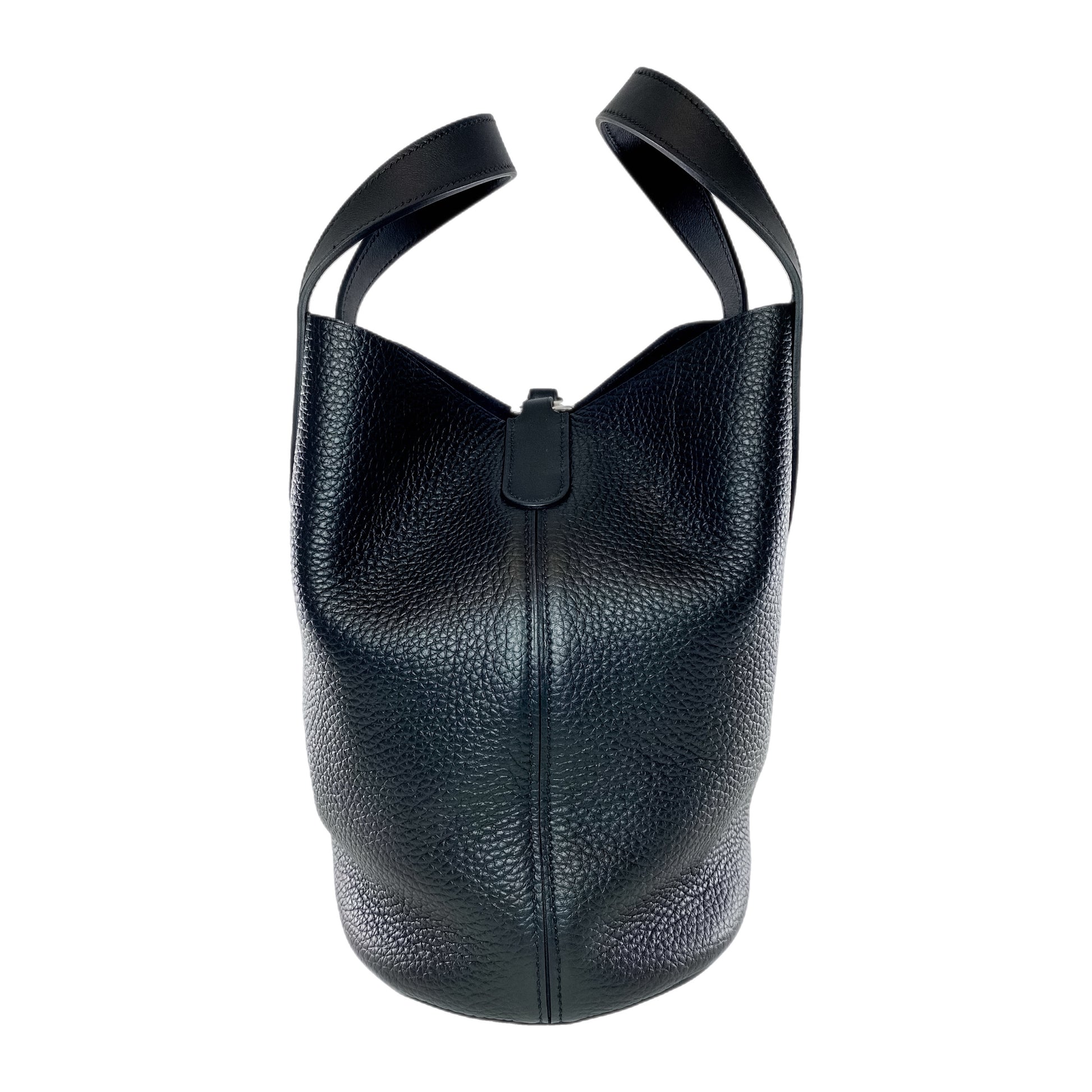 This is an Hermes Black In-The-Loop 23 in clemence leather with palladium hardware. This stylish handbag features two 4-inch top handles and a Chaine d’Ancre shaped closure. The interior is lined in black suede and features a patch pocket. This is the perfect everyday handbag!
