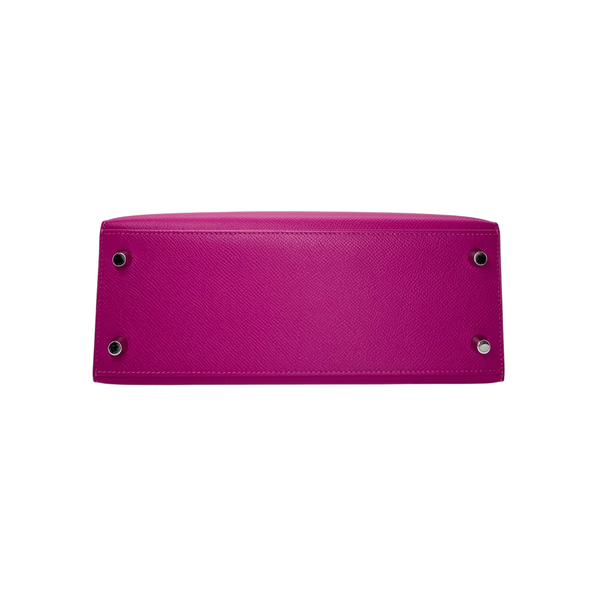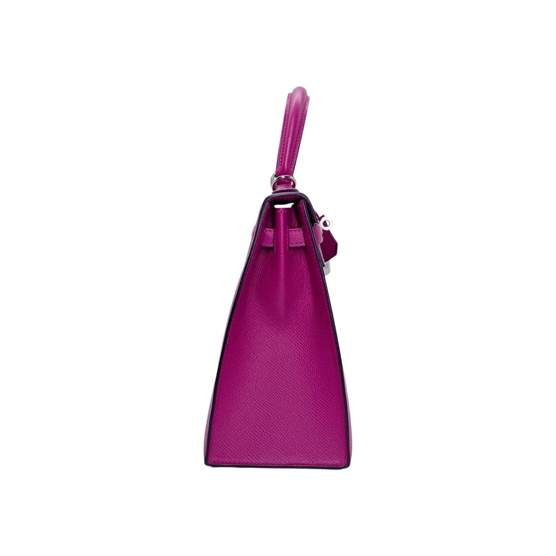 This is an Hermes Rose Poupre Kelly 25 Sellier in epsom leather with palladium hardware. This beautiful Kelly features a top handle, a detachable strap, a lock and key, and a turn lock closure. The front flap opens to a Rose Poupre leather lined interior that features a patch pocket and a zipper pocket. This is a stellar handbag for any occasion!