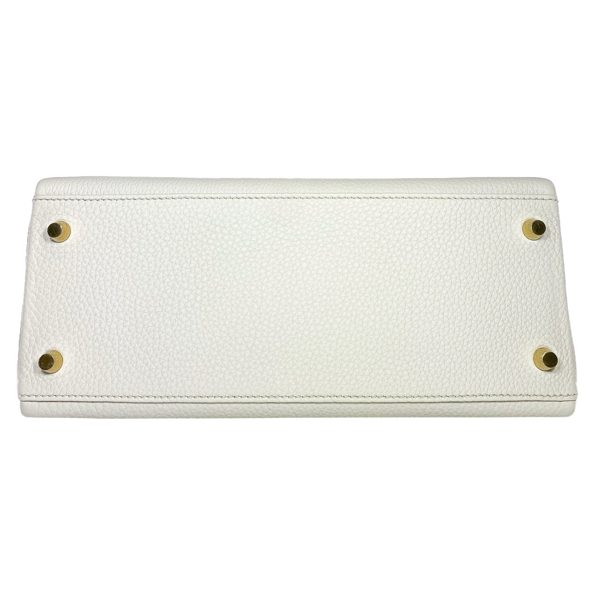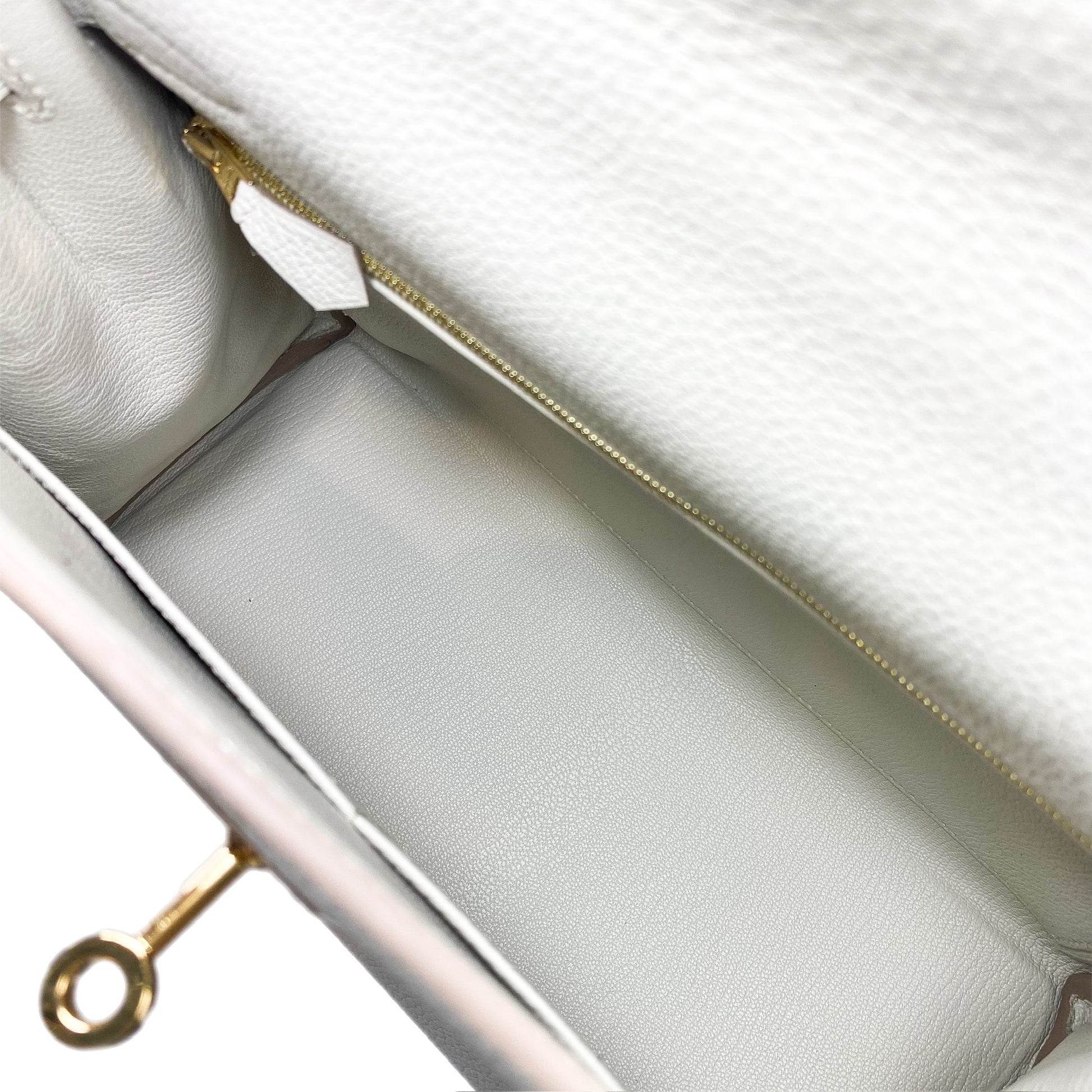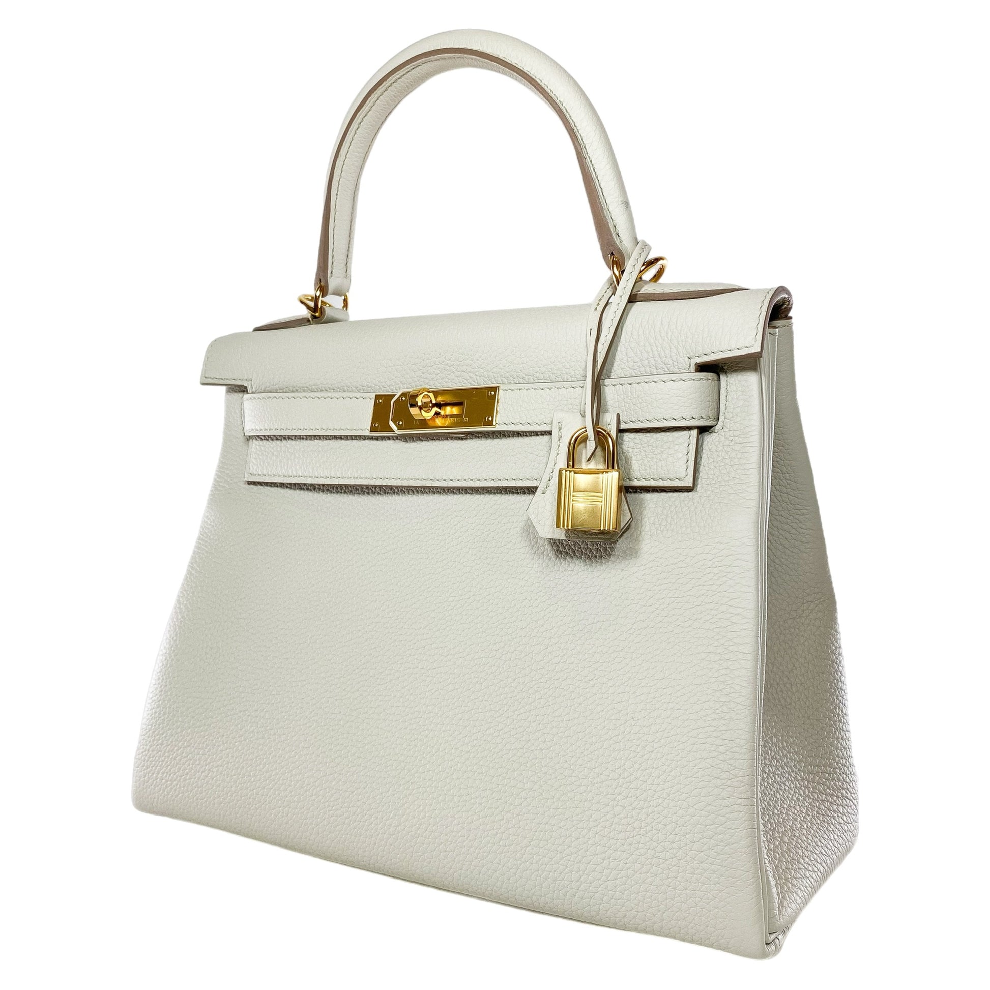This is an Hermes Beton Kelly 28 in togo leather with gold hardware. This chic Kelly 28 features a 3.5-inch top handle, a 17.5-inch detachable strap, and a turn lock closure. The front flap opens to a Beton leather lined interior that features patch pockets and a zipper pocket. This is a stellar handbag for year-round use!
