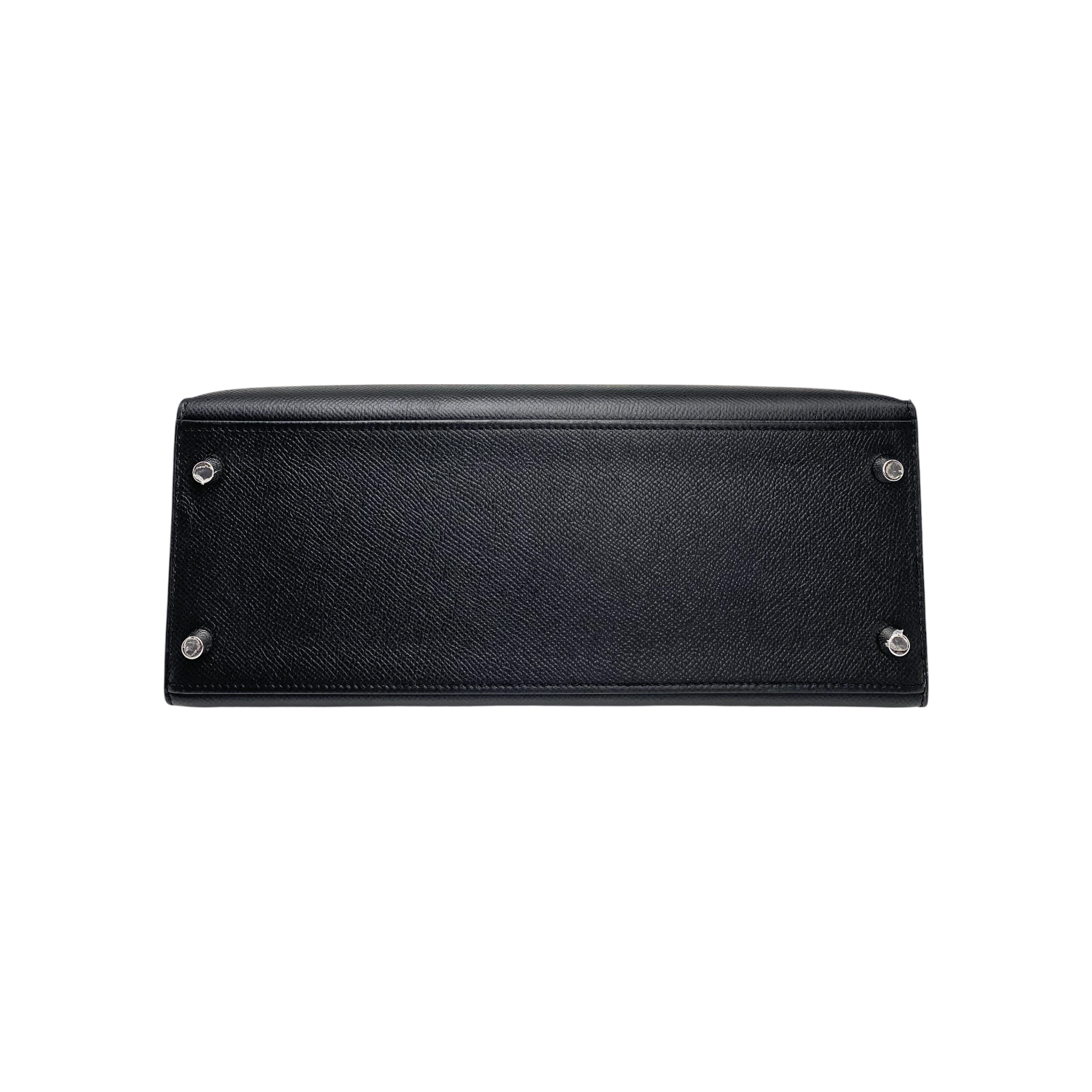 This is an Hermes Black Kelly 28 in epsom leather with palladium hardware. This stylish Kelly features a 3.5-inch top handle, a 17.5-inch detachable strap, and a strap and turn lock closure. The front flap opens to a black leather lined interior that features two patch pockets and a zipper pocket. This is a stellar Kelly for everyday use!