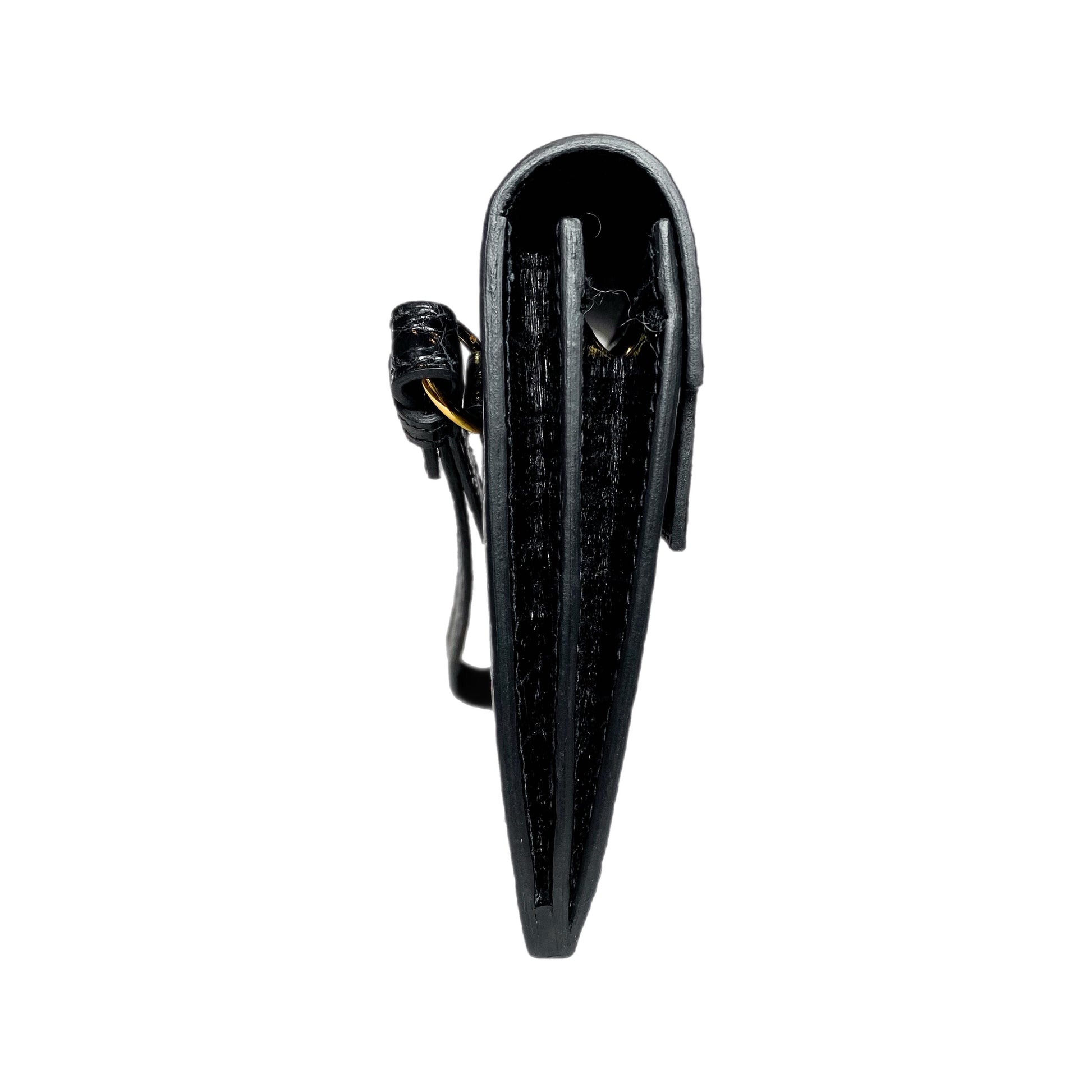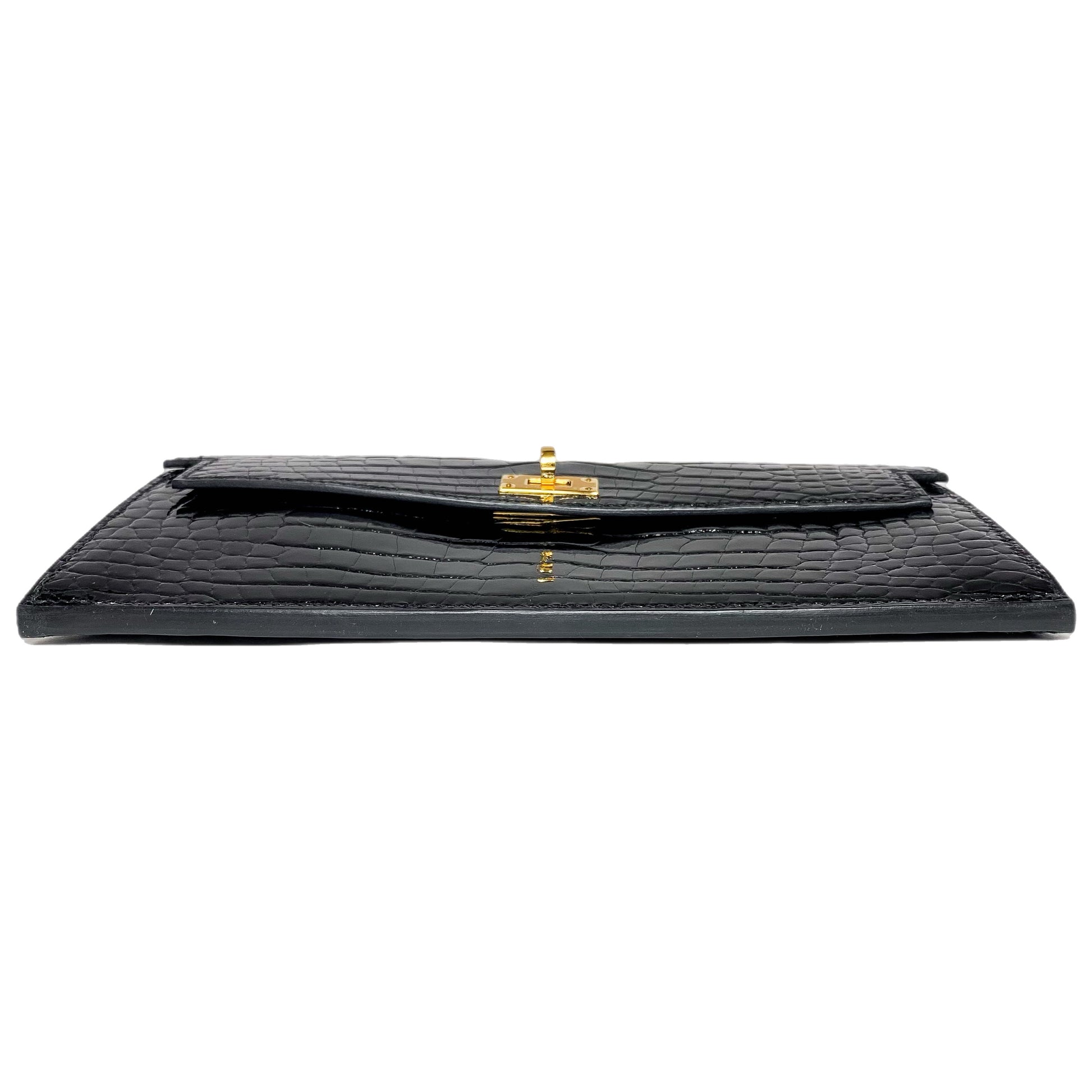 This is an Hermes Black Kelly Pocket Long Wallet in Mississippiensis alligator and gold hardware. This chic Long Wallet features a 7-inch strap and a turn lock closure. The front flap opens to a partitioned black leather lined interior that features a zipper compartment, card slots, and a patch pocket. This is a stellar accessory for any outfit!