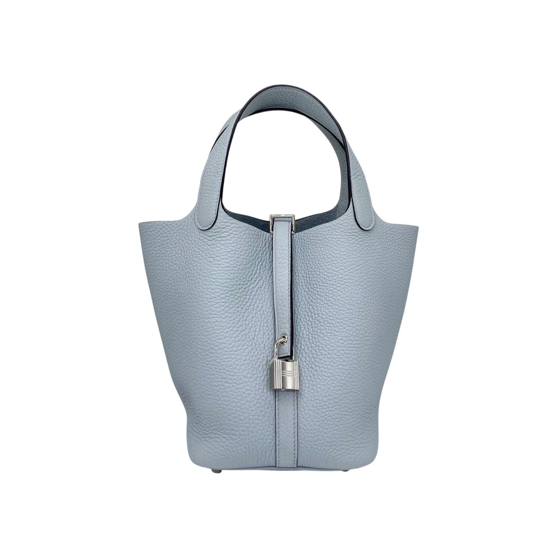 This is an Hermes Picotin 18 in Gris Pantin clemence leather with palladium hardware. This Picotin features two top handles, a lock and key, and a strap closure. The interior is lined in Gris Pantin suede. This is an amazing handbag for any occasion!