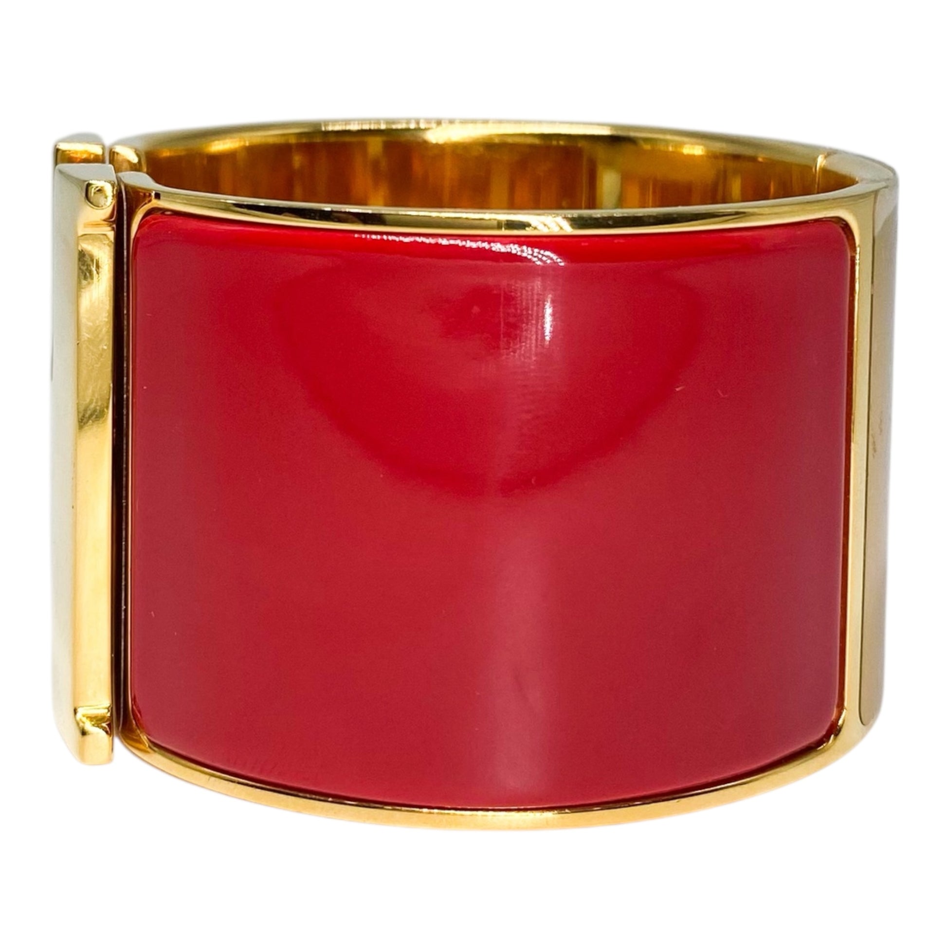 This is an Hermes Rouge Extra-Wide Clic Clac H Bracelet in yellow gold hardware. This stylish Clic Clac features Rouge enamel and an H closure. This is a must-have accessory you can wear anywhere!