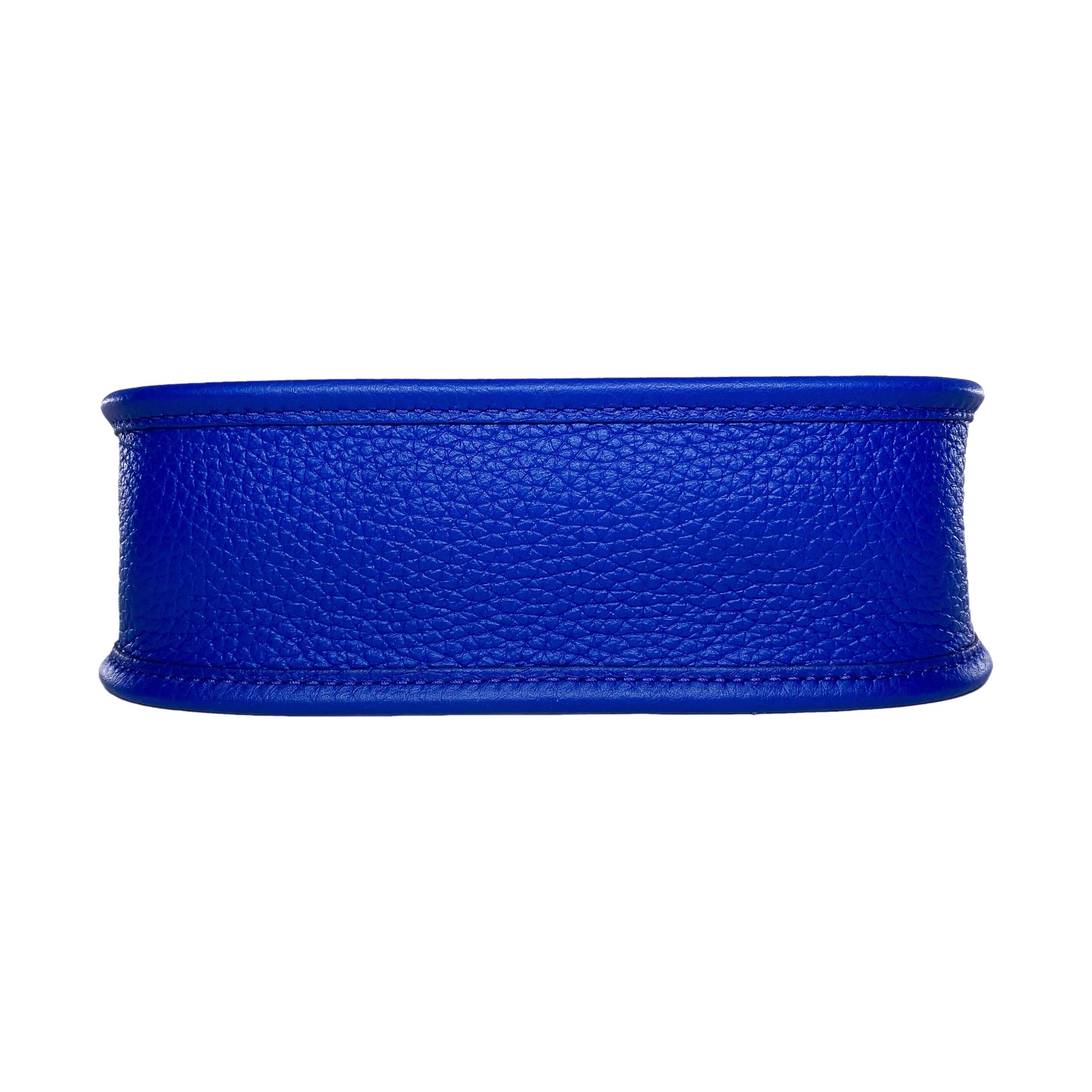 This is an Hermes Bleu Electrique TPM in clemence leather with palladium hardware. This stylish TPM features a 22-inch detachable strap and the signature crossover strap and snap closure. The interior is spacious and is lined in Bleu Electrique suede. This is an amazing year-round bag!