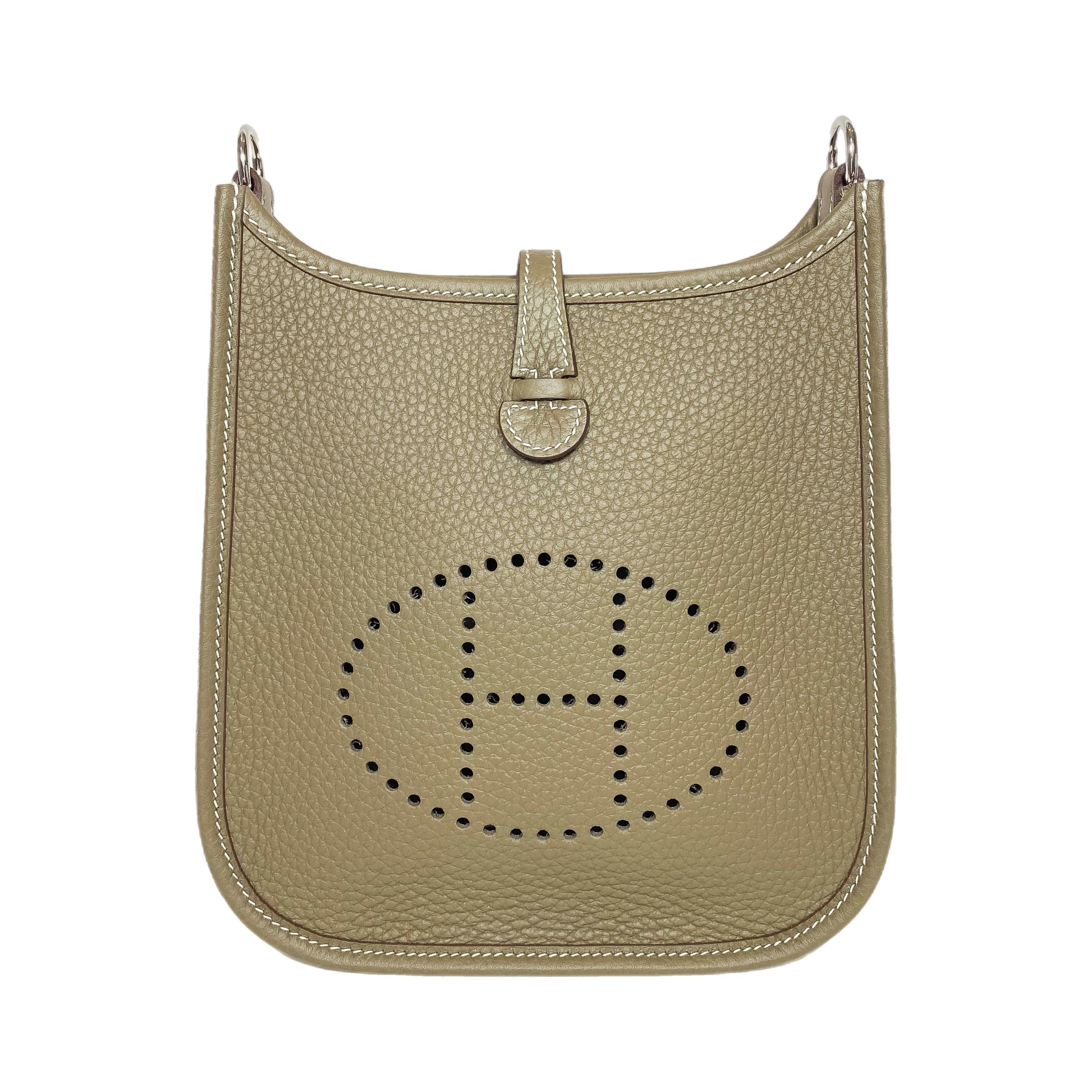 This is an Hermes Etoupe TPM in clemence leather with palladium hardware. This chic TPM features an 21-inch navy removable strap, a perforated “H,” and a crossover strap and snap closure. The interior is lined in Etoupe suede. This is a wonderful TPM for everyday use!