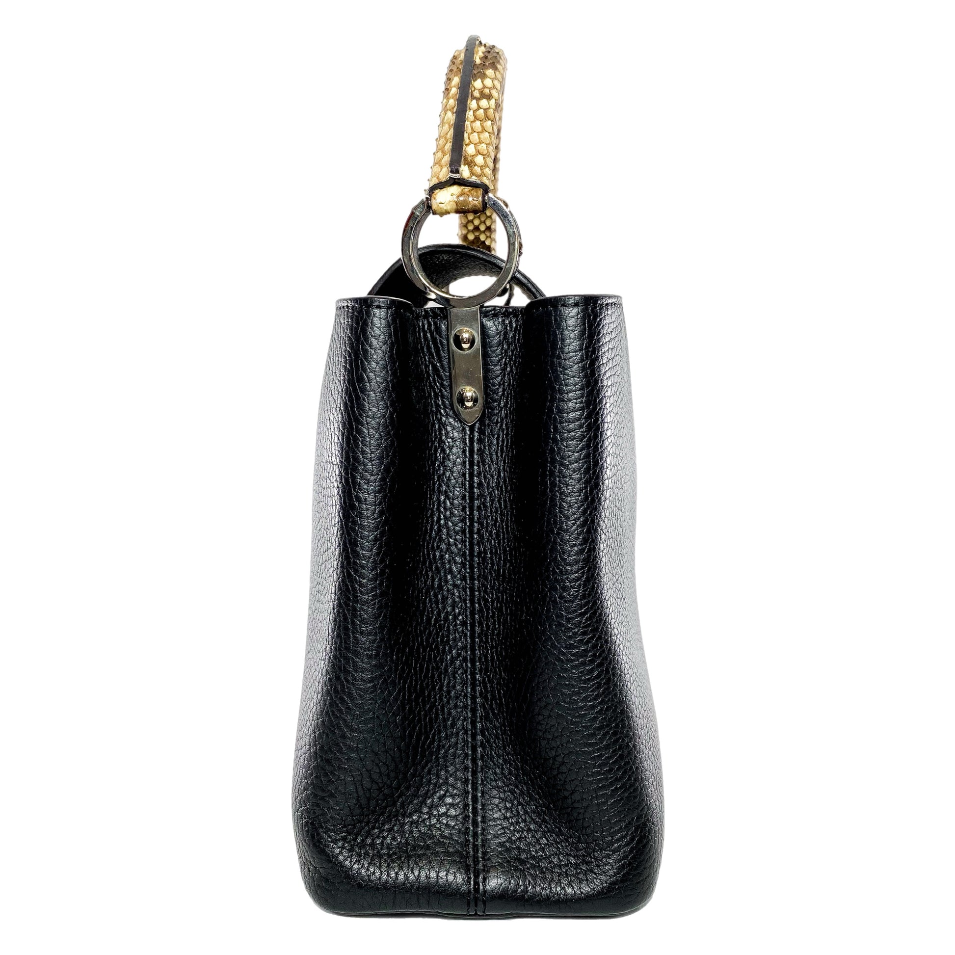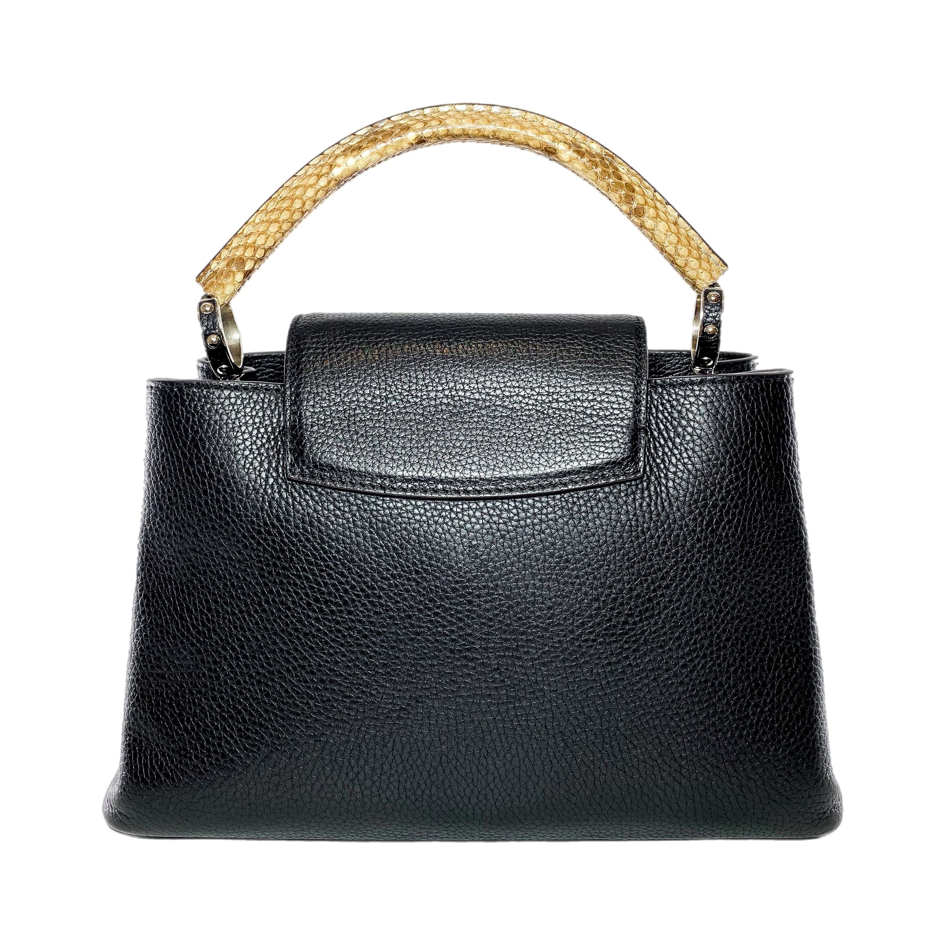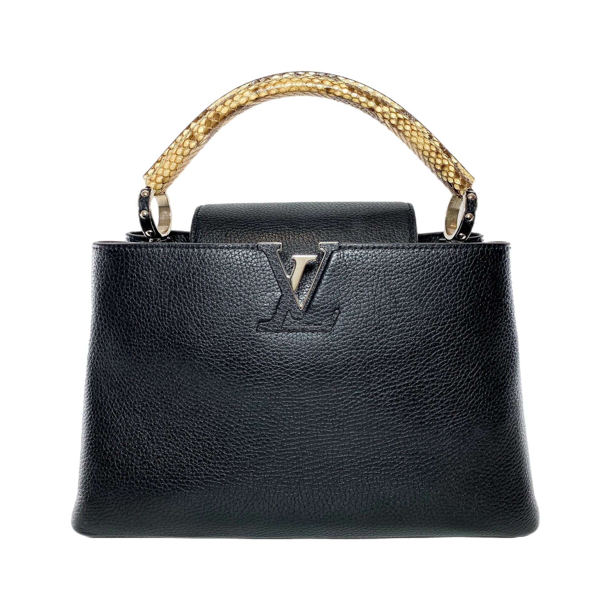This is a Louis Vuitton Black Python Capucines in Taurillon leather with silver hardware. This chic handbag features a 3.5-inch python top handle, a 23-inch detachable and adjustable leather strap, and the LV logo on the front. A cross-over flap closure opens the handbag to a red leather lined partitioned interior that features a zipper pocket. This Capucines is a wonderful everyday handbag!