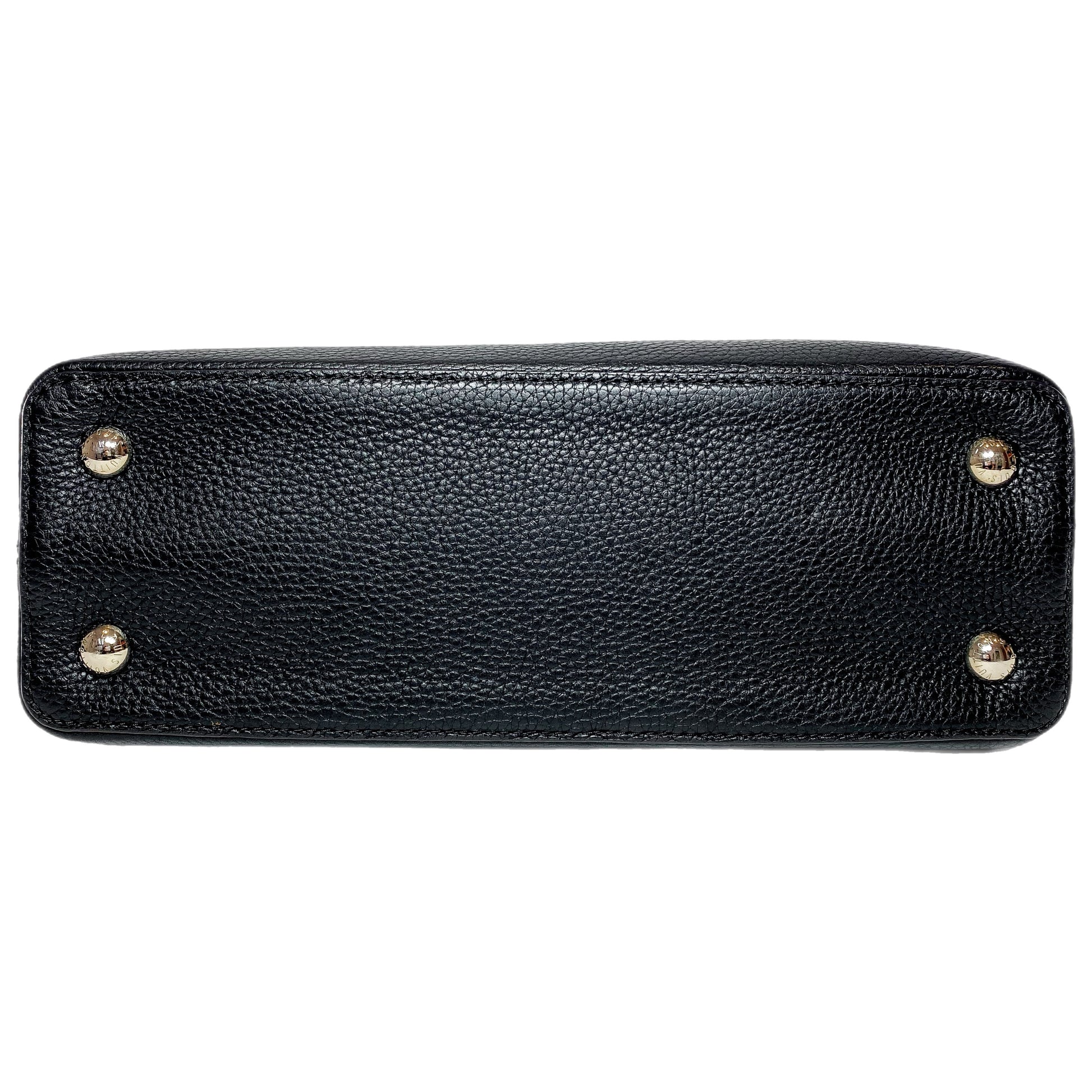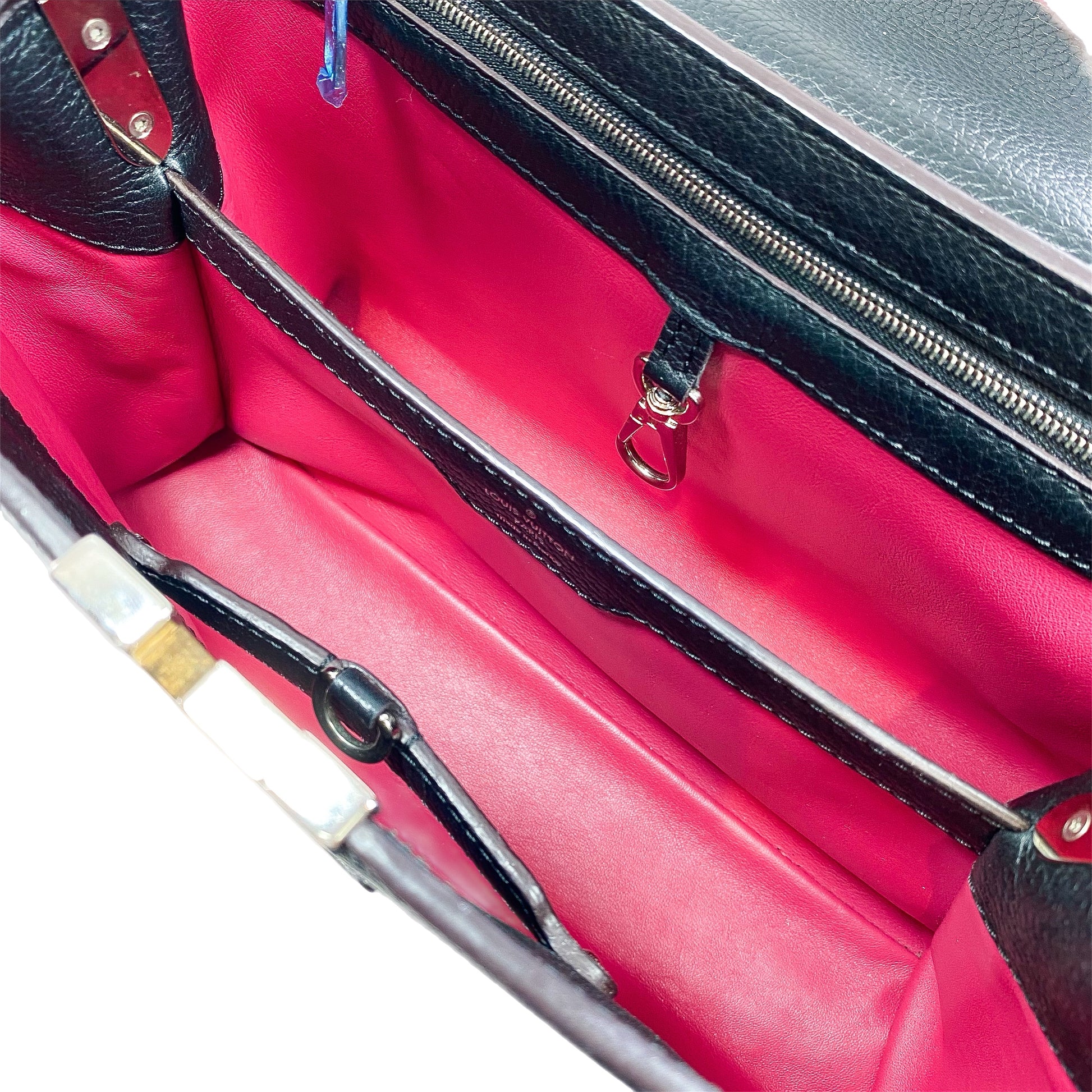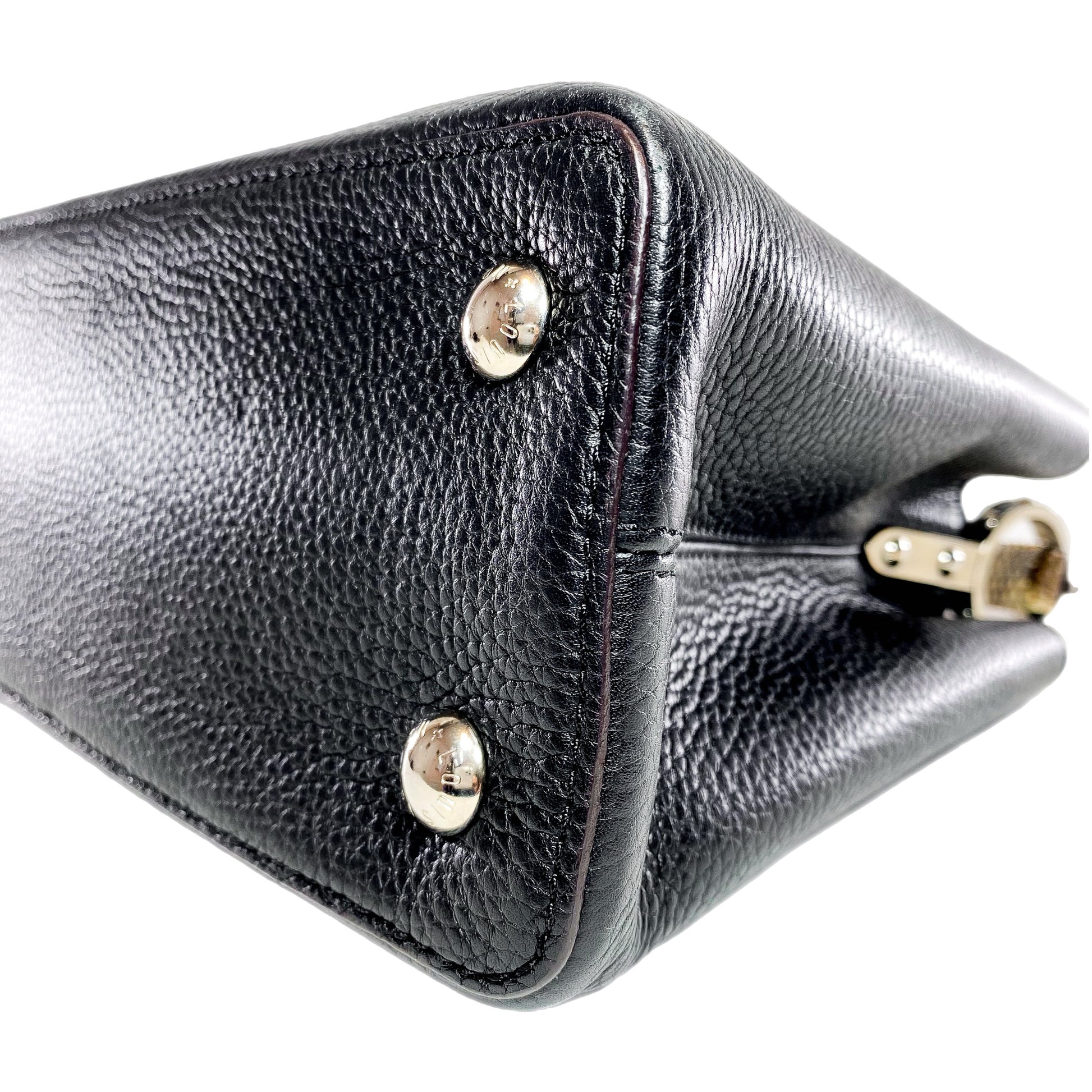 This is a Louis Vuitton Black Python Capucines in Taurillon leather with silver hardware. This chic handbag features a 3.5-inch python top handle, a 23-inch detachable and adjustable leather strap, and the LV logo on the front. A cross-over flap closure opens the handbag to a red leather lined partitioned interior that features a zipper pocket. This Capucines is a wonderful everyday handbag!