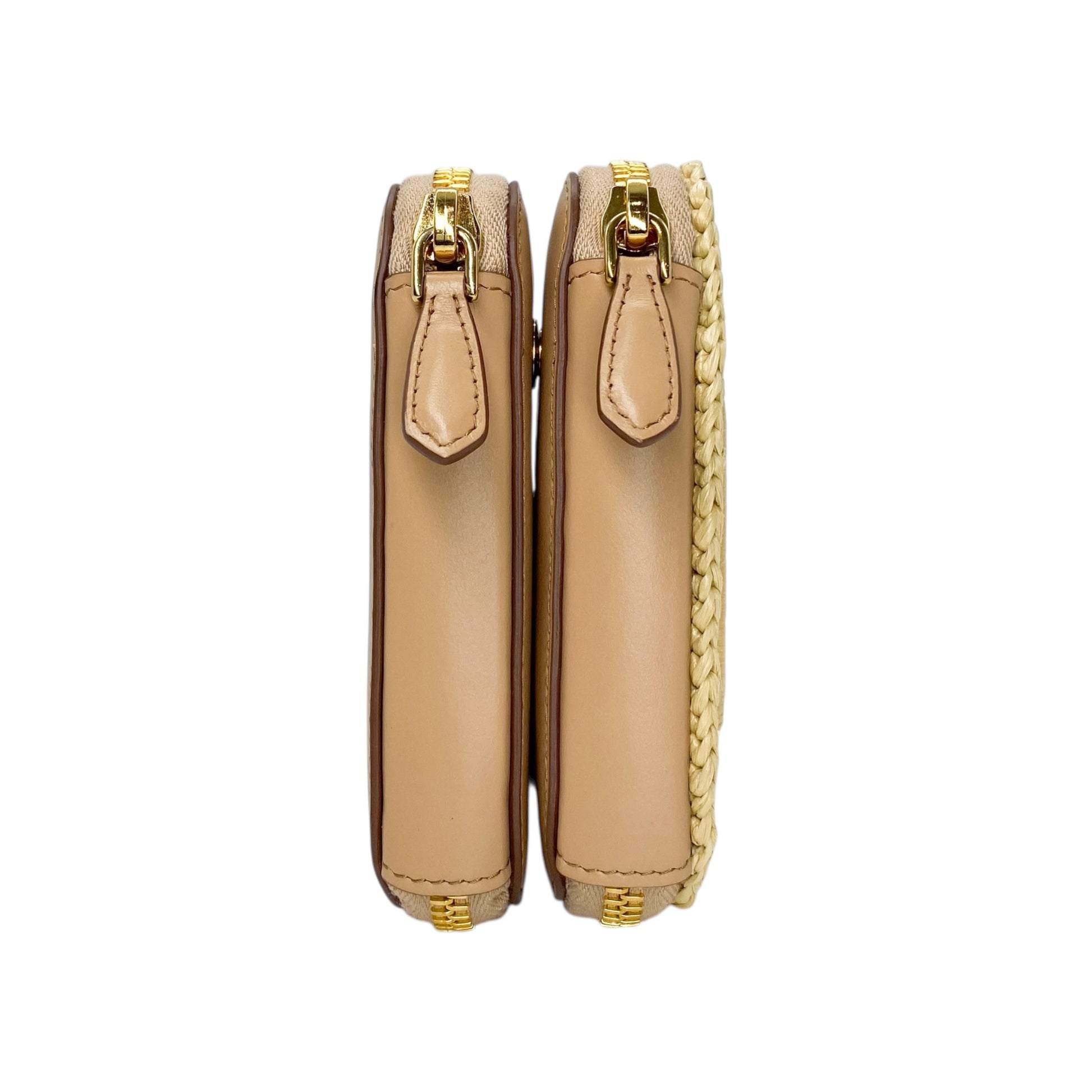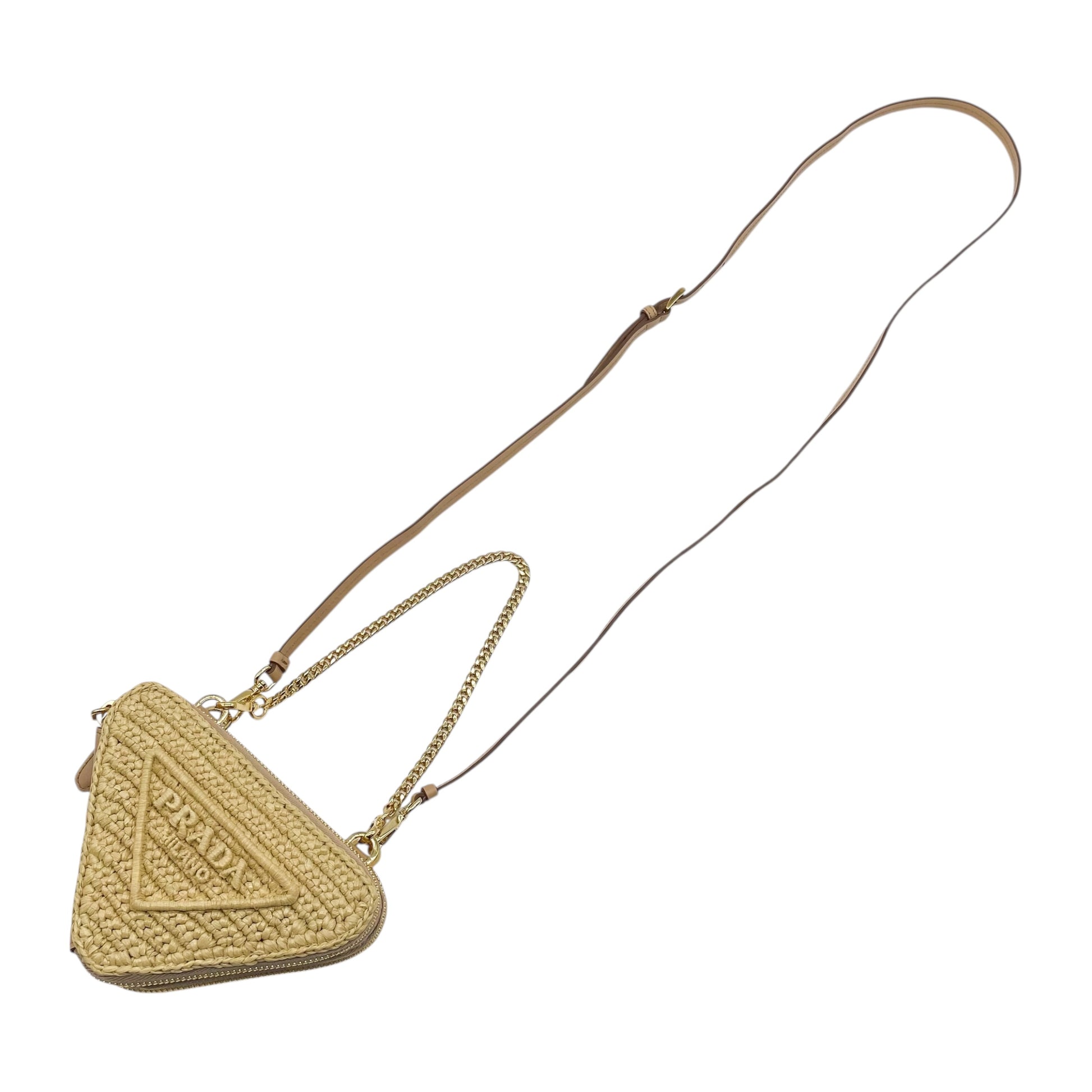 This is a Prada Beige Micro Triangle Bag in raffia and leather with gold hardware. This adorable handbag features a chain strap, a leather strap, and two top zippers. The triangles can be separated. The interior is lined in beige fabric and features patch pockets. This is a stellar accessory for any occasion!