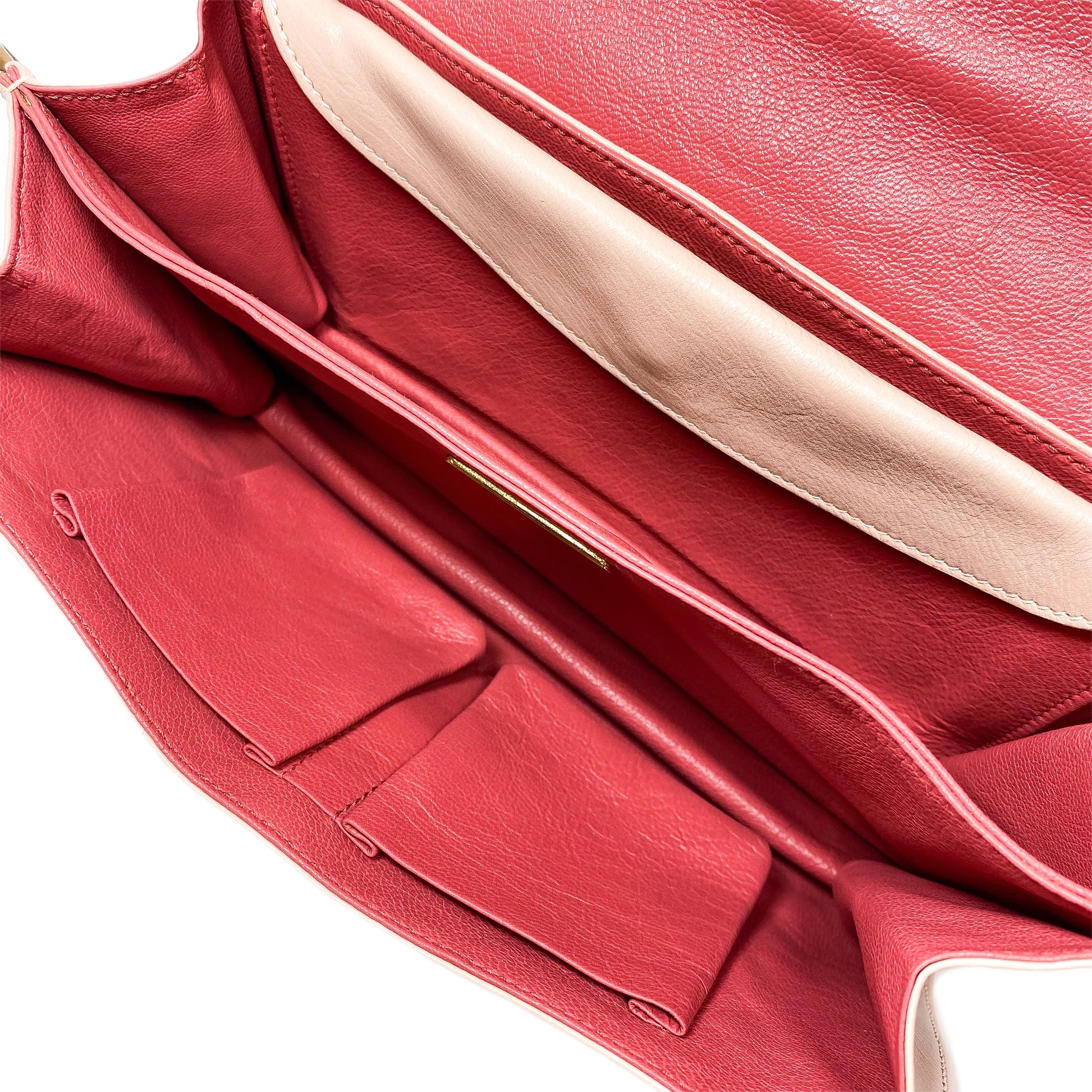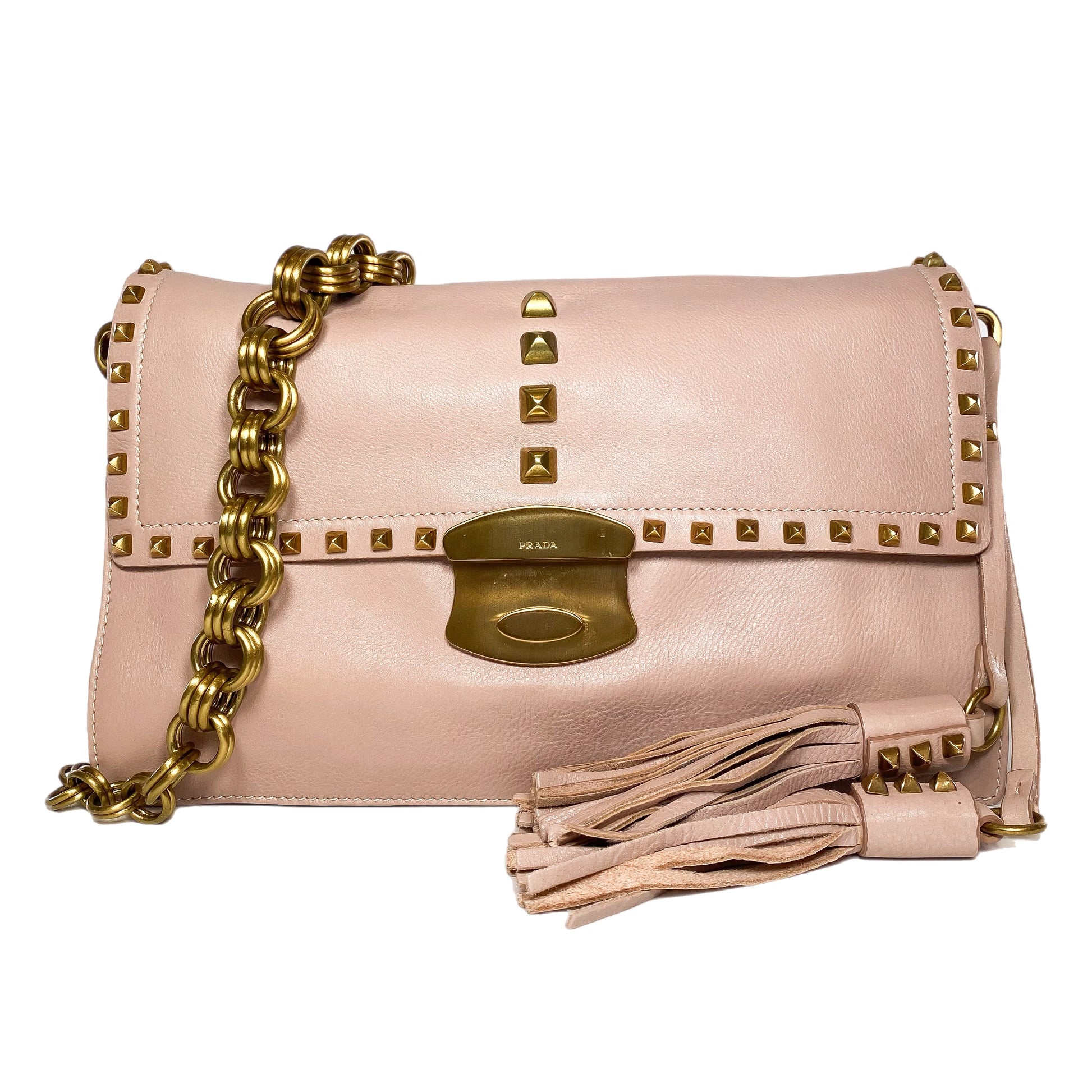 This is a Prada Studded Chain Strap Shoulder Bag in blush colored leather with gold hardware. This stylish shoulder bag features an 8-inch gold chain shoulder strap, studded detailing, and leather tassels. A push closure opens the front flap to a coral leather lined interior that features two main compartments, two patch pockets, and a snap pocket. This is an amazing everyday handbag!