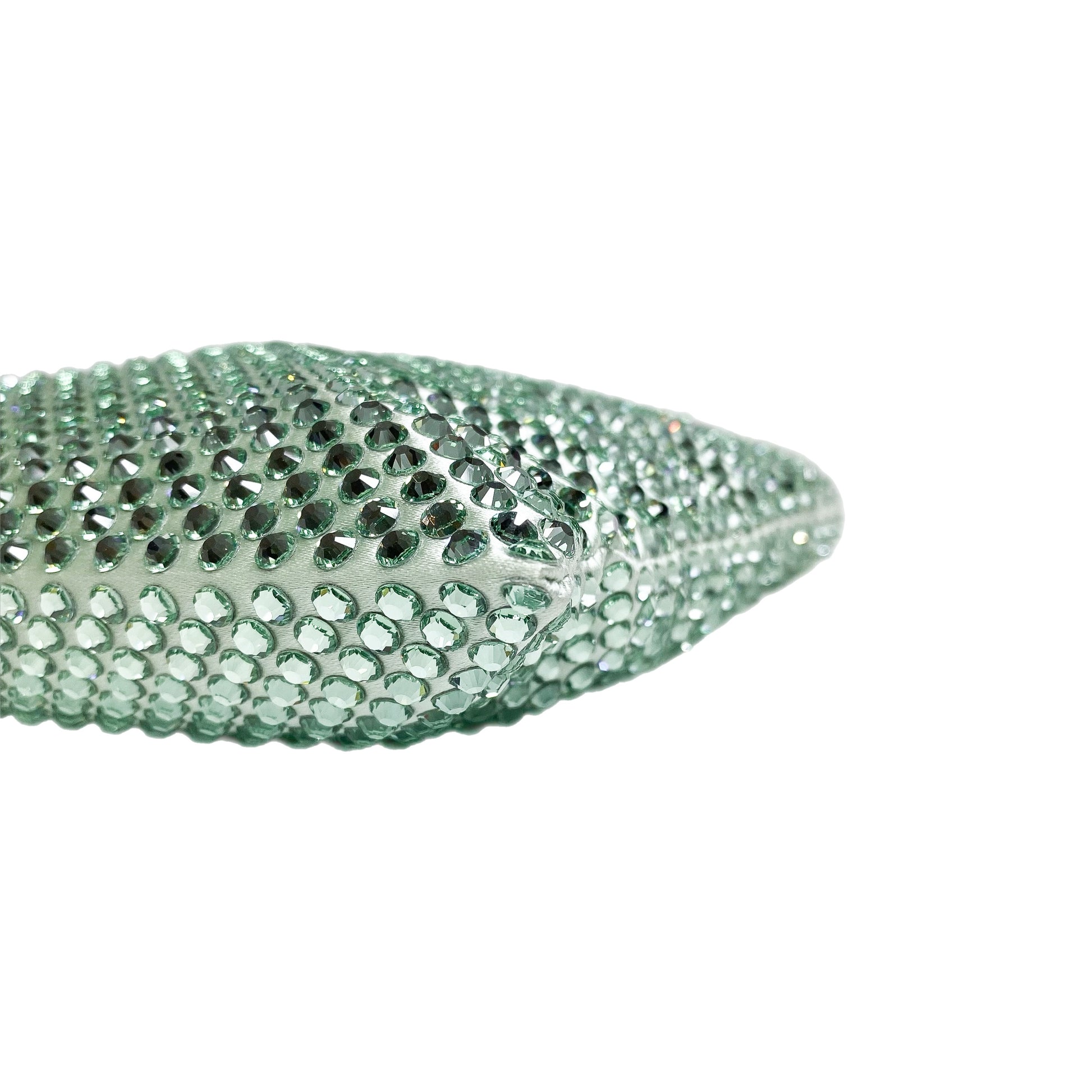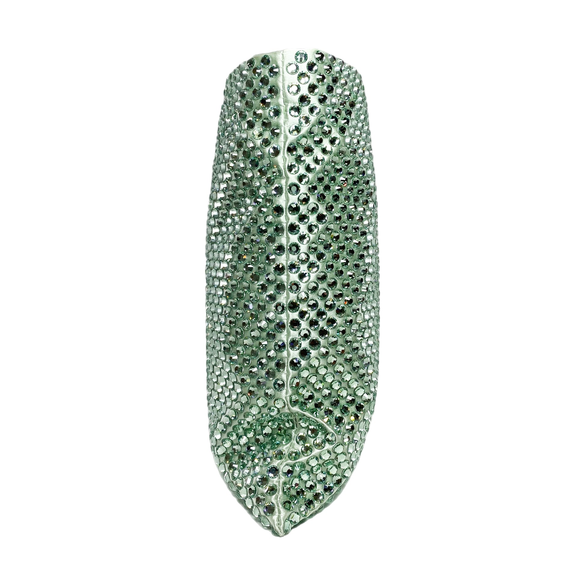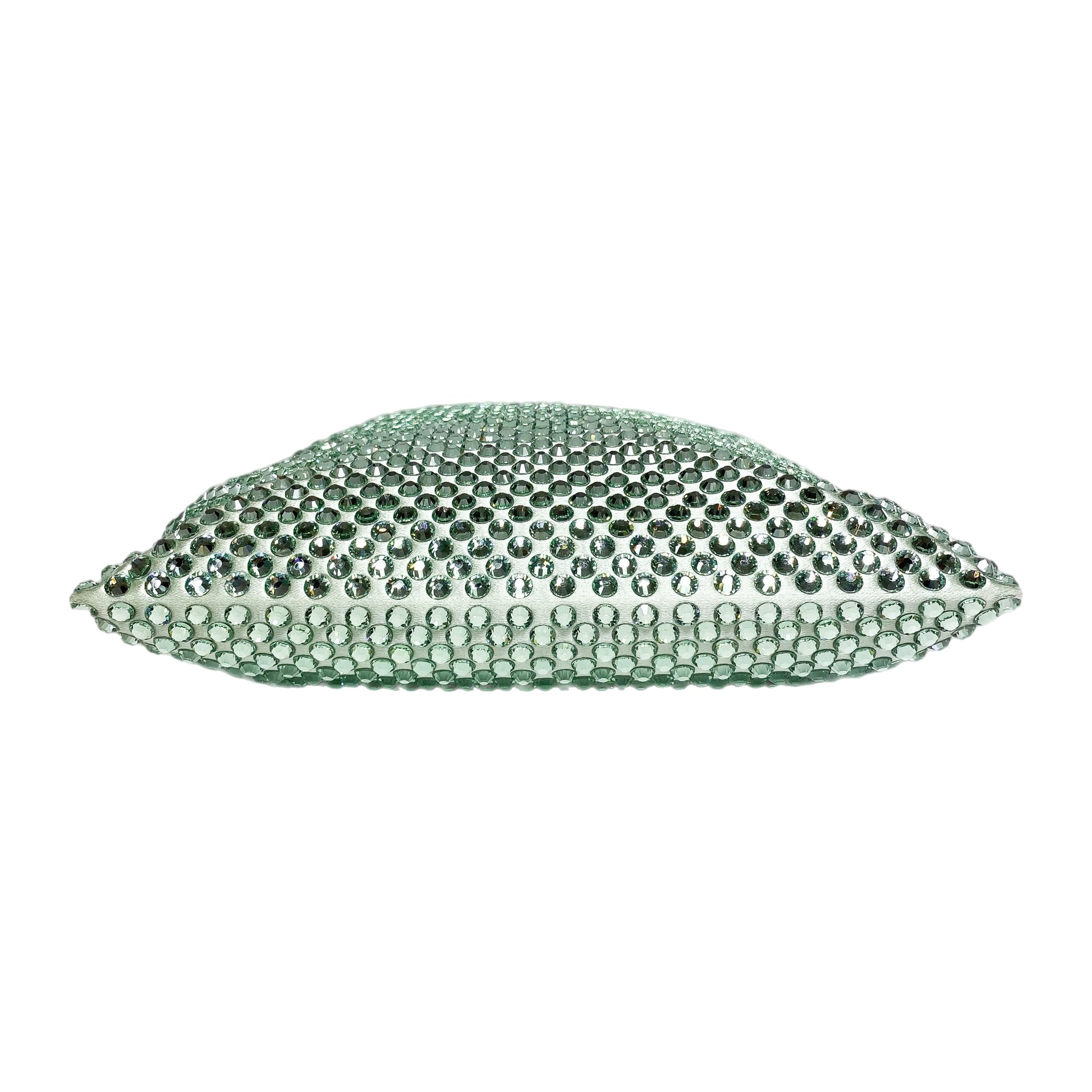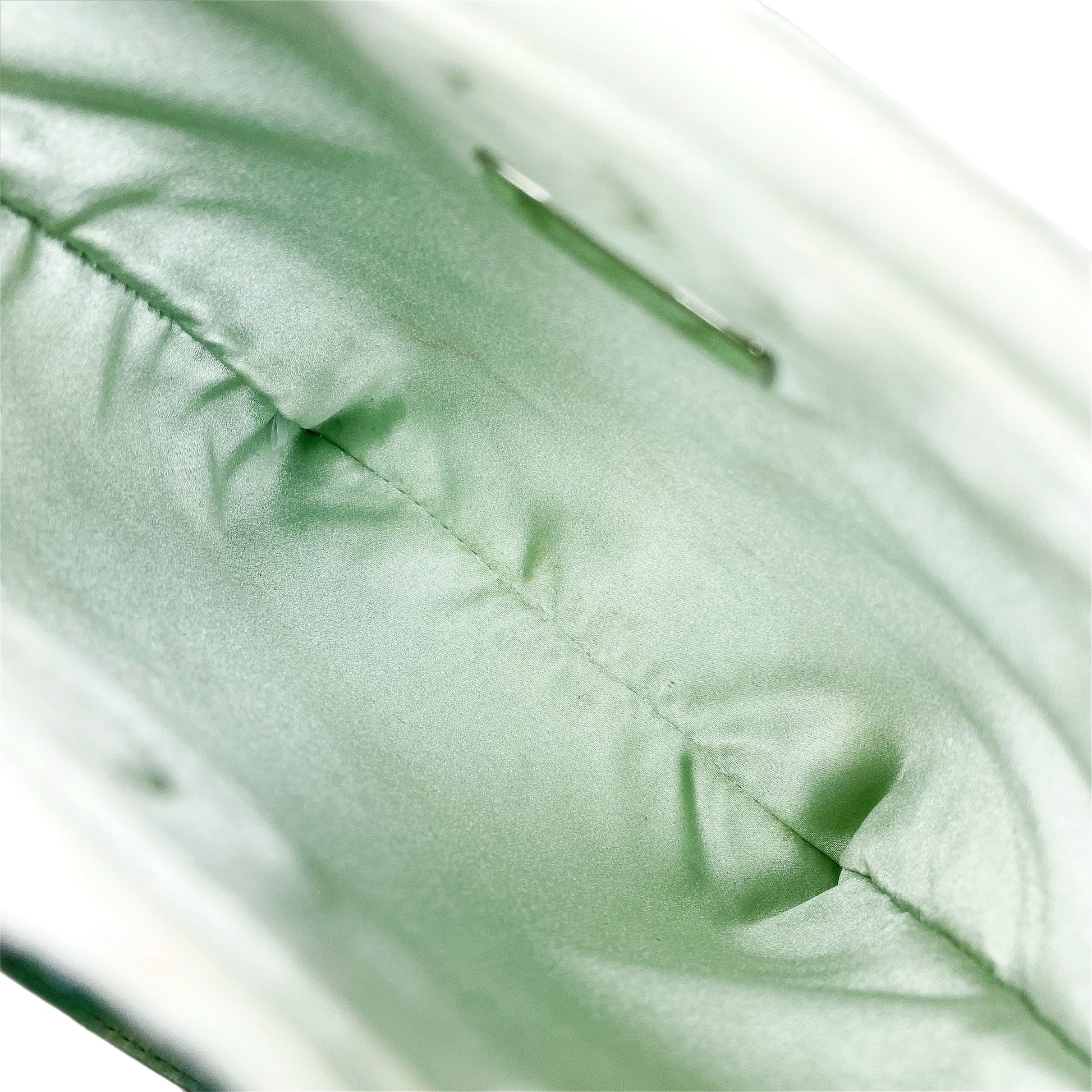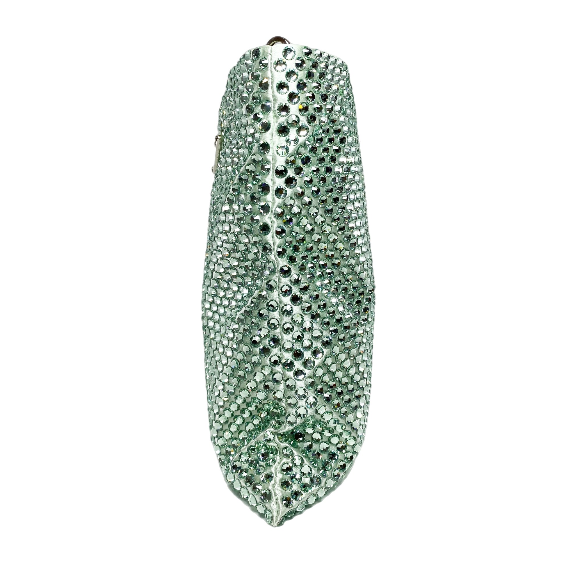 This is a Prada Green Metal Triangle Logo Chain Crossbody in crystal embellished satin with silver hardware. This stylish crossbody features two adjustable 5.5-inch handles, a 21.5-inch detachable chain strap, and the Prada logo on the front. The top is open to a green satin lined interior. This is a wonderful handbag for any occasion!