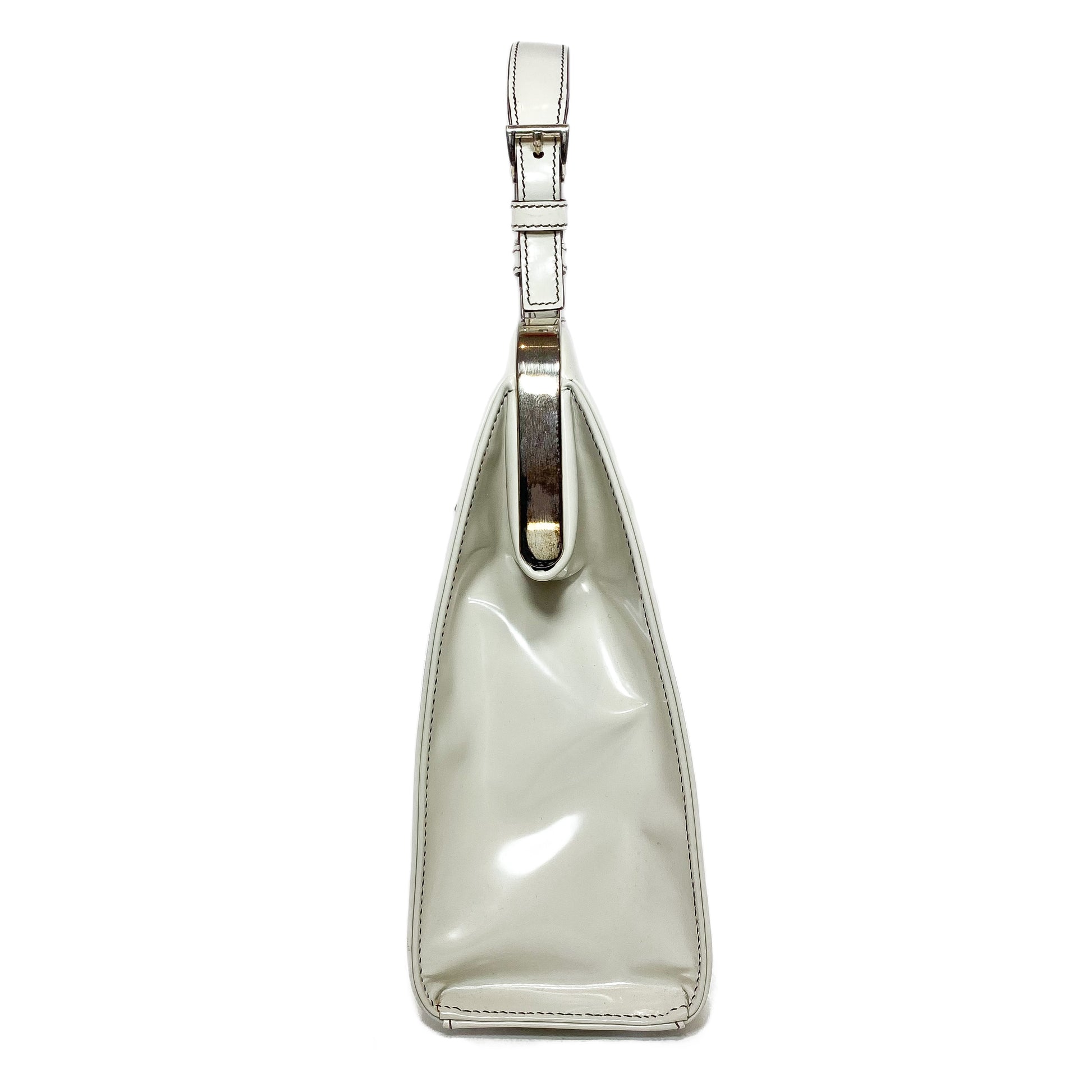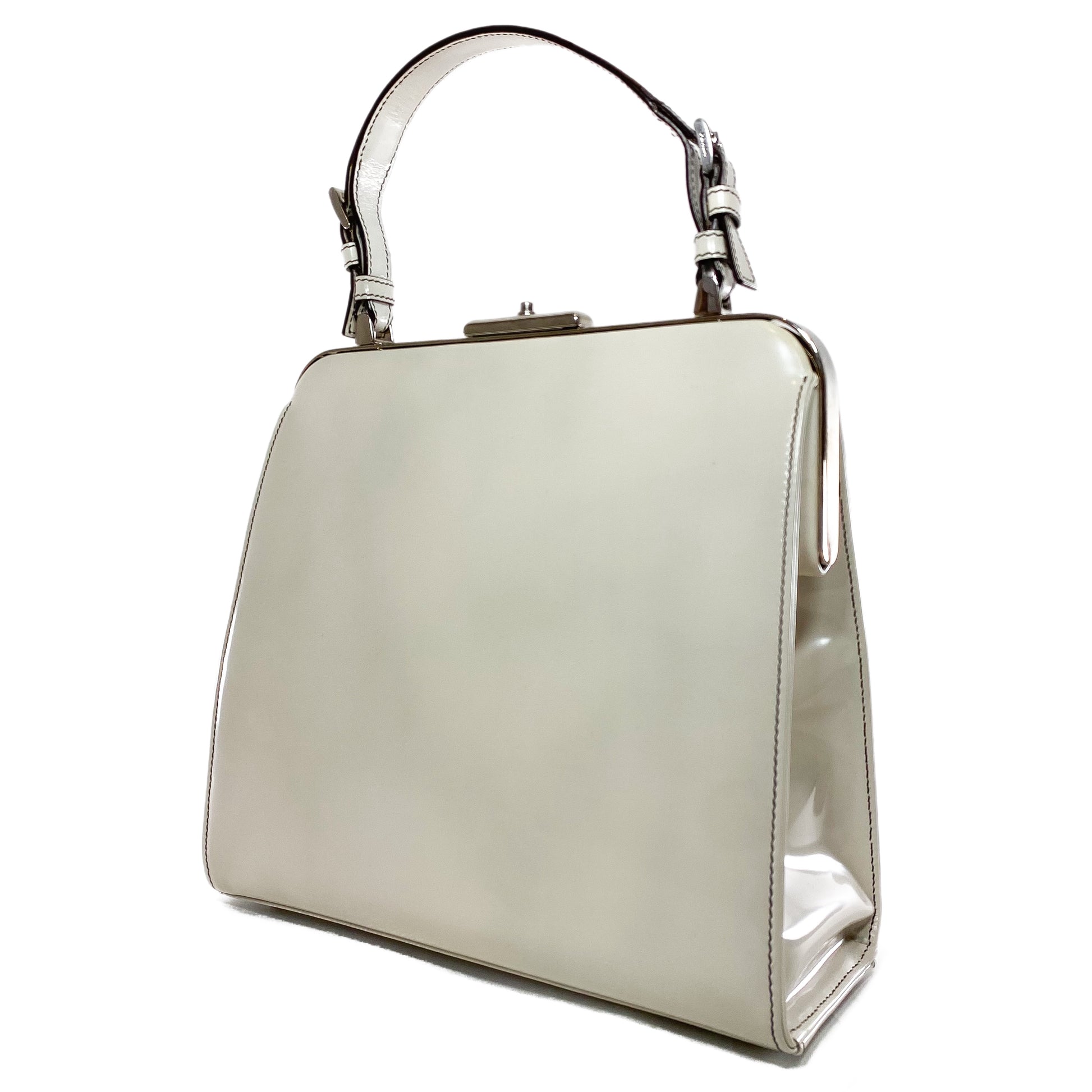 This is a Prada Quarzo Spazzolato Logo Frame Bag in patent leather with silver hardware. This chic bag features an adjustable 5-inch top handle, a hanging key charm, and an embossed Prada logo. A click-snap closure opens the handbag to Quarzo leather interior that features two patch pockets and a snap pocket. This is a stellar Prada bag to add to any handbag collection!