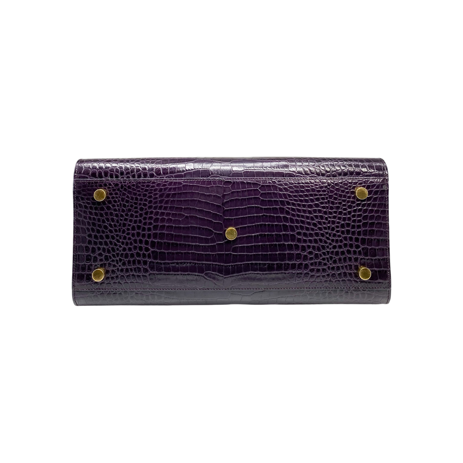 This is a Saint Laurent Small Sac de Jour in prune crocodile-embossed calfskin leather with gold hardware. This elegant handbag features accordion sides, dual top handles, a detachable shoulder strap, and signature padlock in a leather clochette. The interior is lined in leather and includes a zipper compartment for daily essentials. The deep prune shade is a refined twist on classic burgundy, ideal for fall.