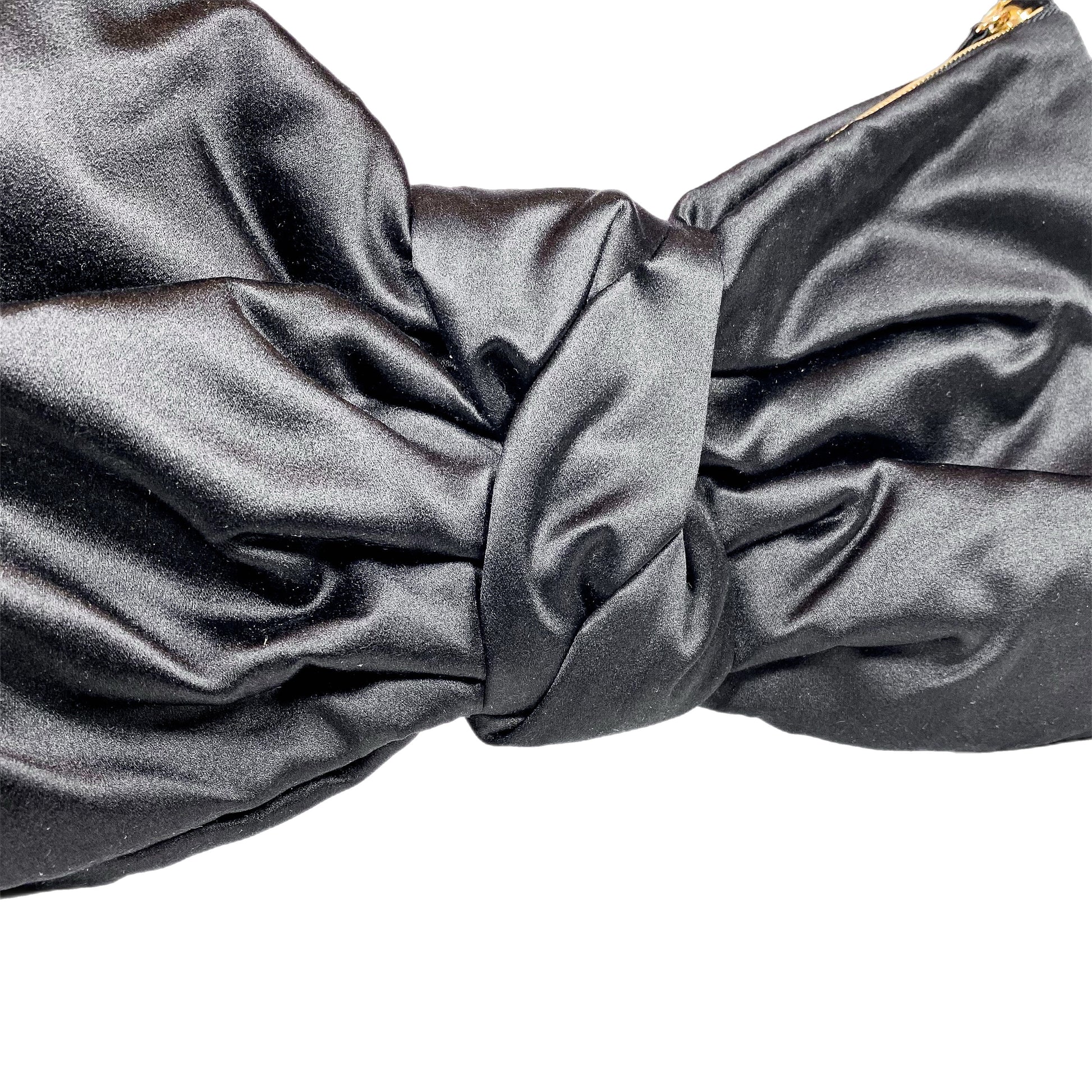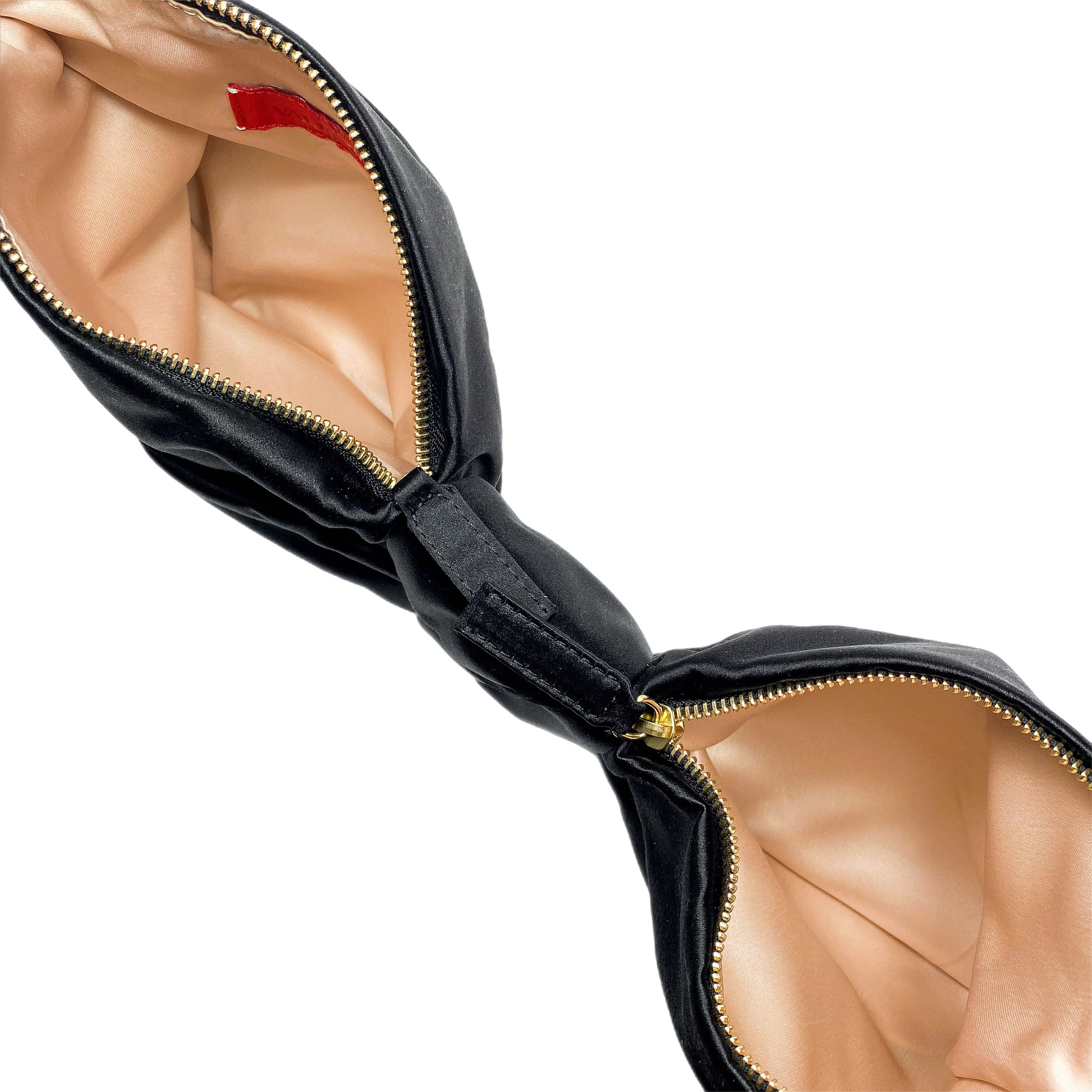 This is a Valentino Black Bow Clutch with Strap in satin with gold hardware. This chic clutch features a 22-inch adjustable and detachable strap and two zipper compartments. This is a stellar clutch for any evening occasions!