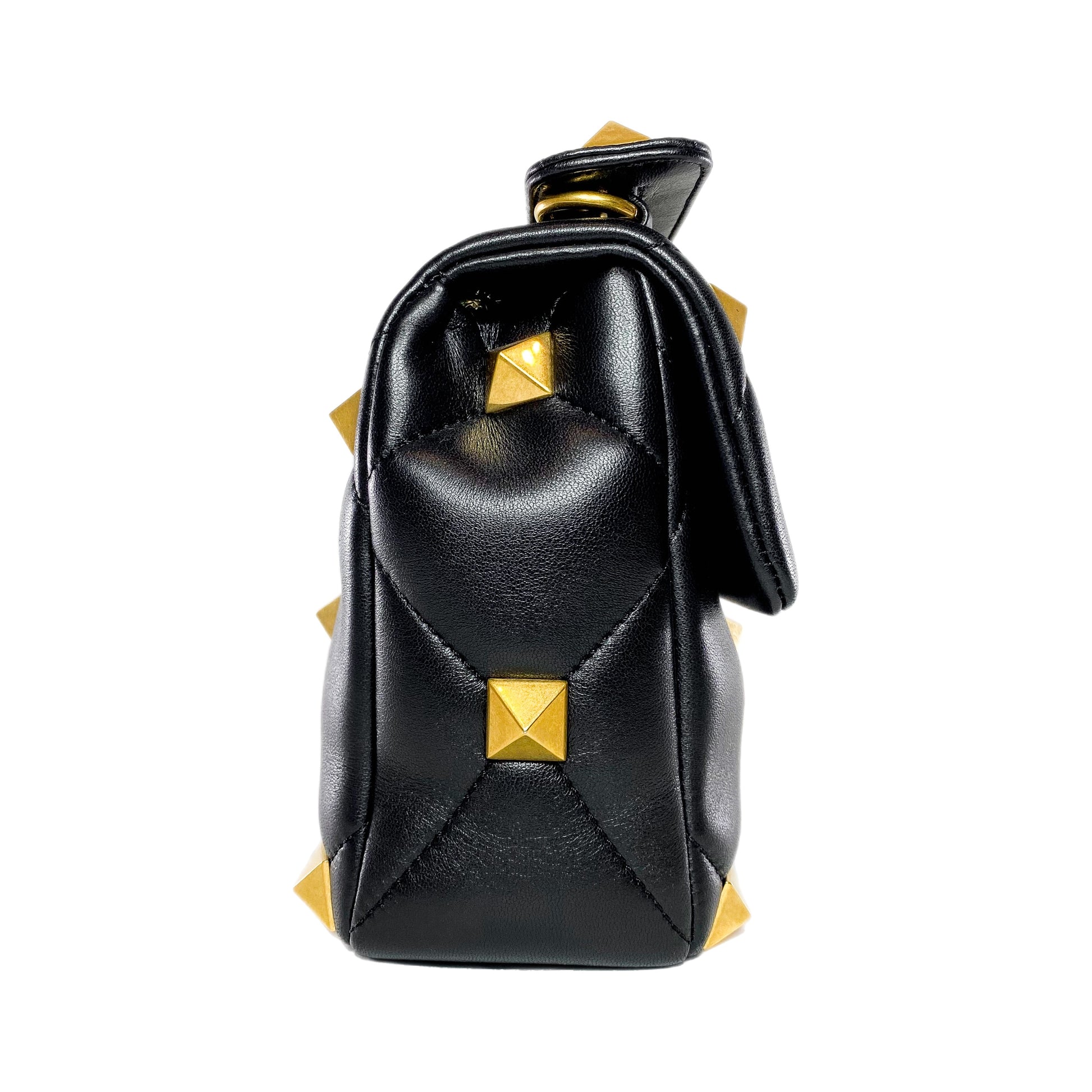 This is a Valentino Large Black Roman Stud Flap Bag in nappa leather with gold hardware. This stylish flap bag features a 4-inch top handle, a 19-inch detachable gold chain strap, pyramid stud details, and a gold turn lock closure. The front flap of the handbag opens to a black leather lined interior that features two patch pockets and a zipper pocket. This is a fantastic handbag for everyday use!