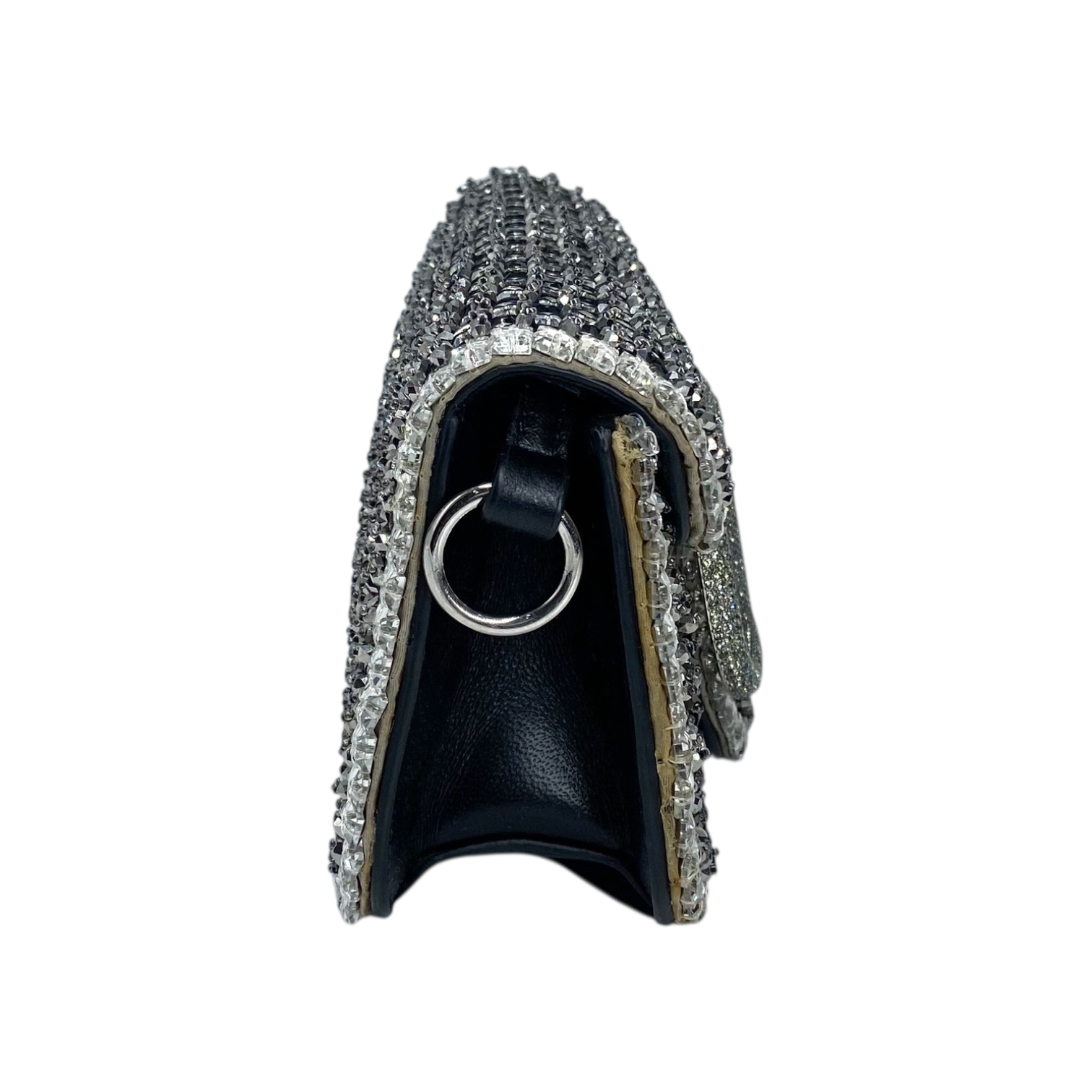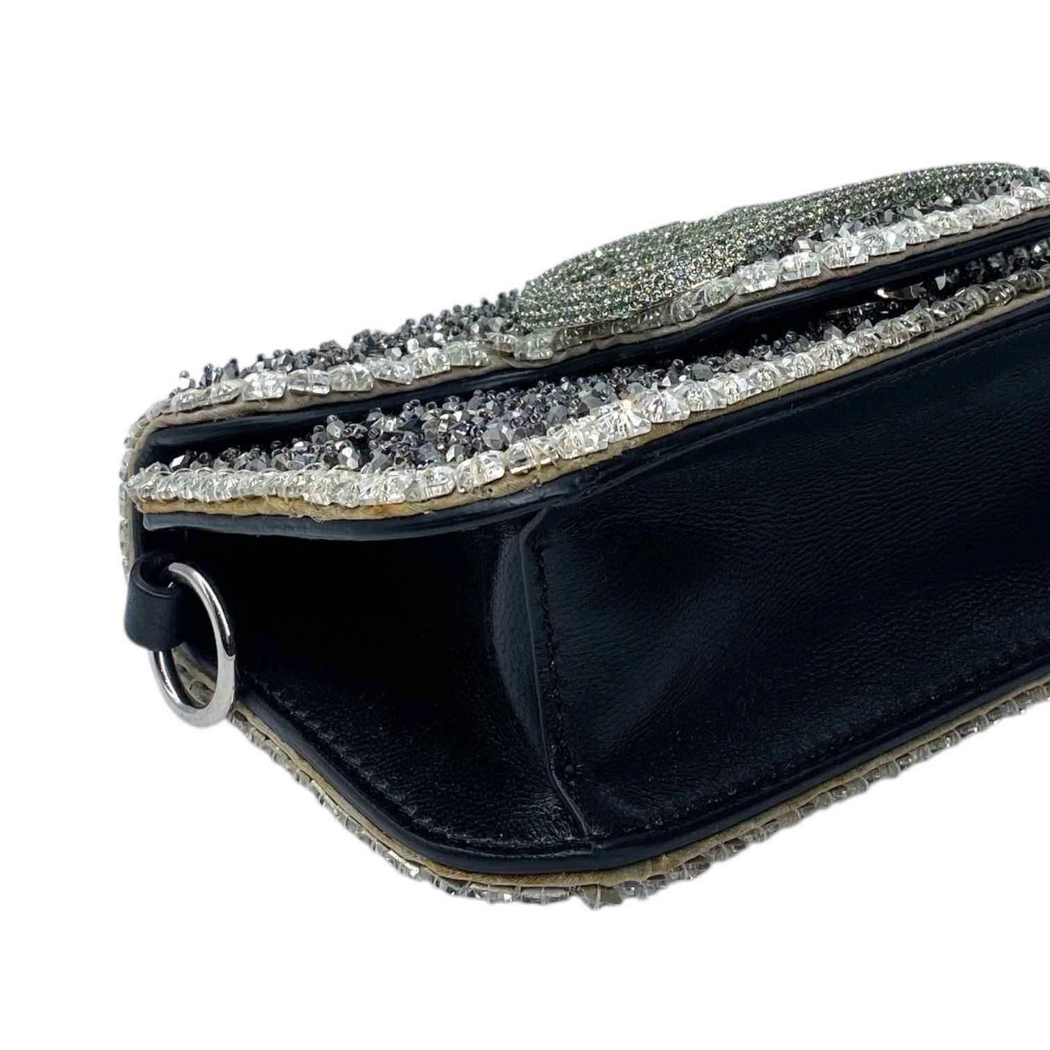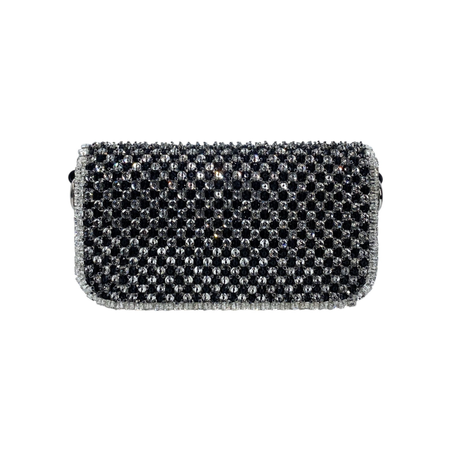 This is a Valentino Loco Small Polka Dot Embellished Bag featuring black and clear crystals and sequins. This handbag has a removable top handle to be worn as a clutch, and a removable crossbody strap that makes this bag versatile. This is a stunning bag to add to your collection!