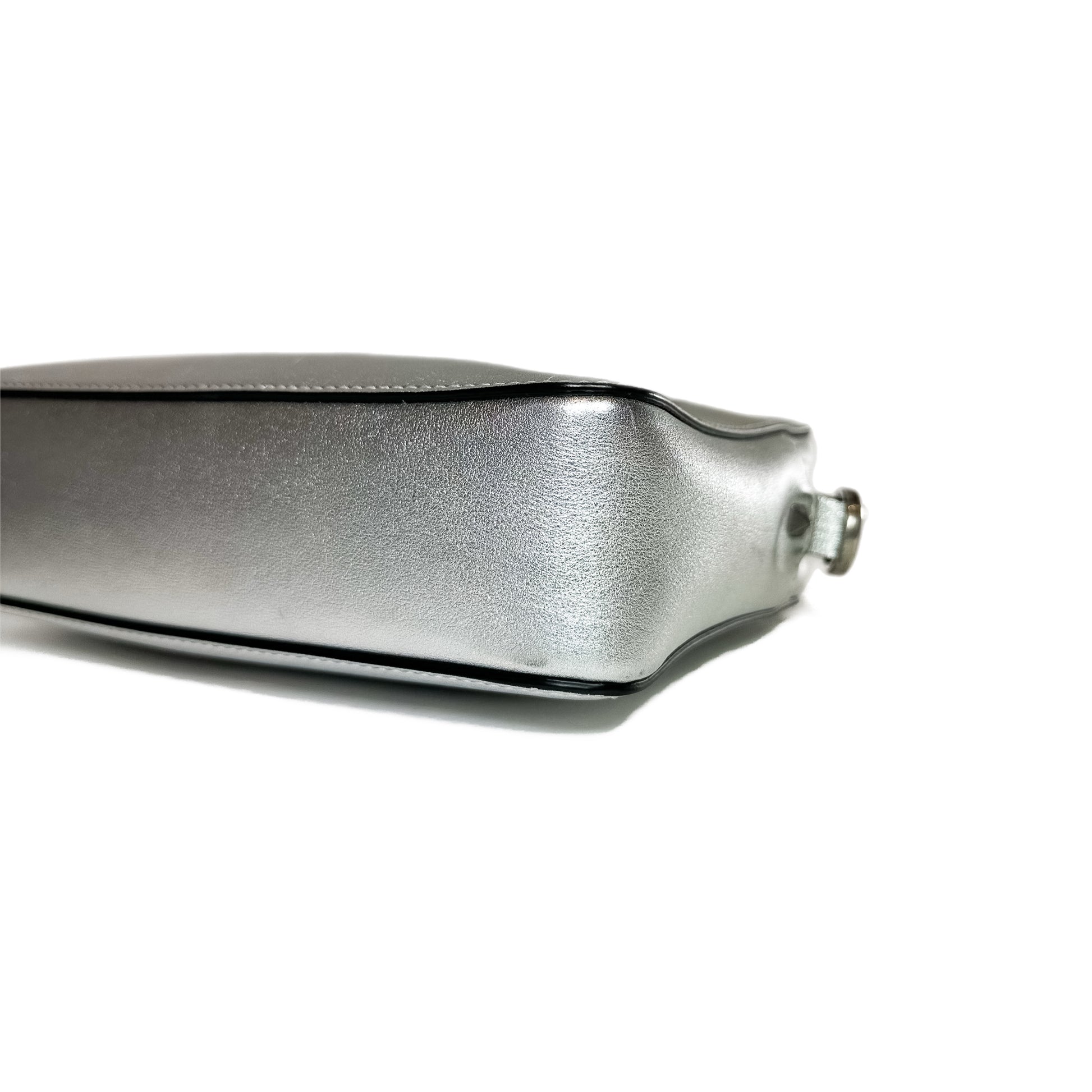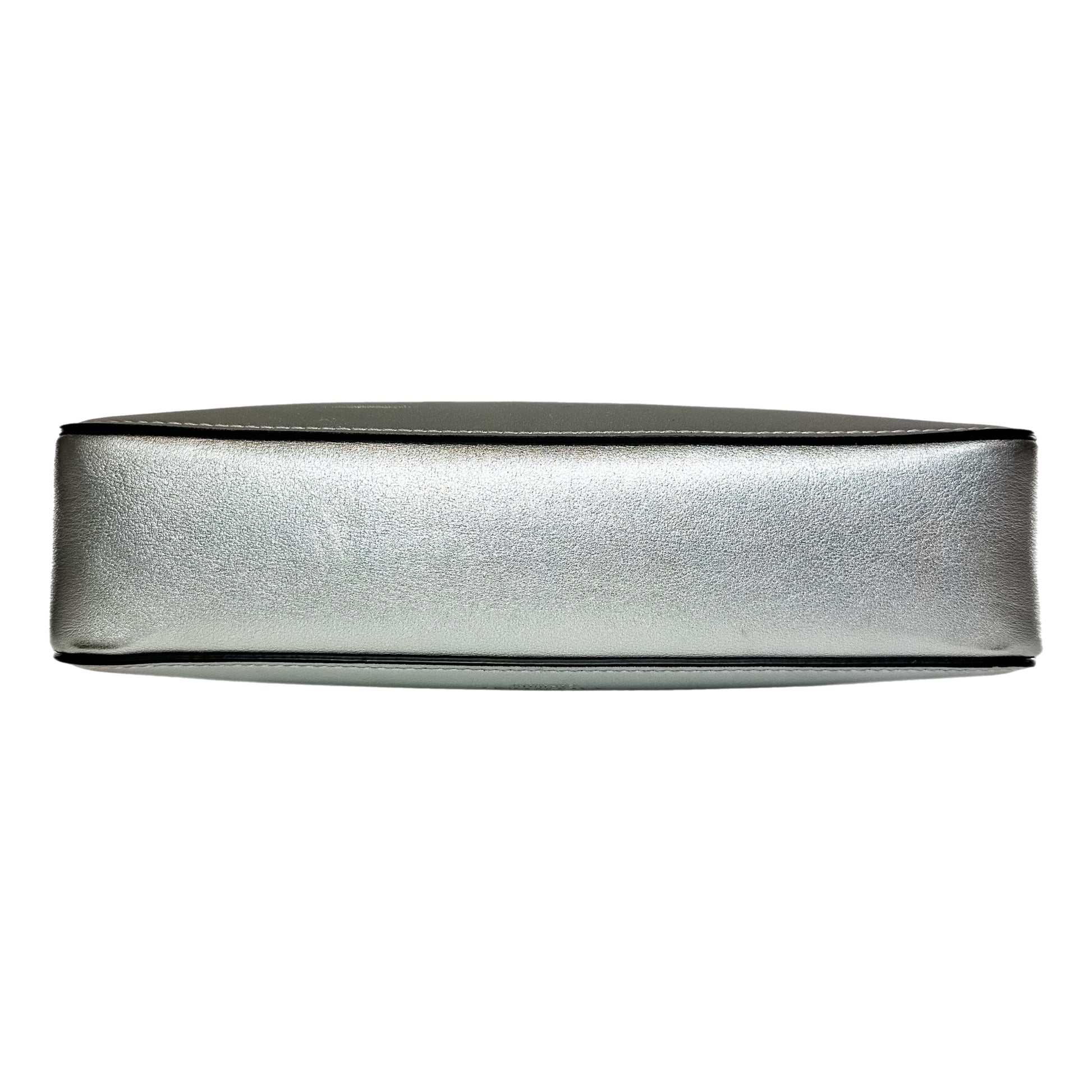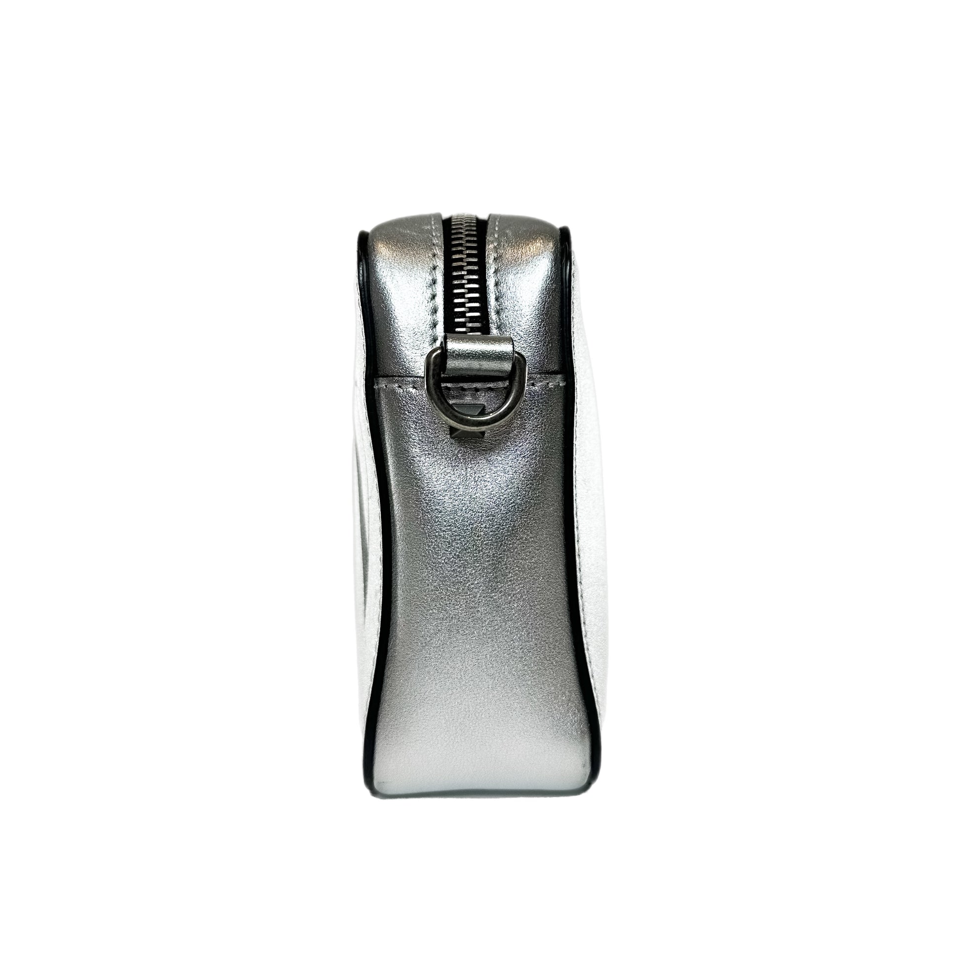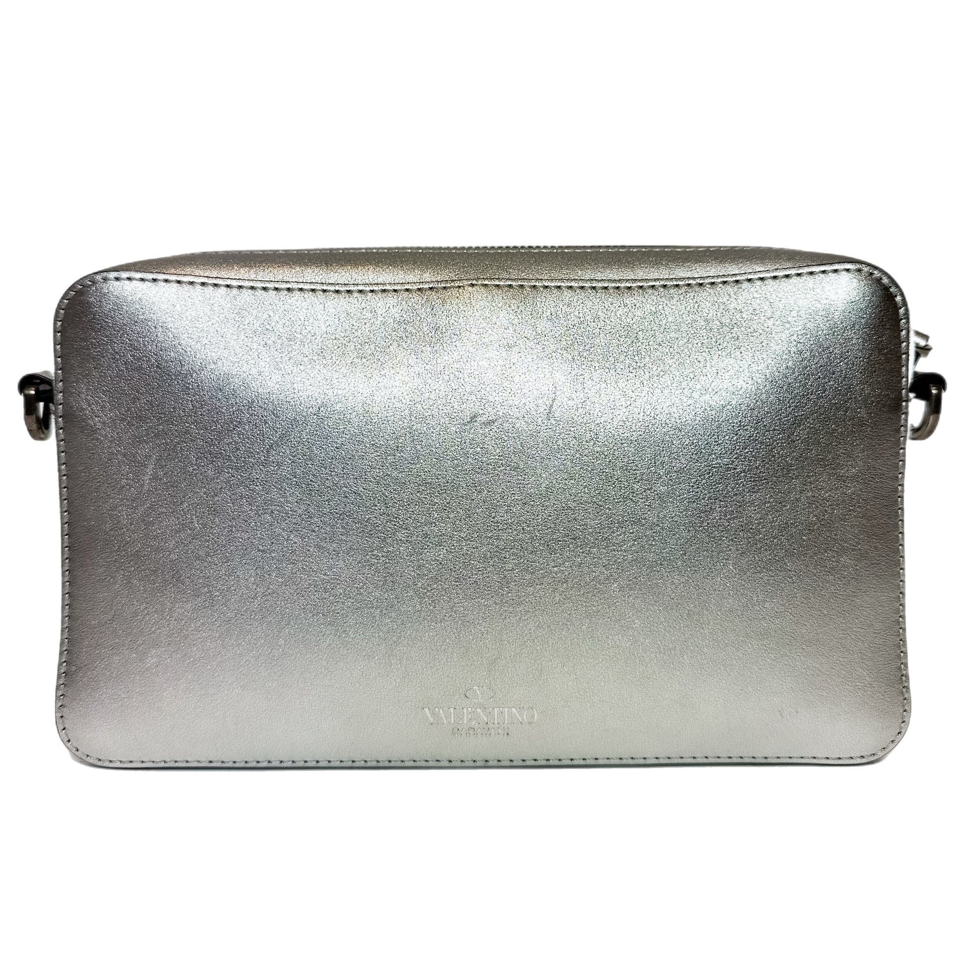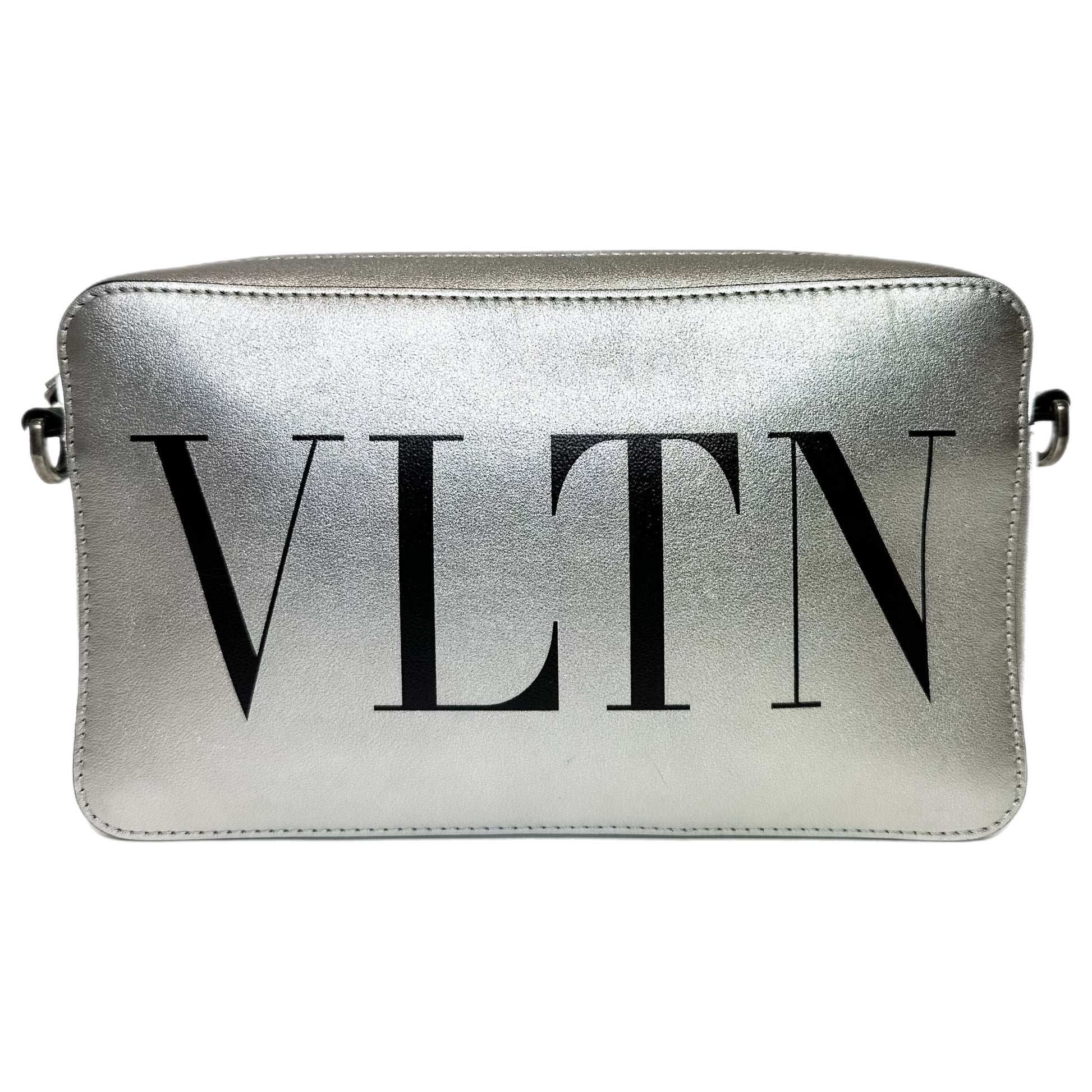 This is a Valentino Silver VLTN Crossbody Bag in calfskin leather with silver hardware. This stylish handbag features a 13-inch adjustable and detachable strap and VLTN written on the front. A top zipper opens to a black suede lined interior. This is a wonderful handbag for many occasions!